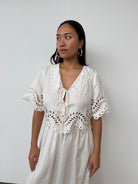 Regular fit, collared, V-neck, short sleeves, ties at the front, broderie anglaise detail, cropped.