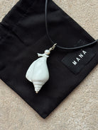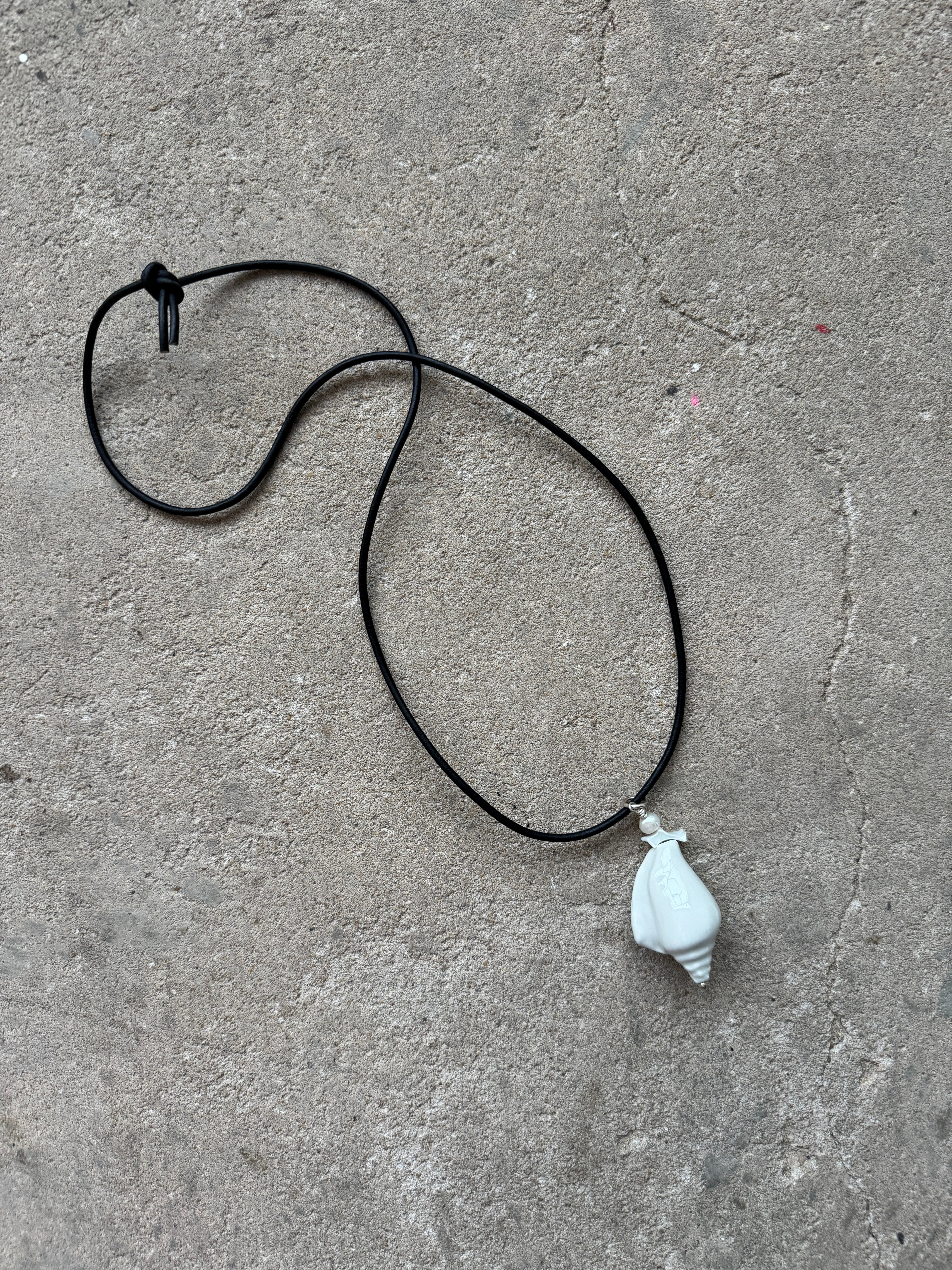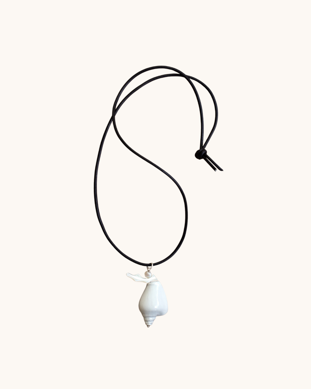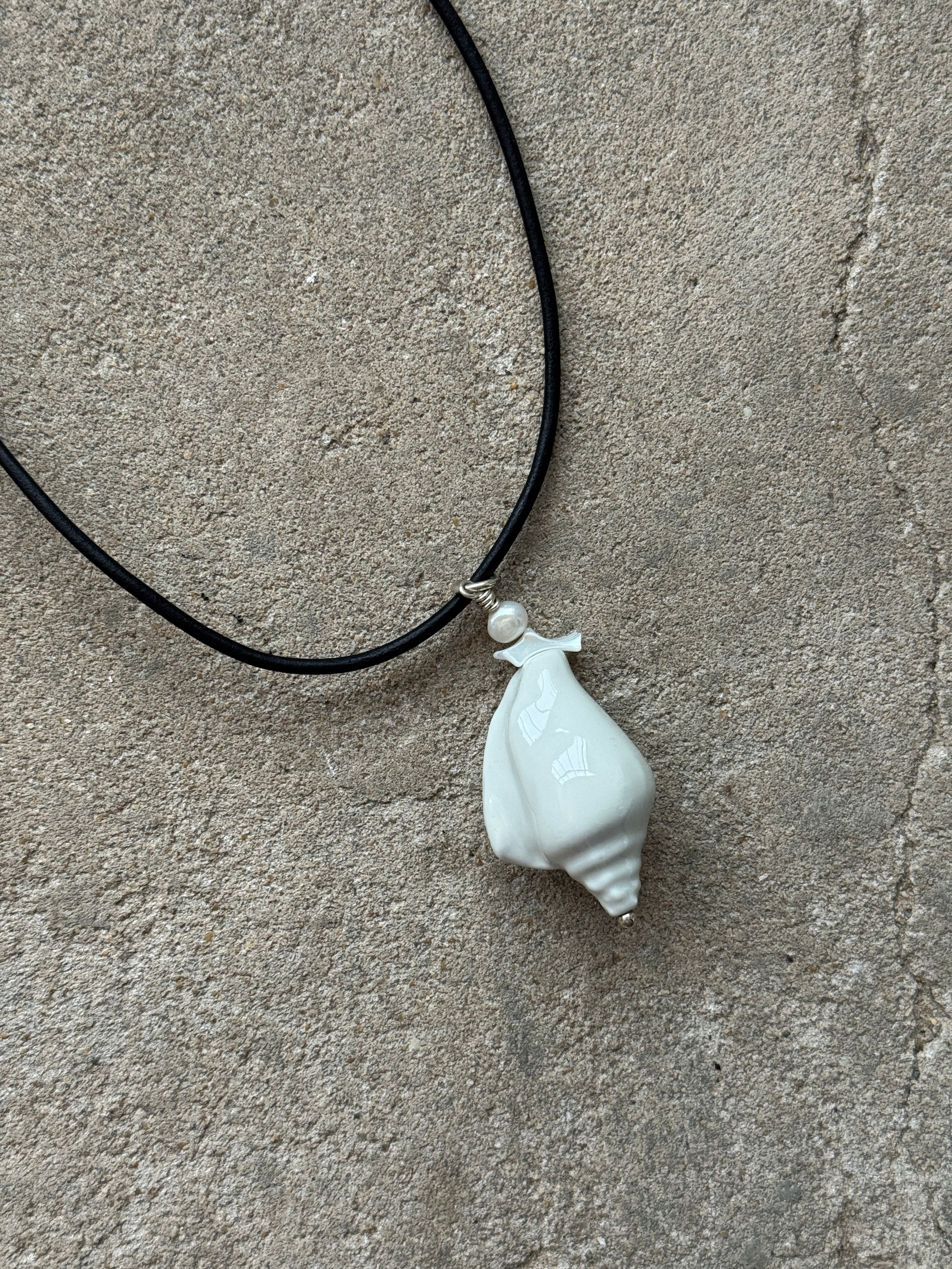 "In search of patterns, symbols and meaning; the delicate elegance of nature meets with timelessness, a hand-picked shell turned into porcelain, topped with a mother of pearl bead and a single fresh water pearl. Strung on an adjustable black leather cord.