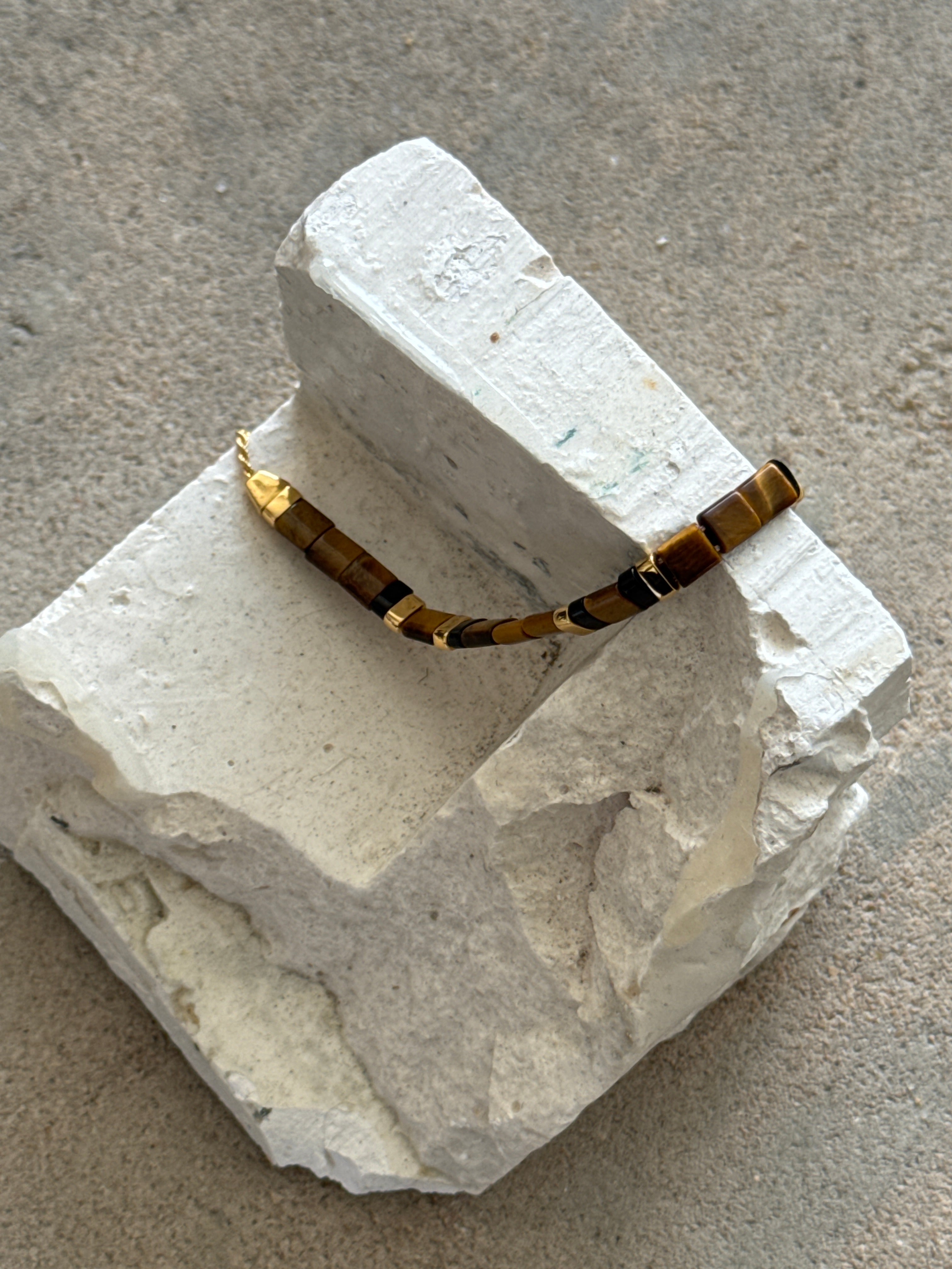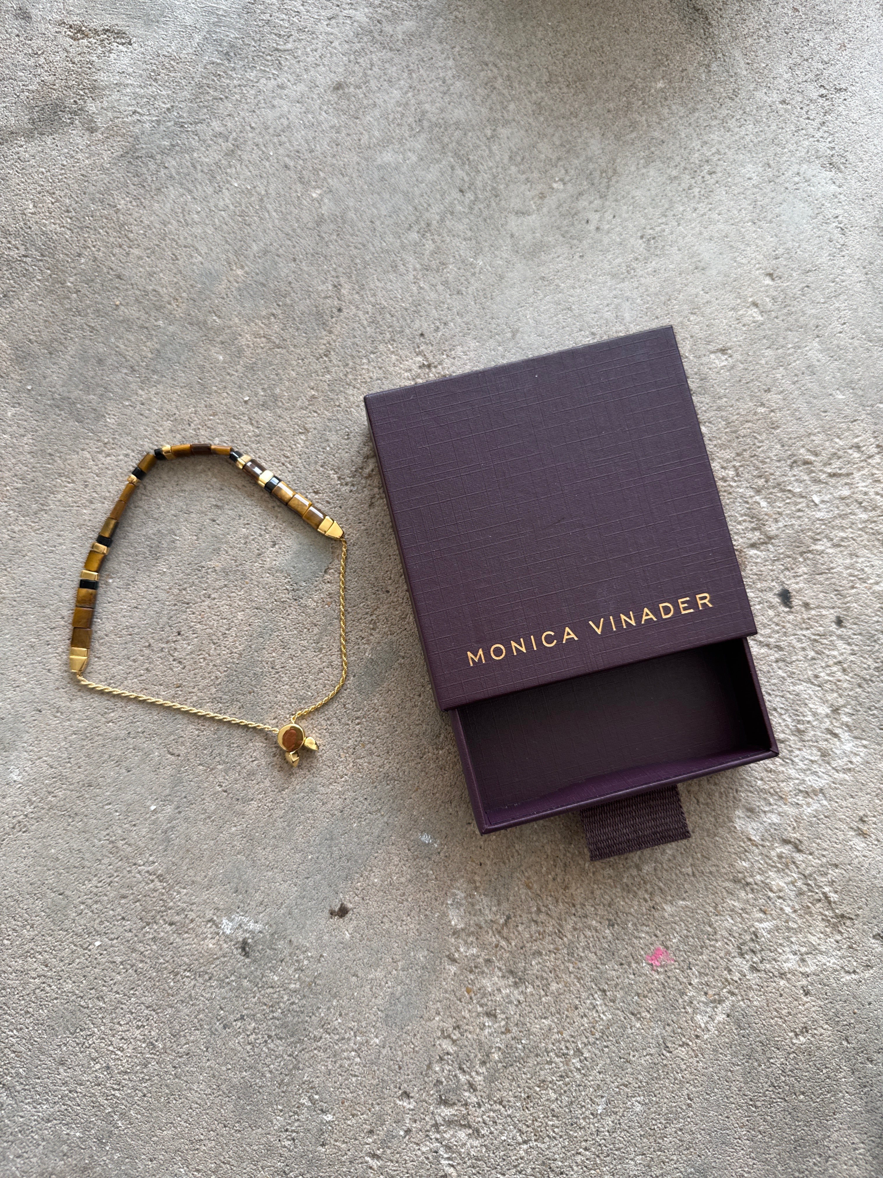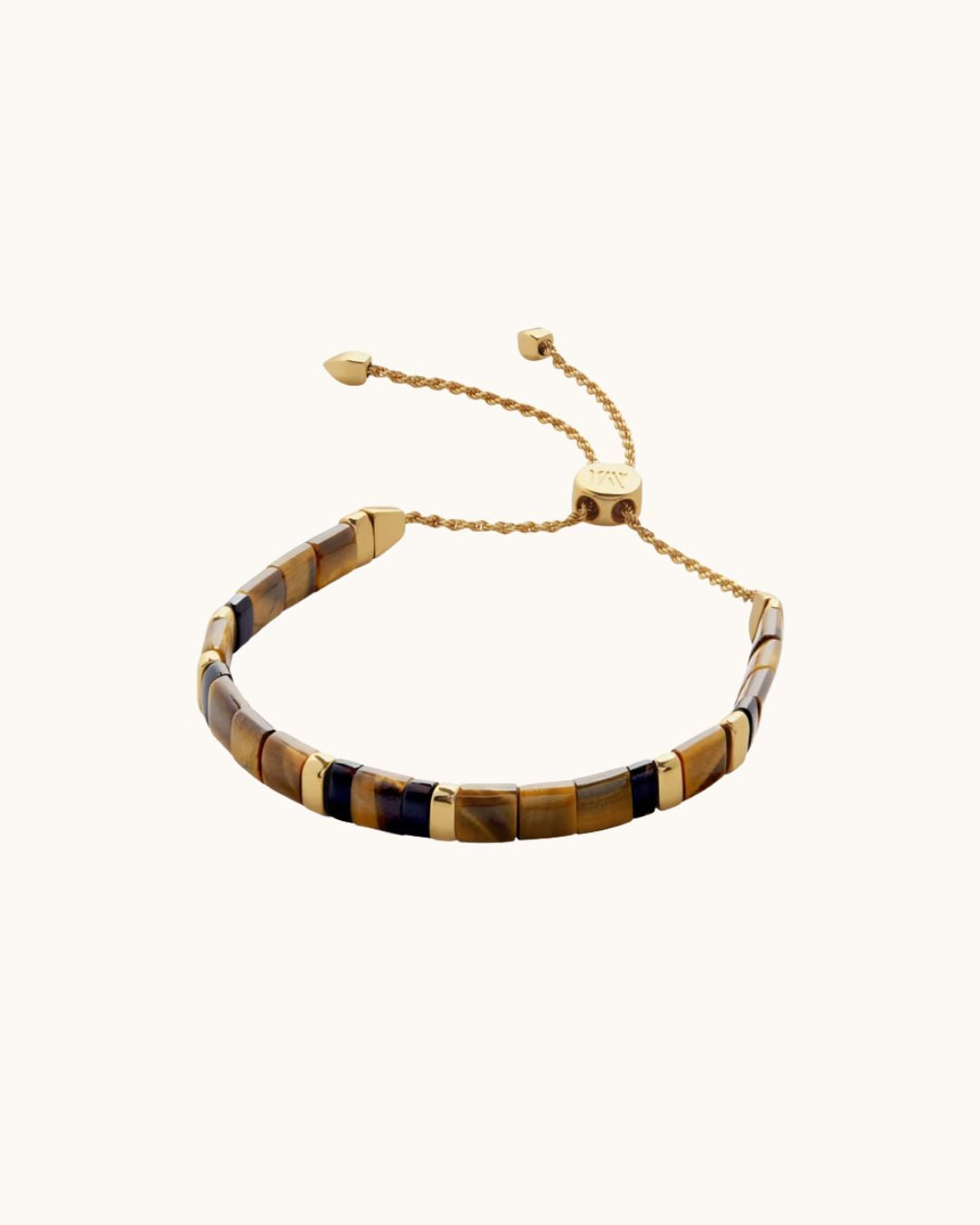 "A fresh take on the friendship bracelet, this bracelet is hand-strung with natural tiger's eye beads, plus accents of black onyx and gold vermeil. The branded toggle slider ensures your perfect fit"