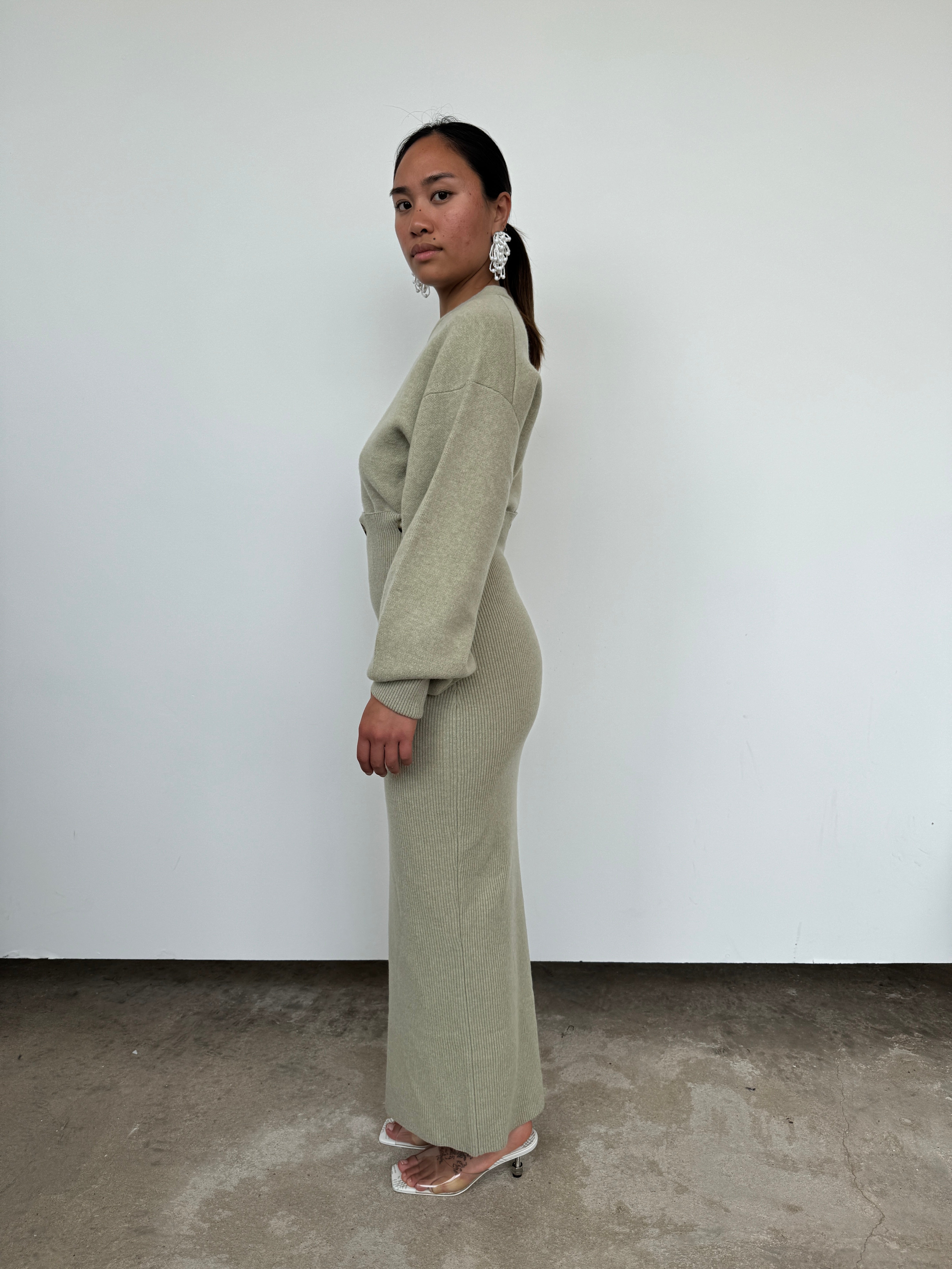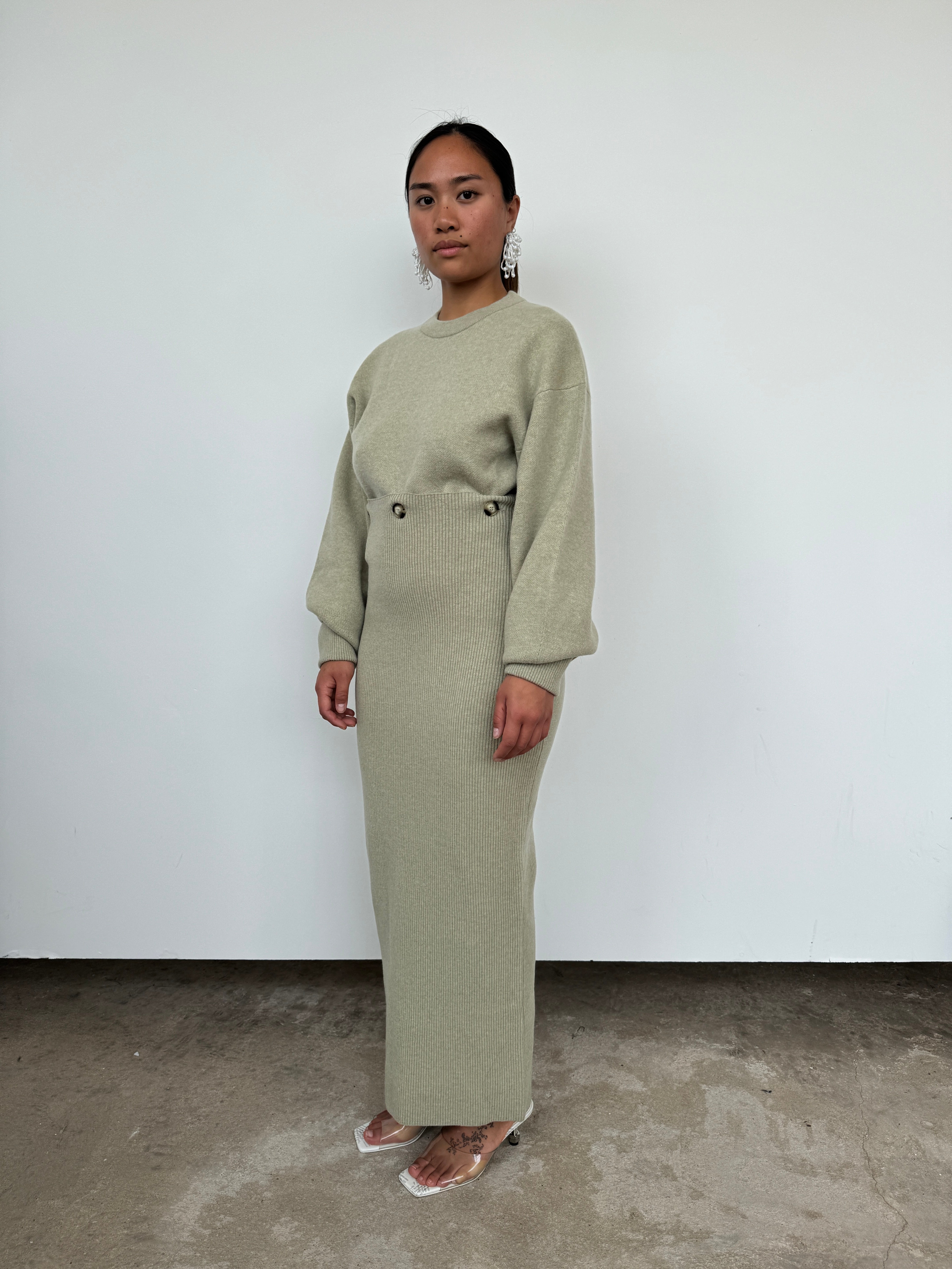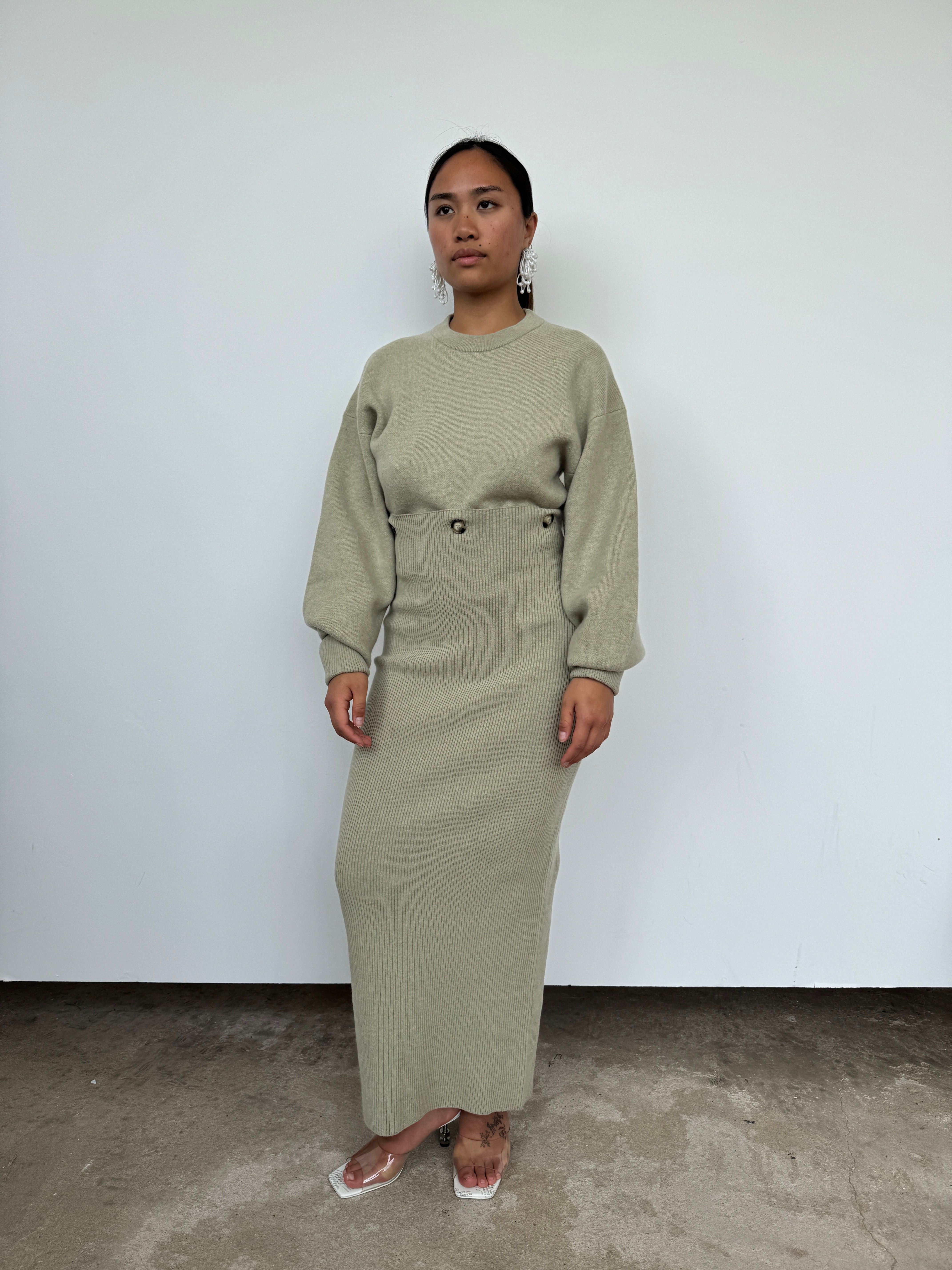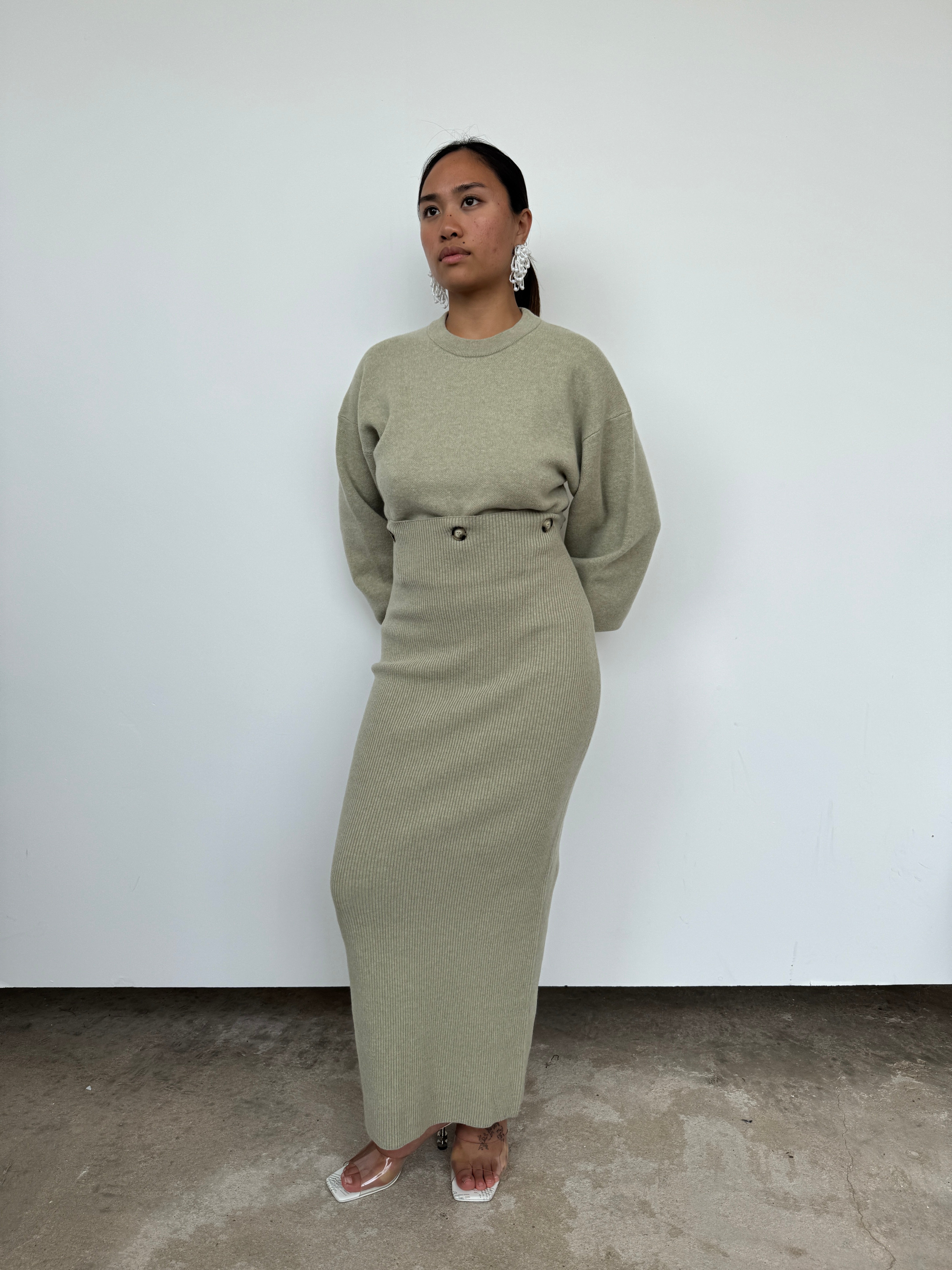 This piece has a knitted construction, drop shoulder and long sleeves with ribbed turn-up cuffs. It has a modular button-fastening waist and the top can be separated from the skirt