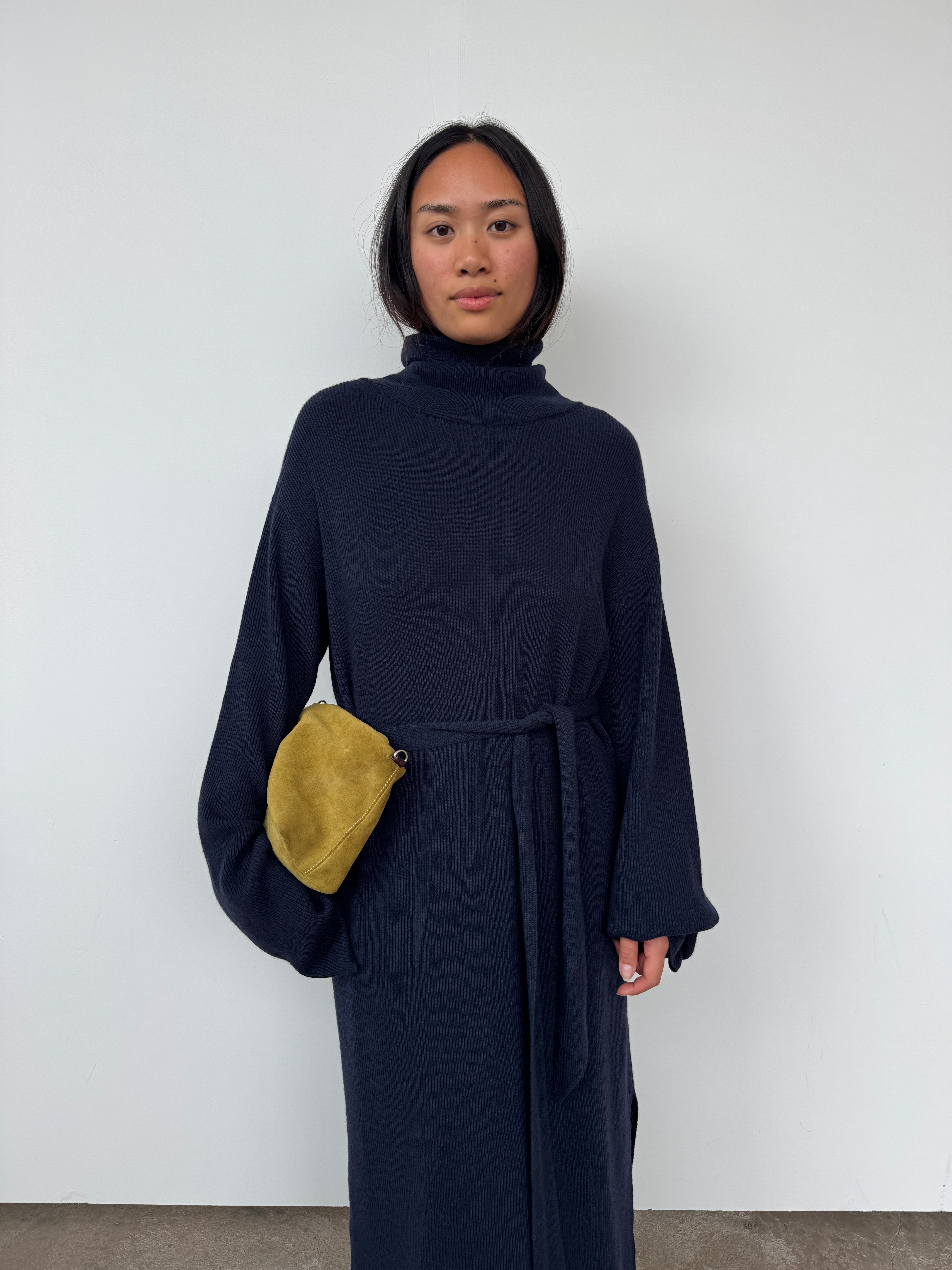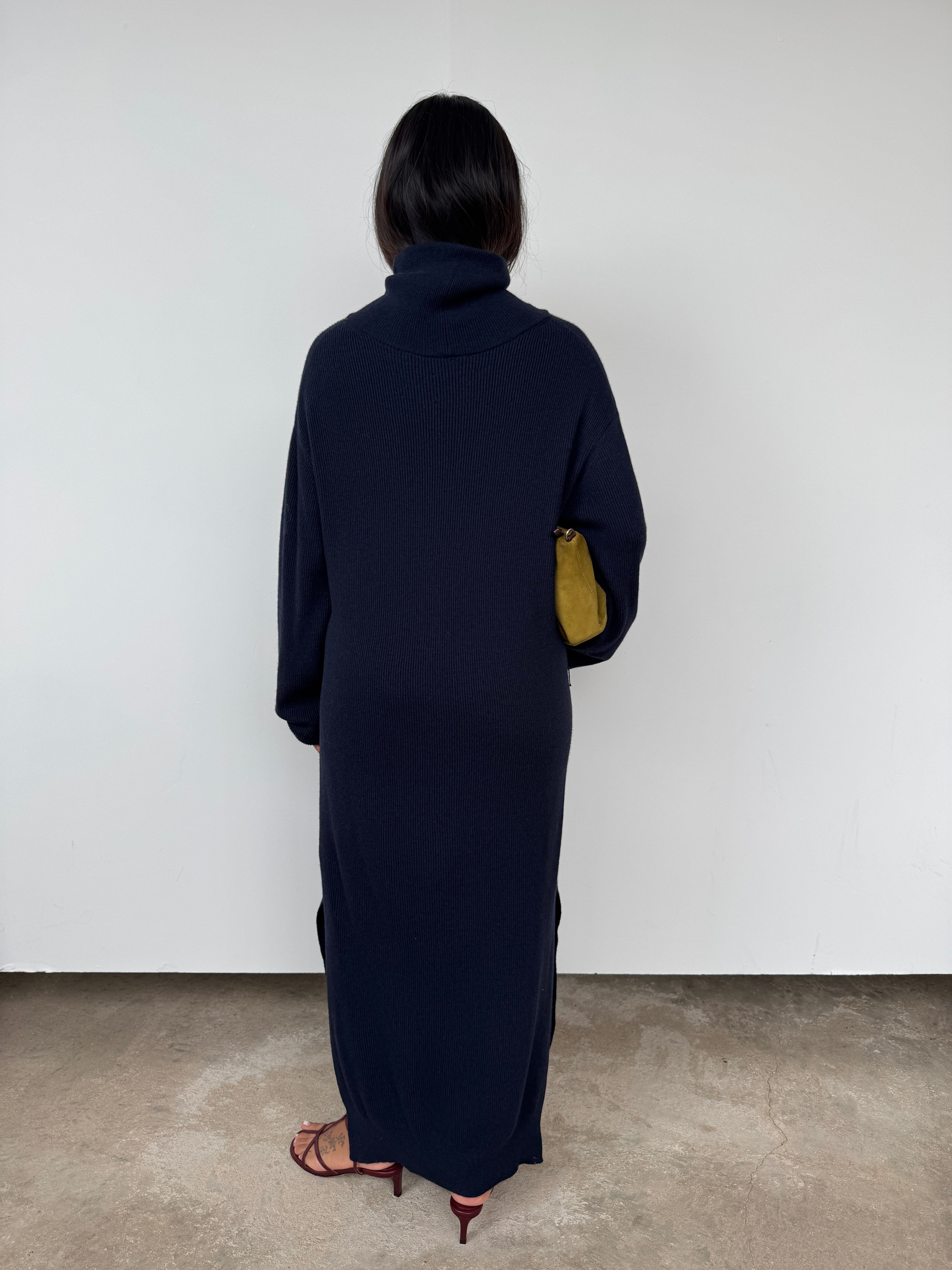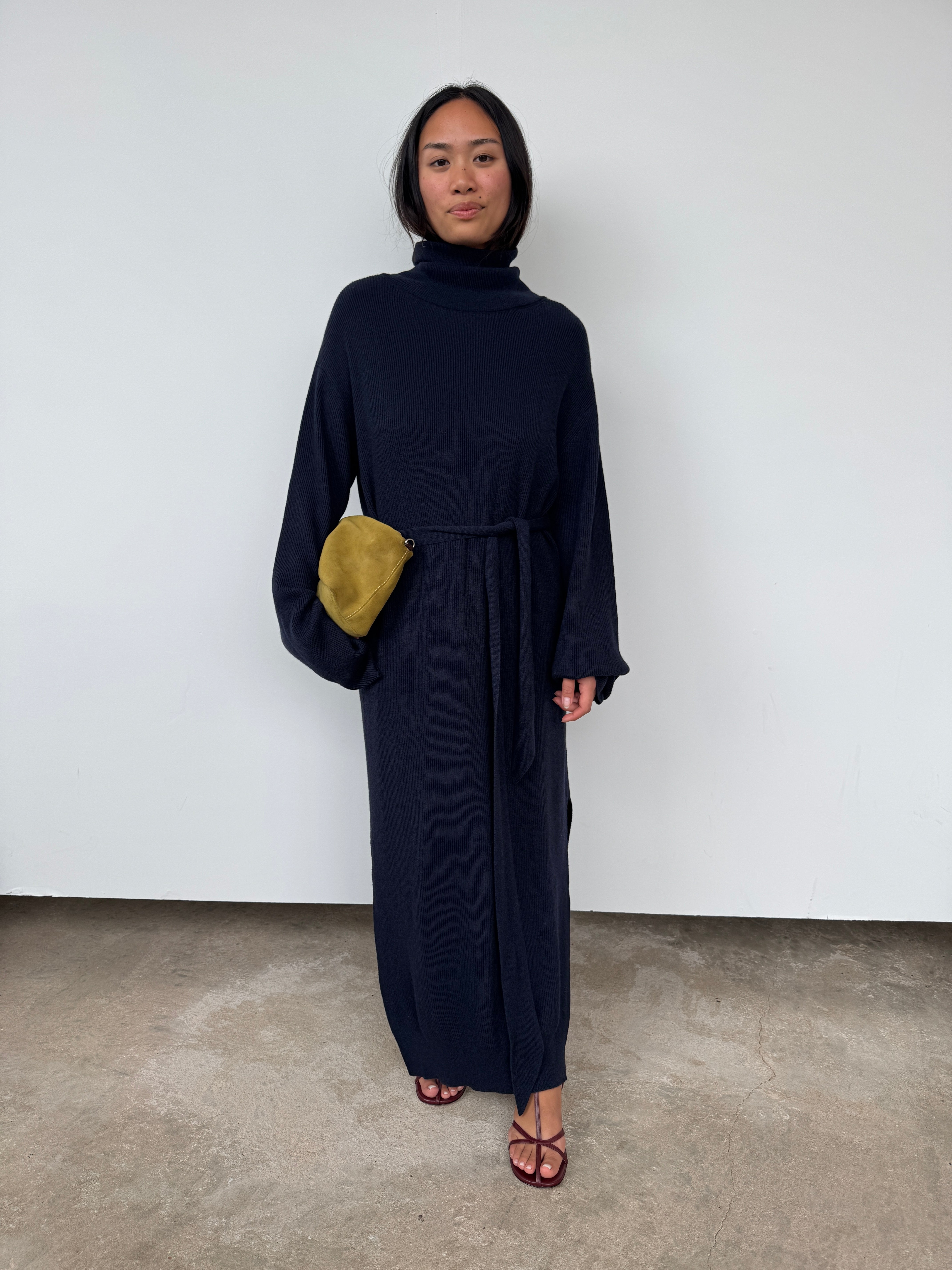 Long sleeve rib knit viscose and wool-blend mid-length dress with a turtleneck collar. Detachable self-tie fastening at waist. Vented side-seams.