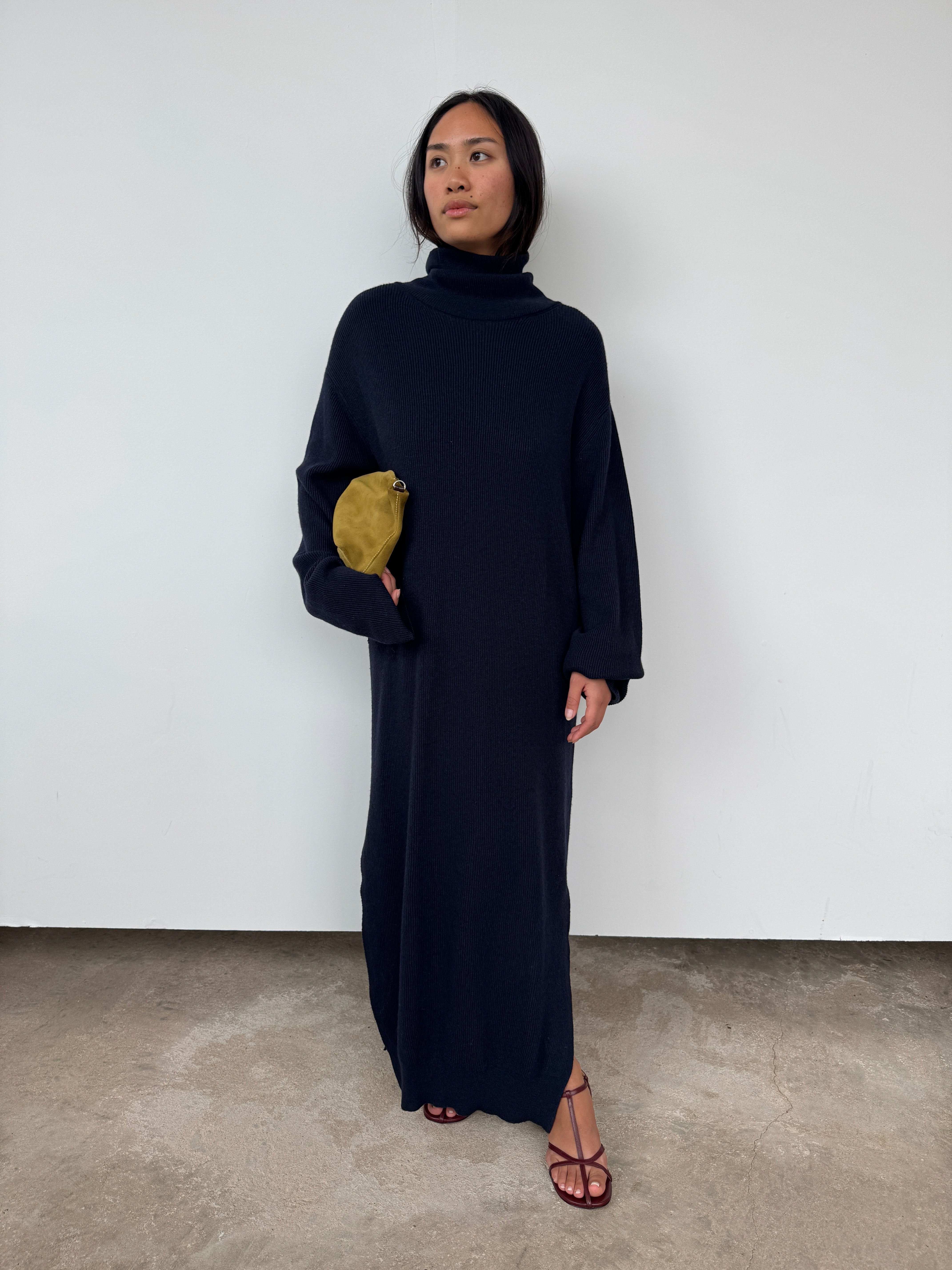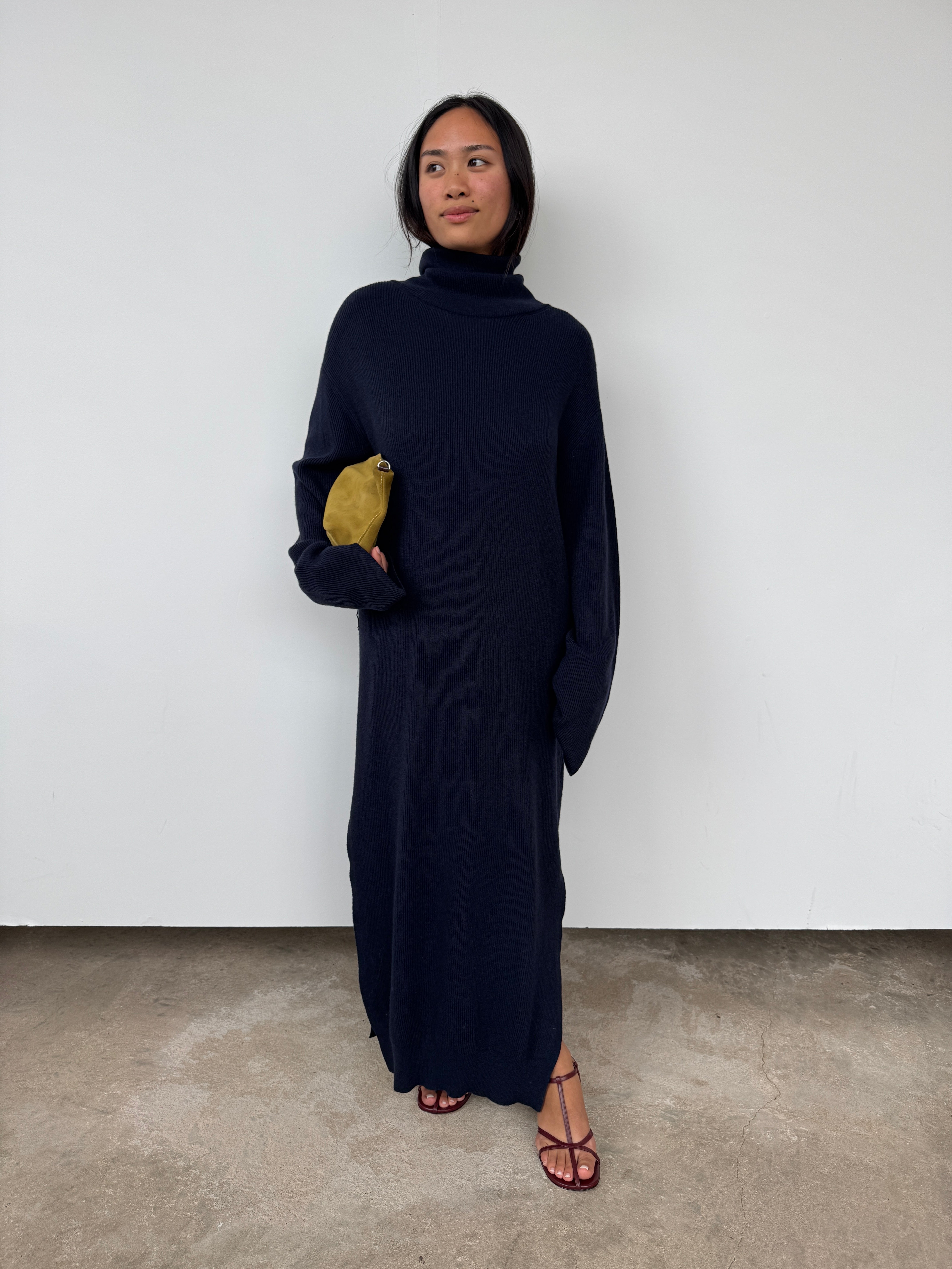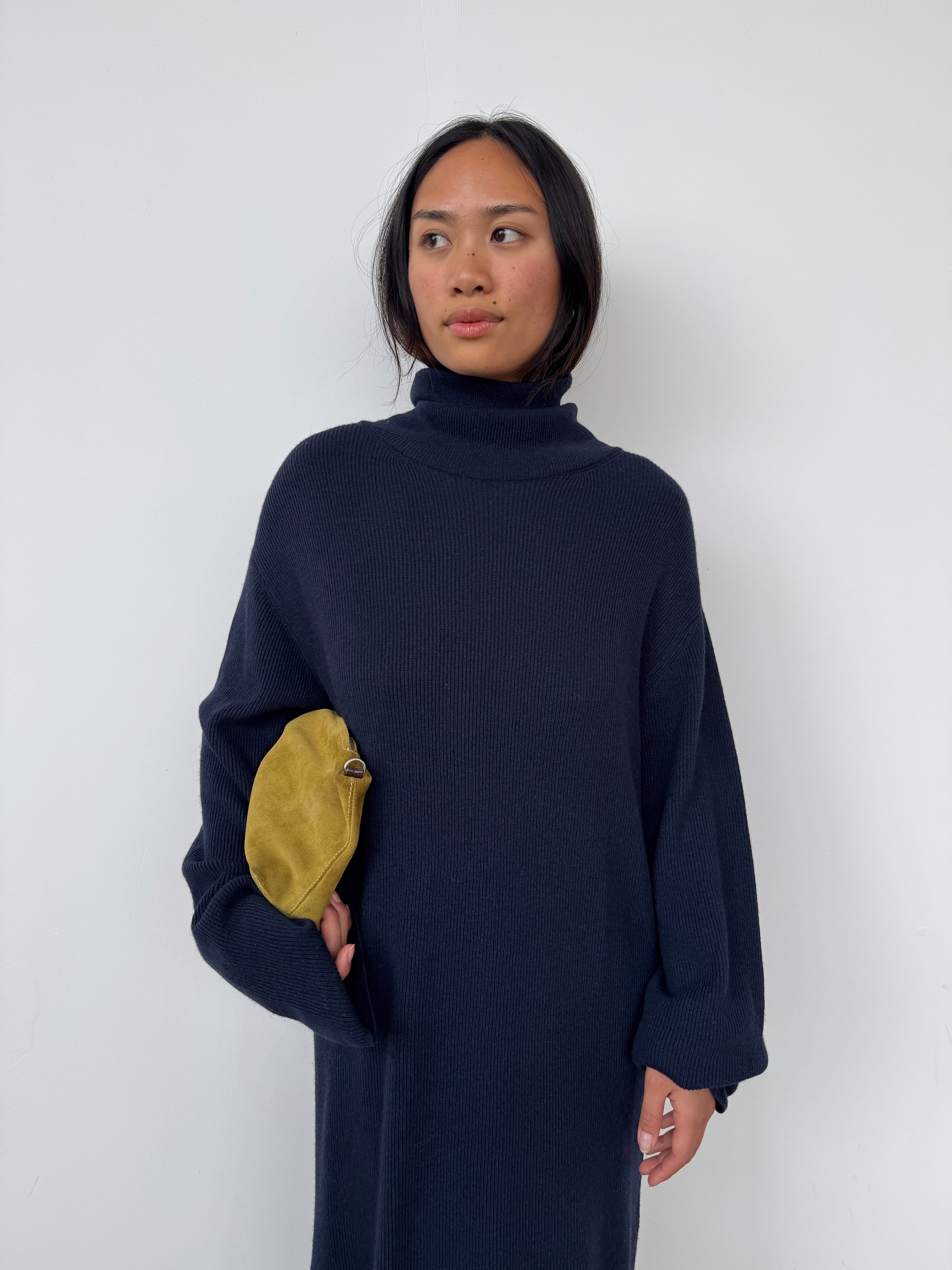Long sleeve rib knit viscose and wool-blend mid-length dress with a turtleneck collar. Detachable self-tie fastening at waist. Vented side-seams.