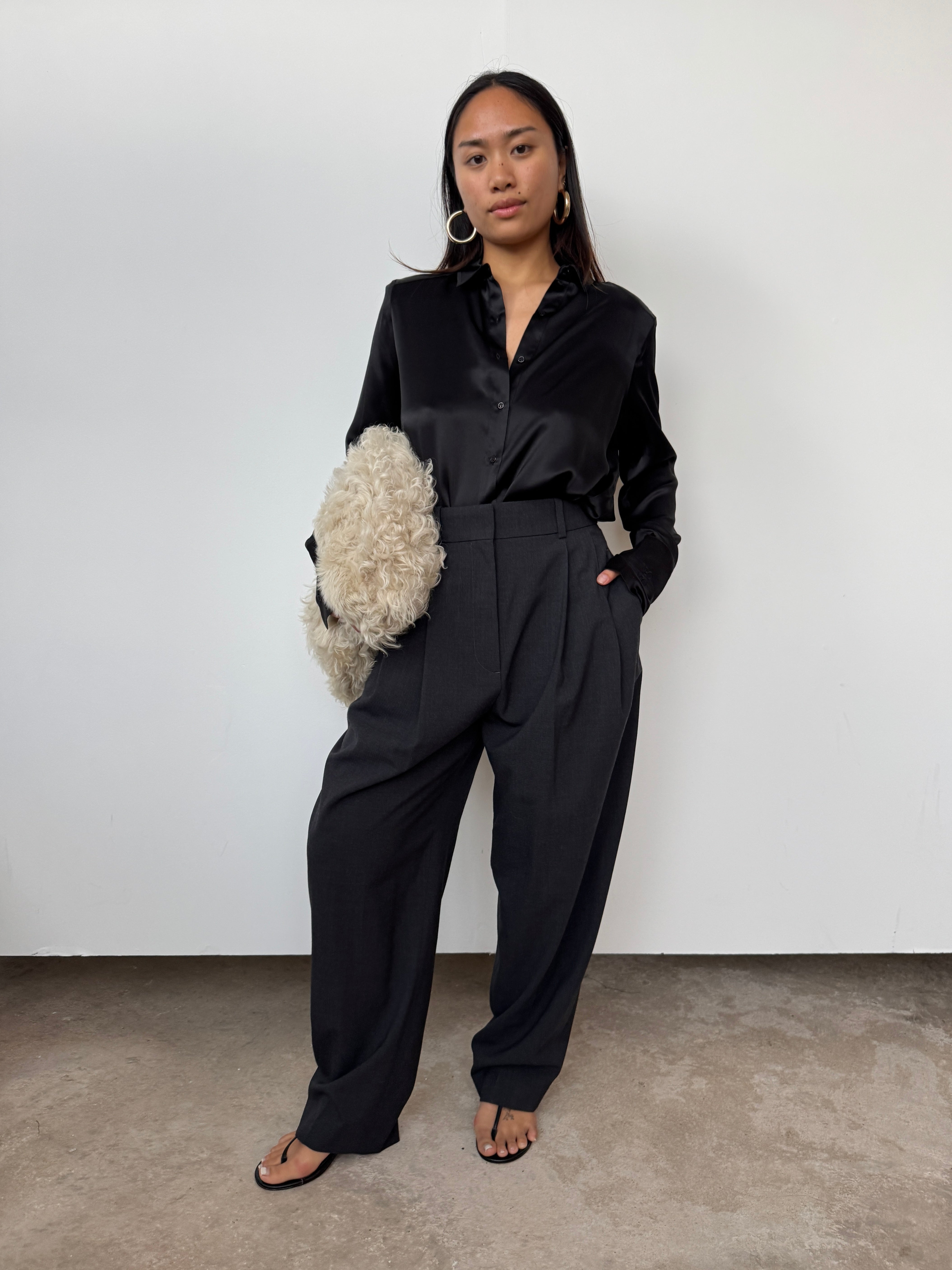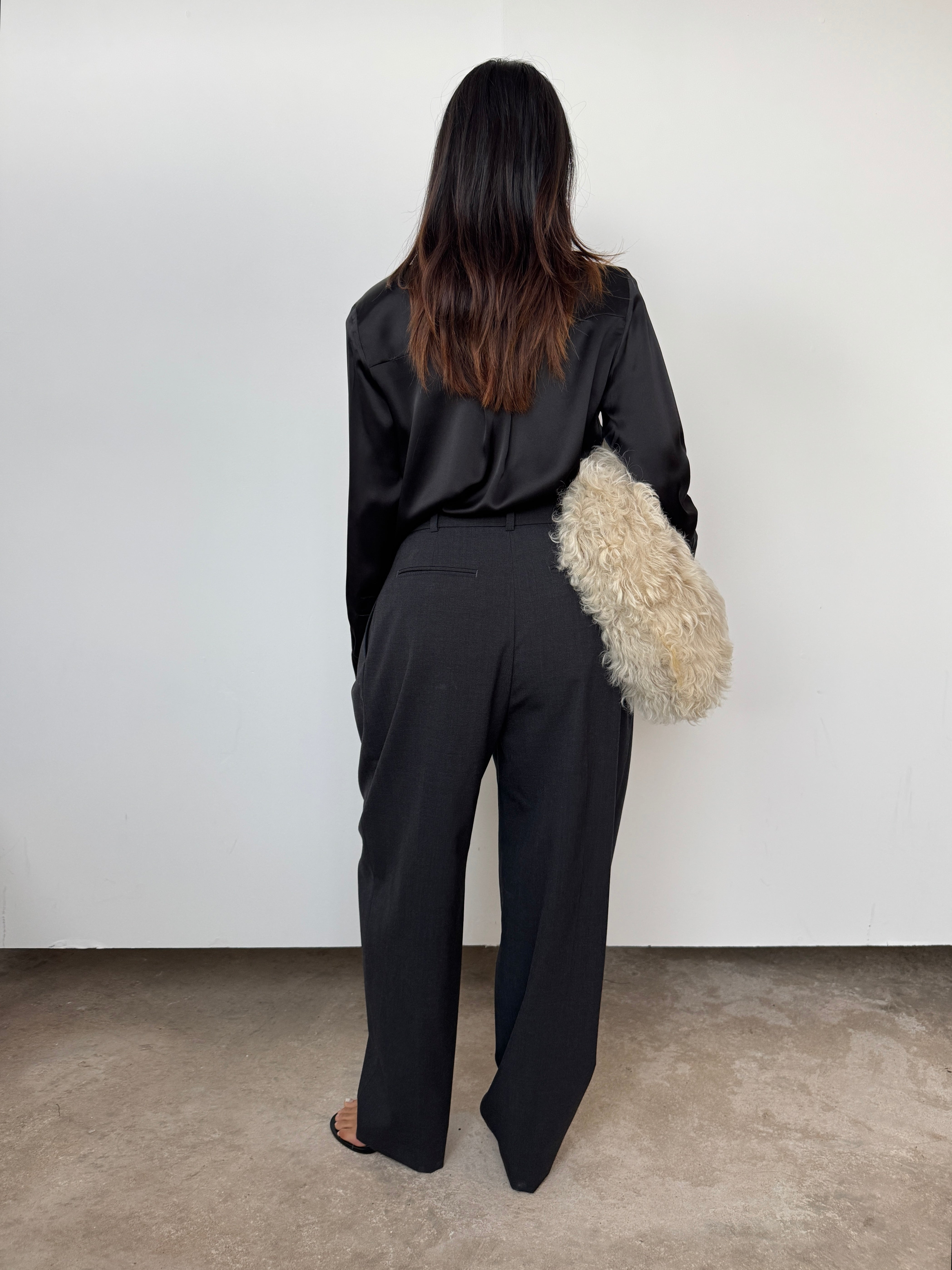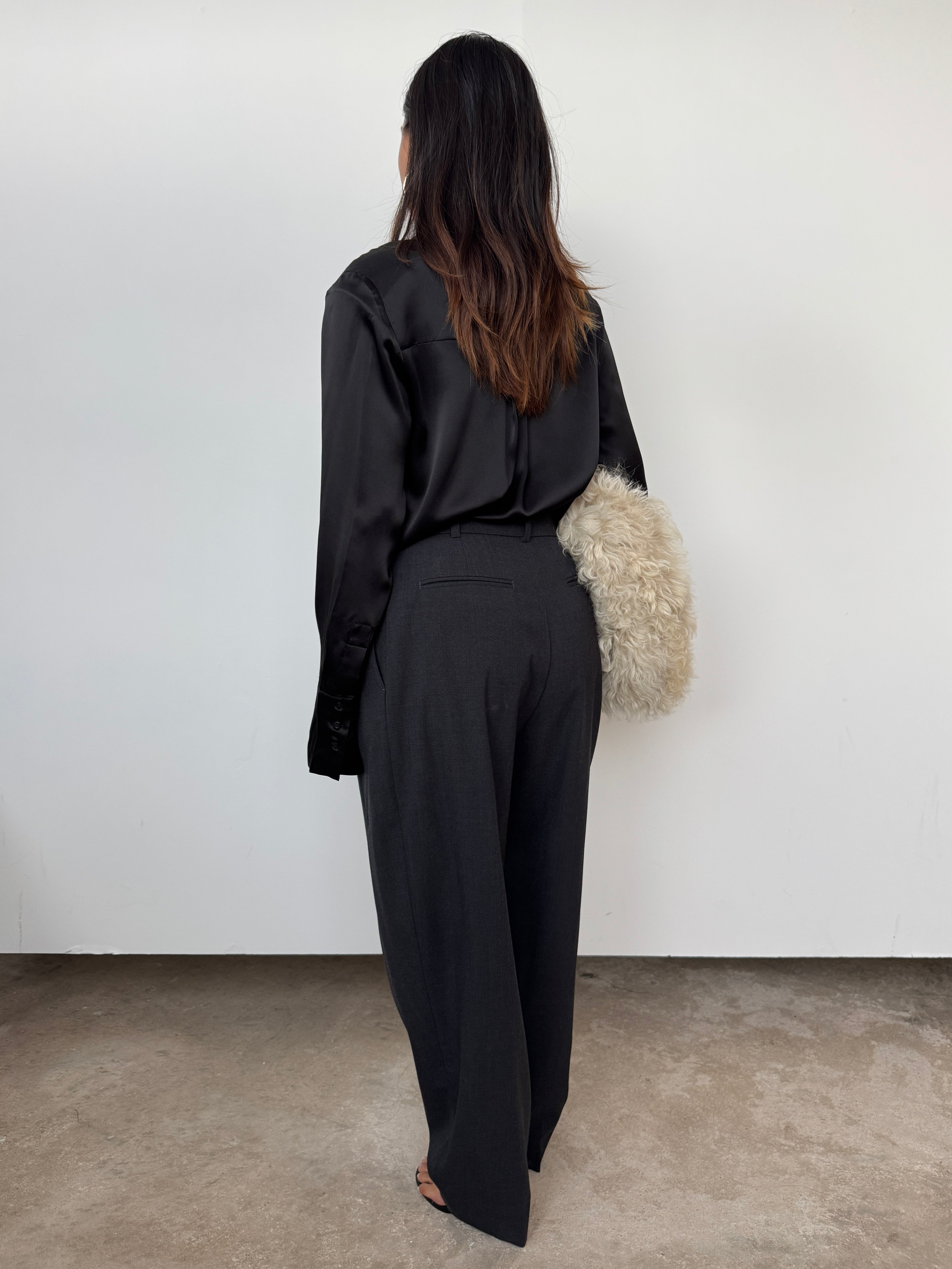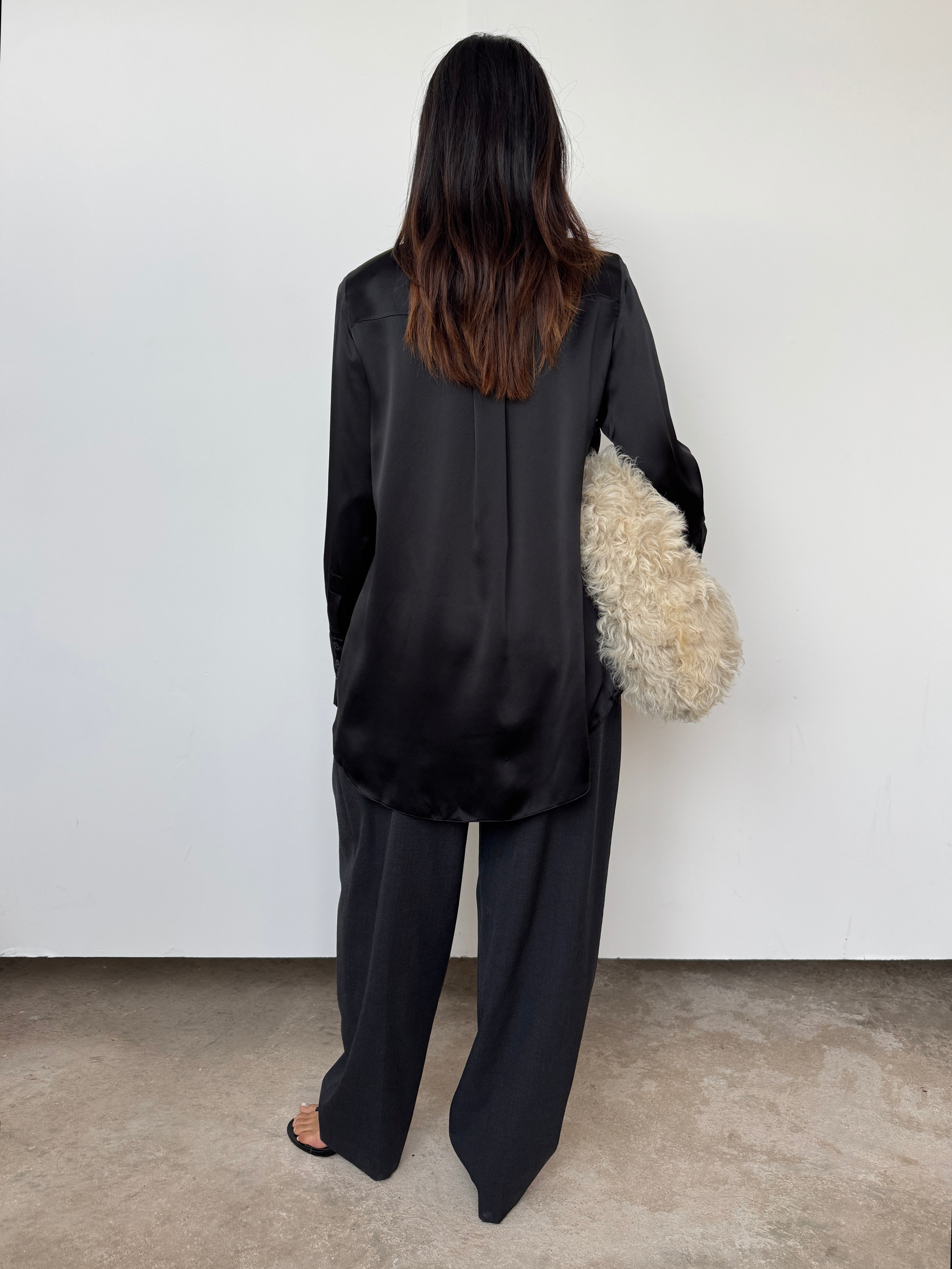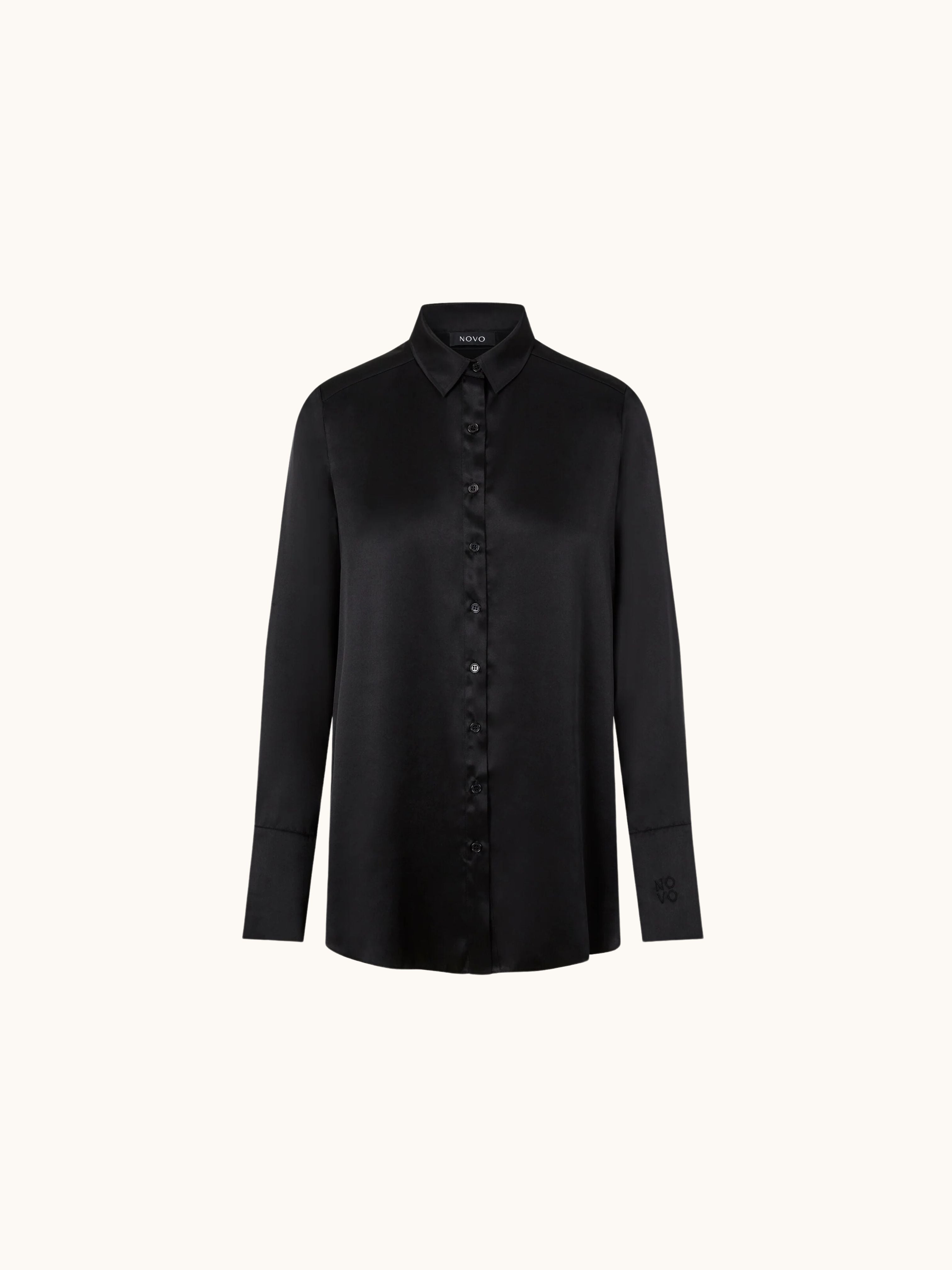 Made with 100% luxury silk, this garment is a key wardrobe must have. The shirt is slightly oversized. The minimal pleat back and staggered hem creates structure and elegance. The premium fabric and finish create a lustre and sheen that is divine to handle and wear. The piece is finished with NOVO's signature logo embroidered on the left arm cuff.