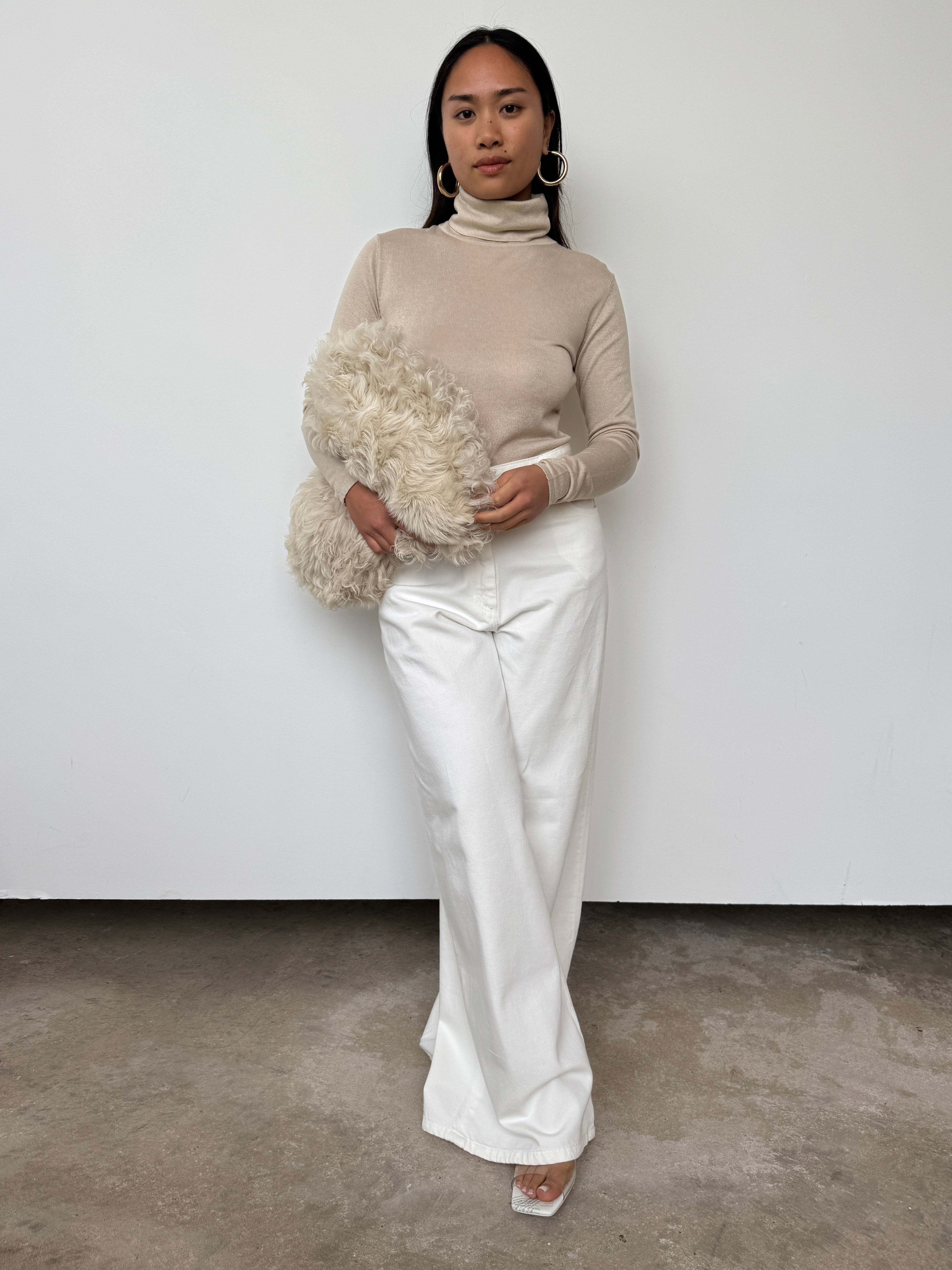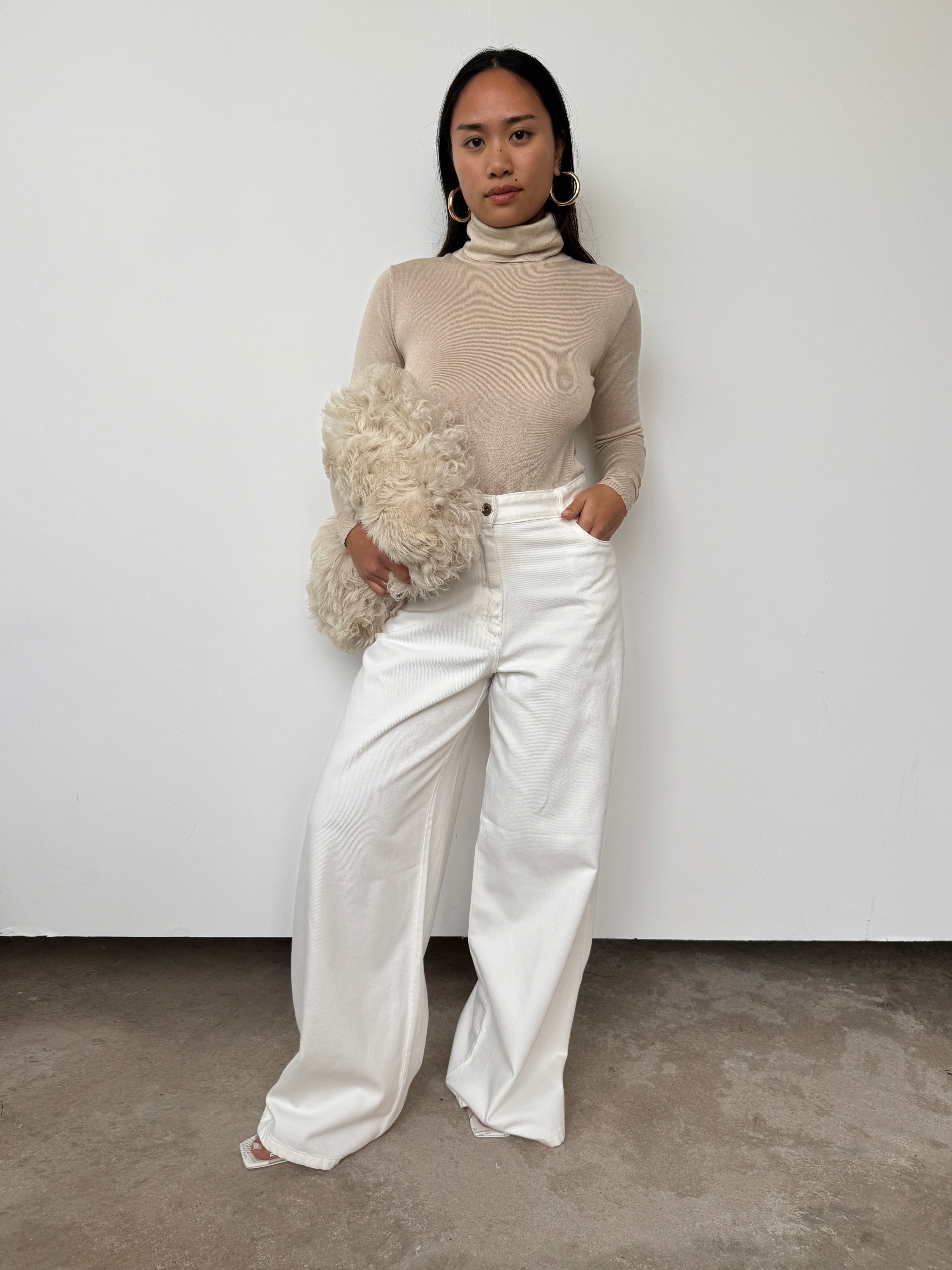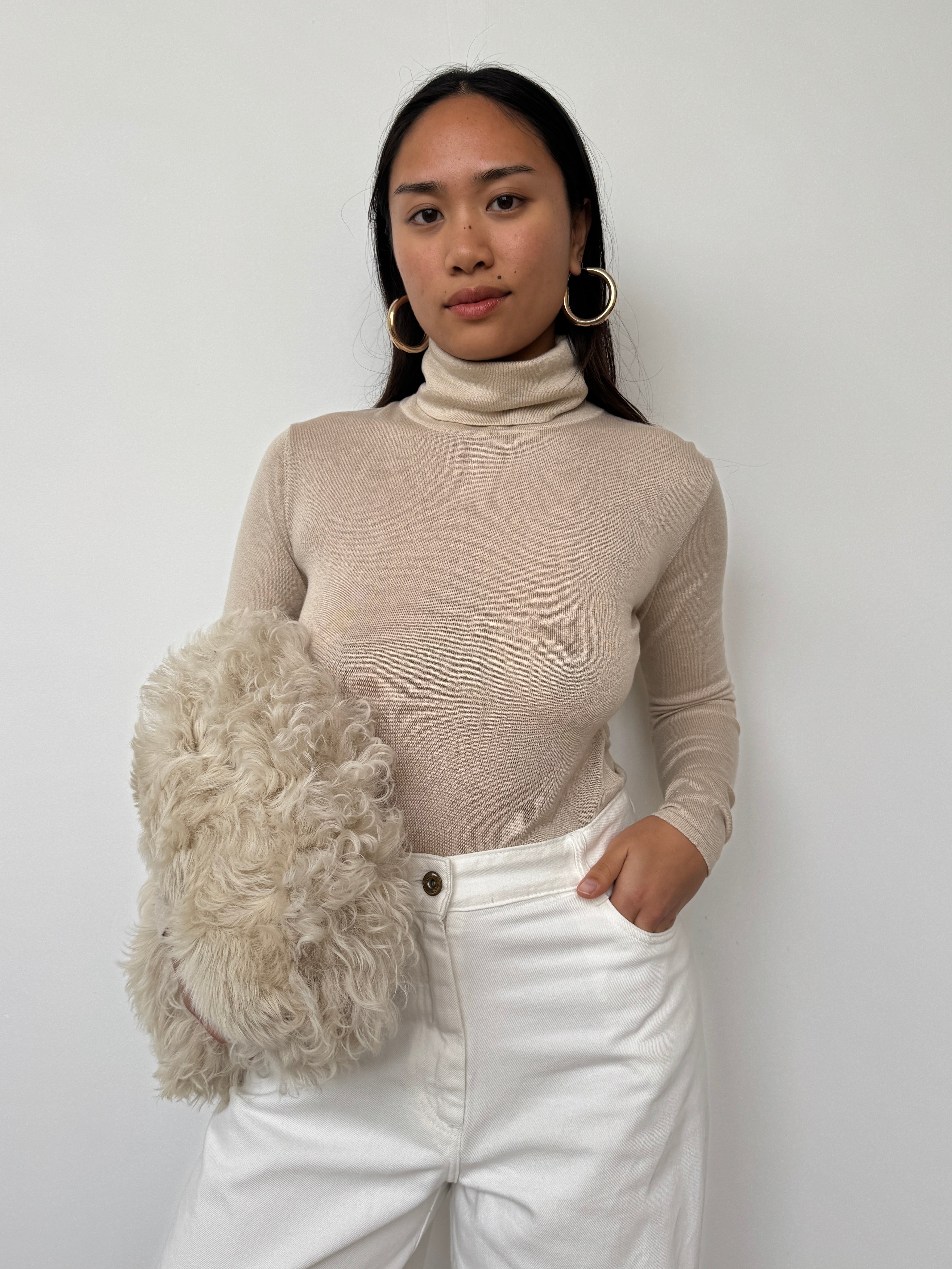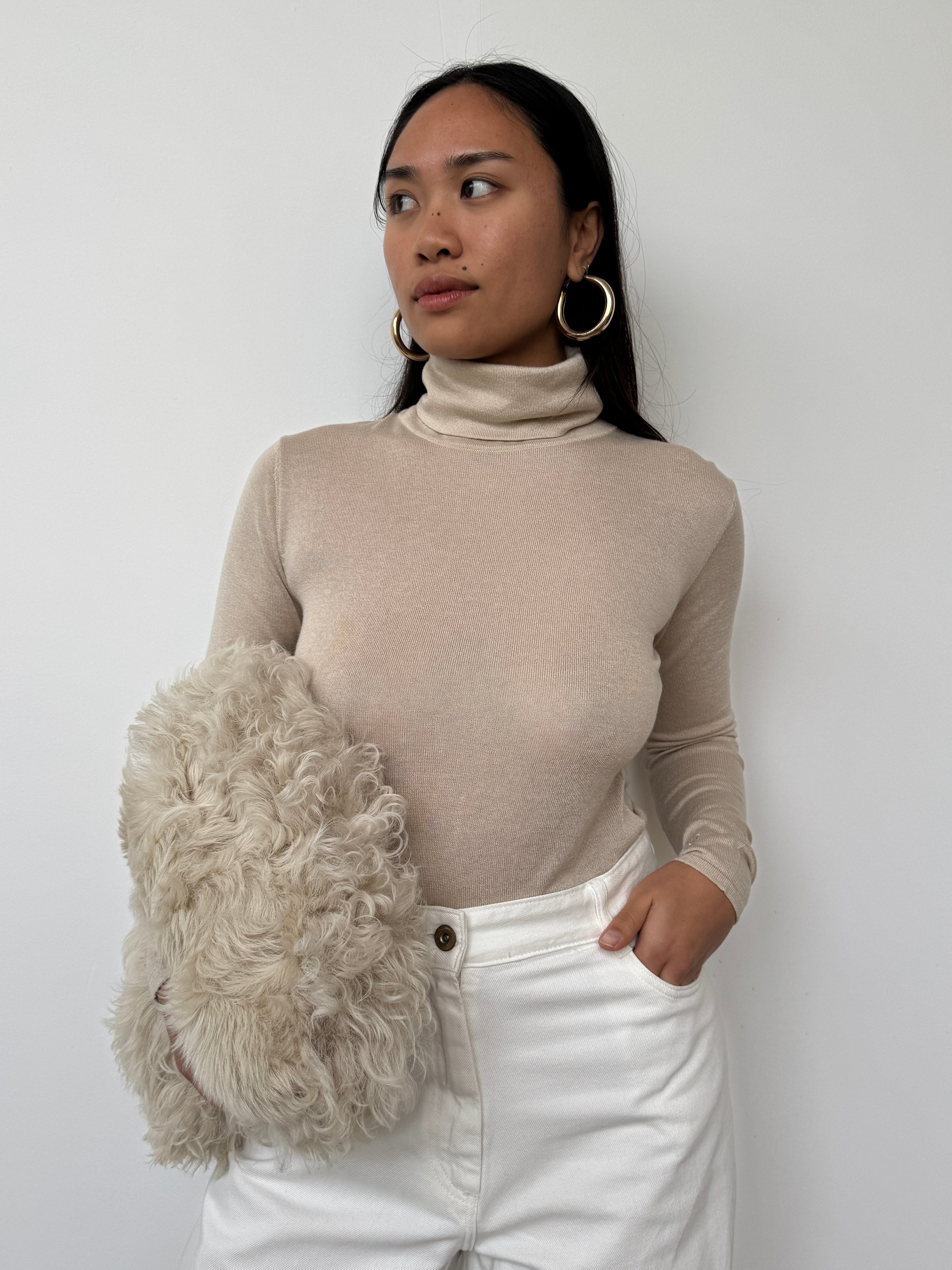NOVO CURATED Sand Semi Sheer Premium Silk and Cashmere Blend Turtleneck Bodysuit | UK8, UK16