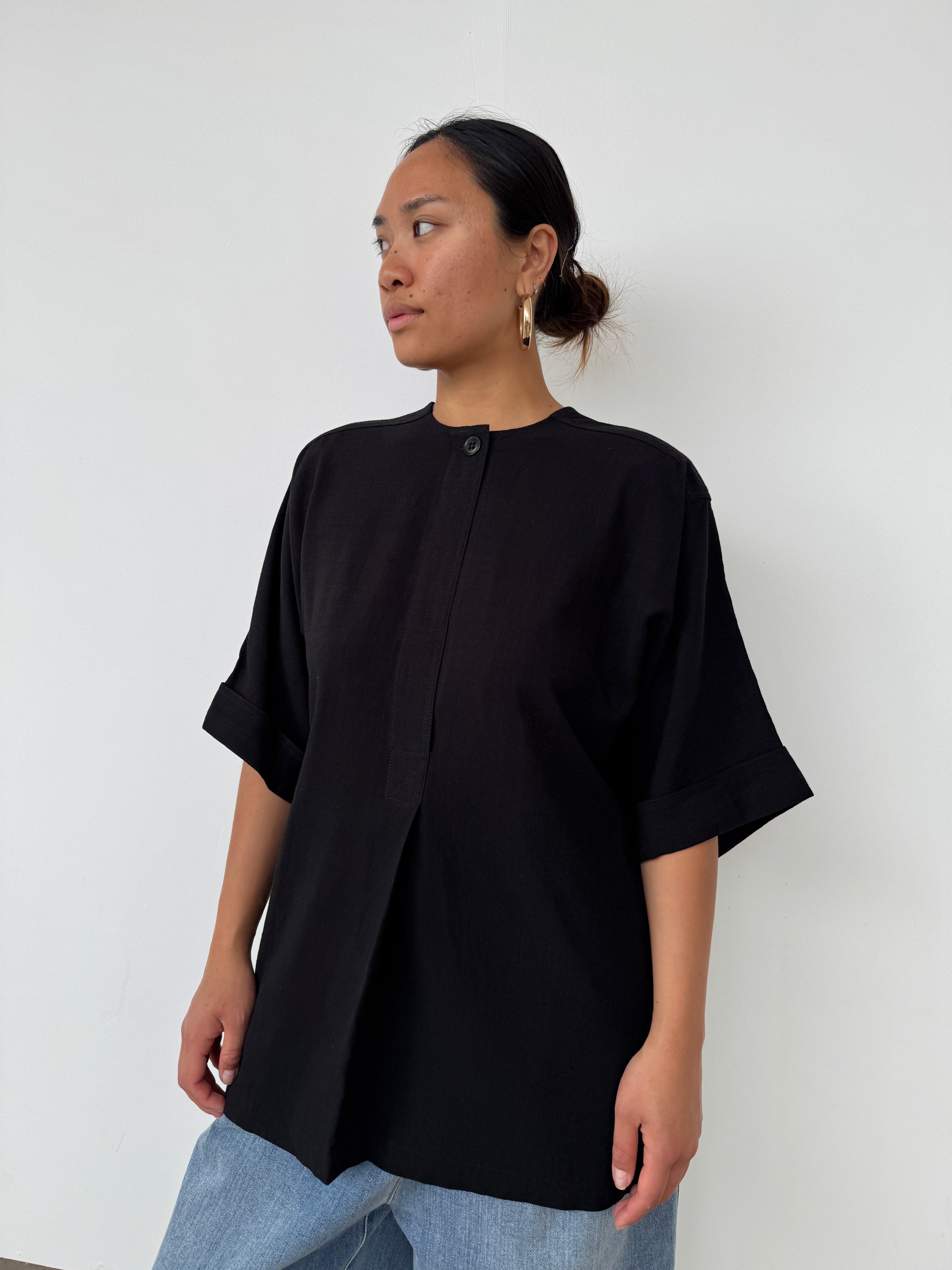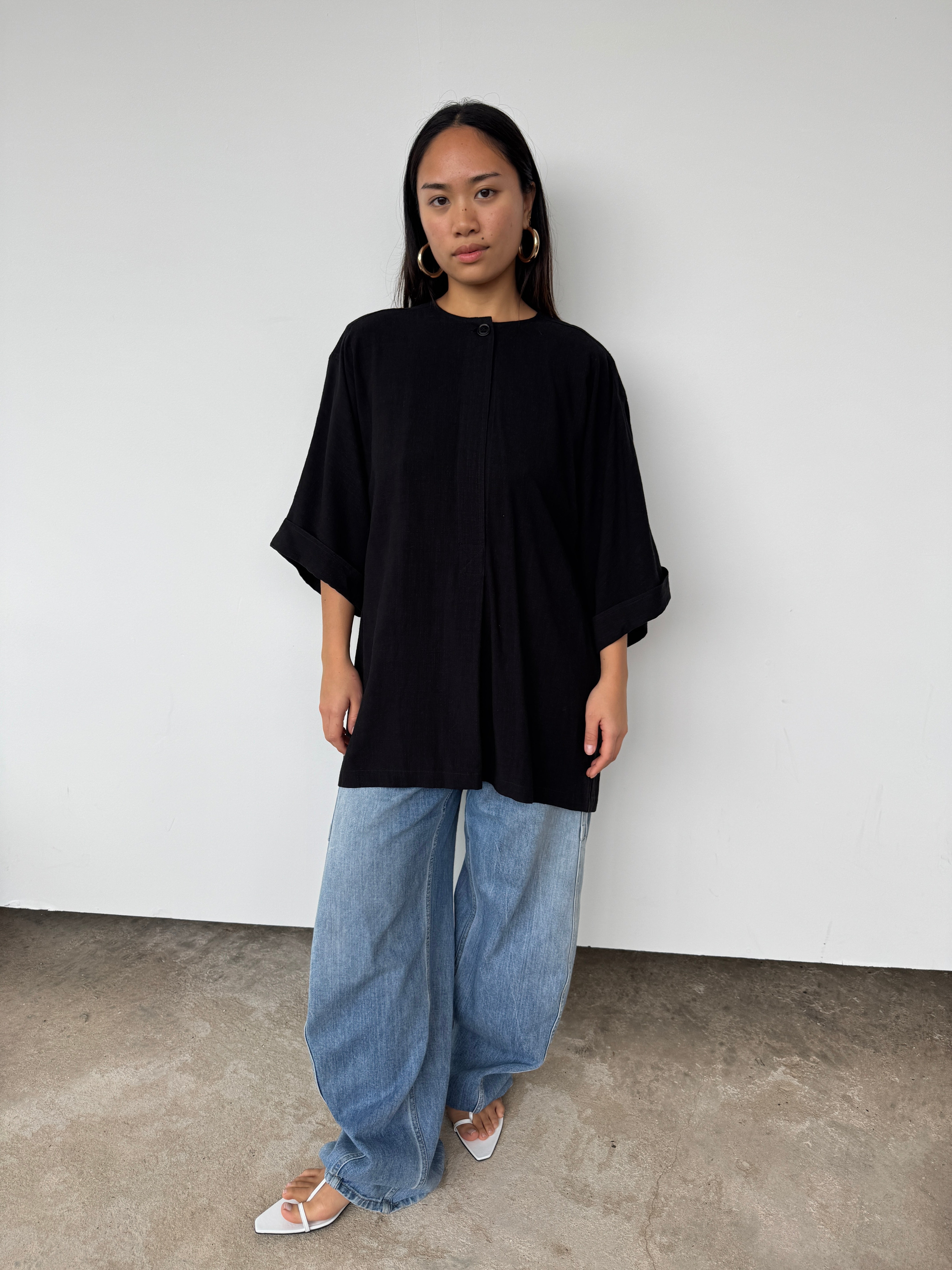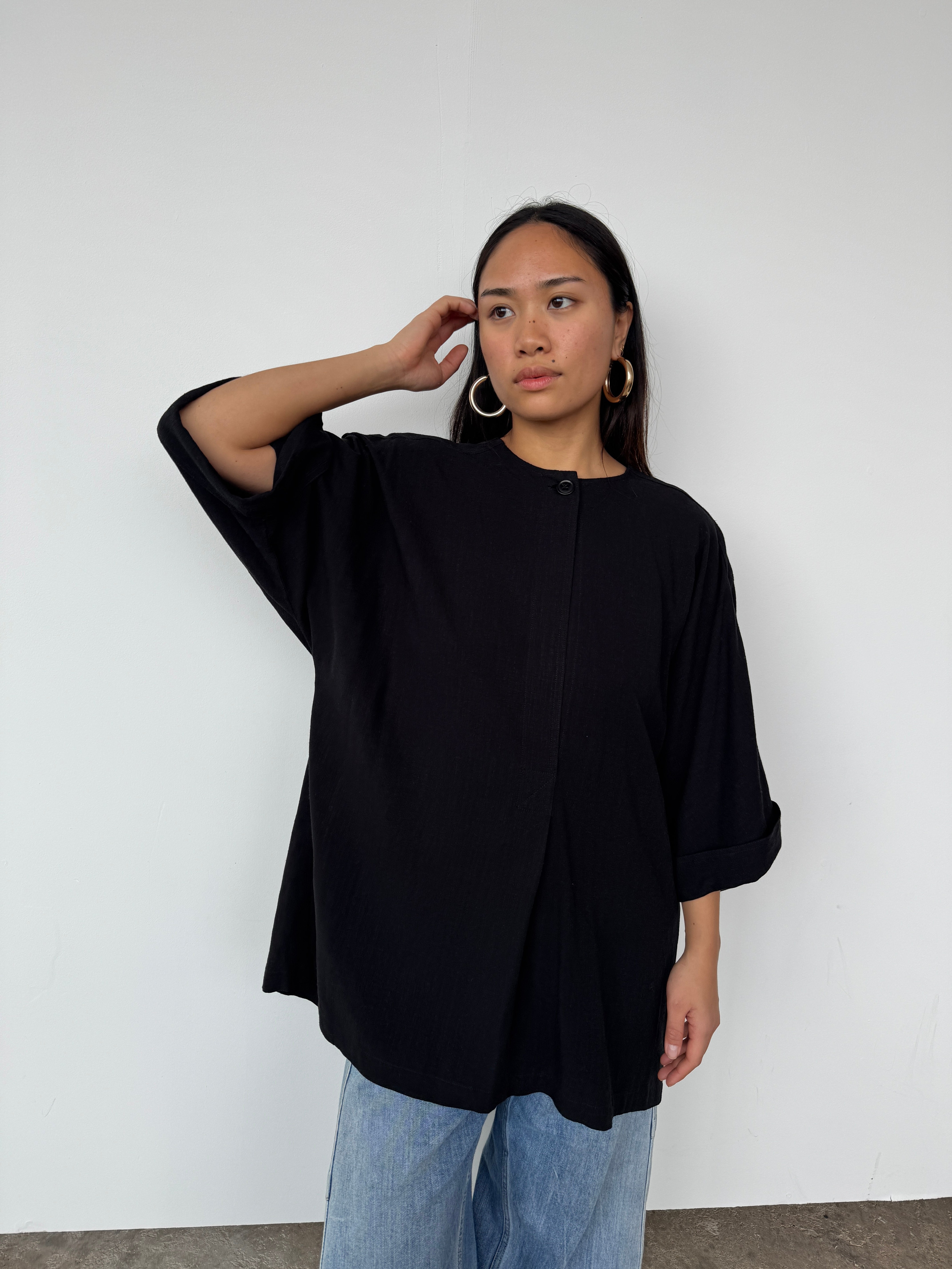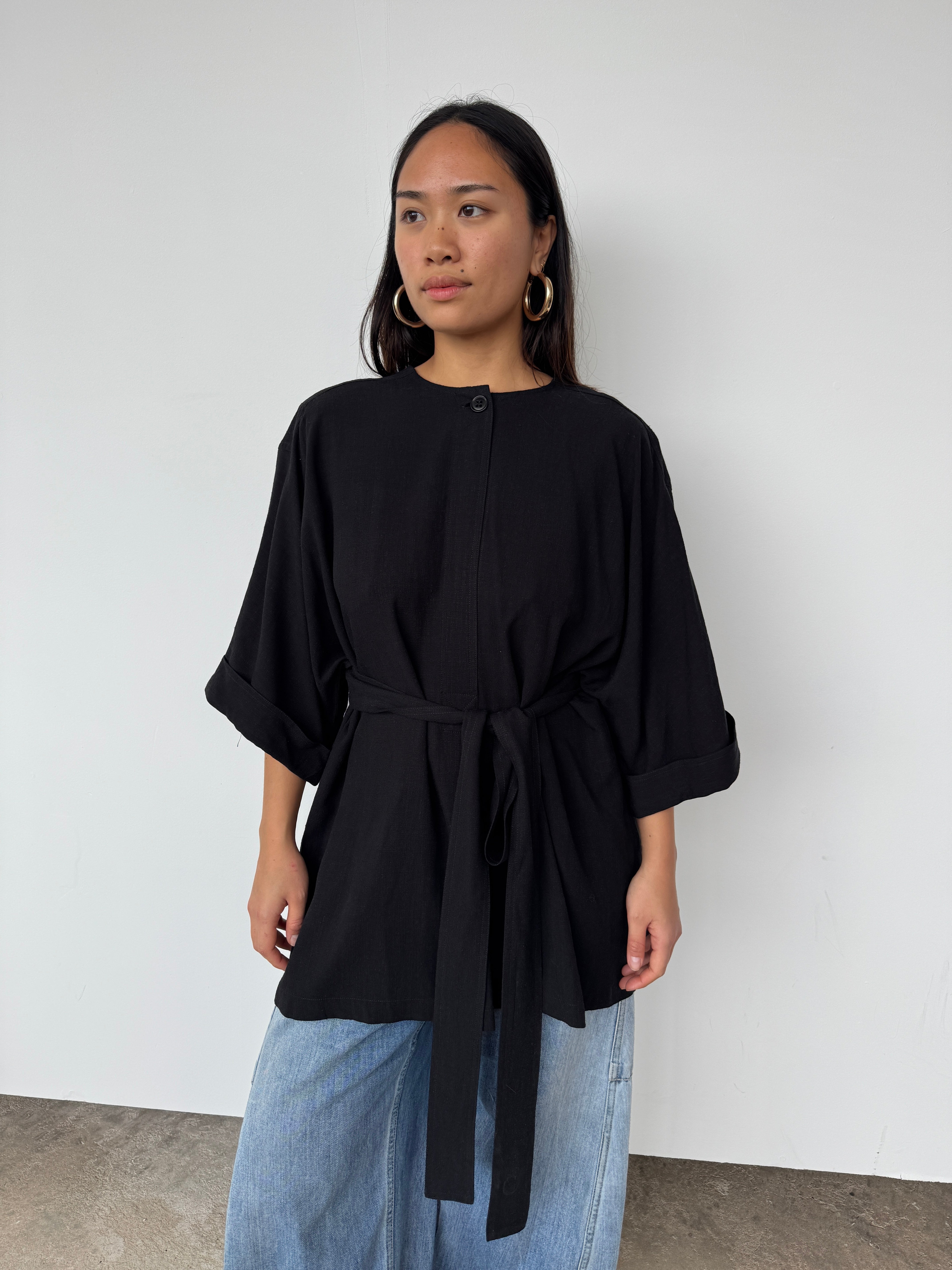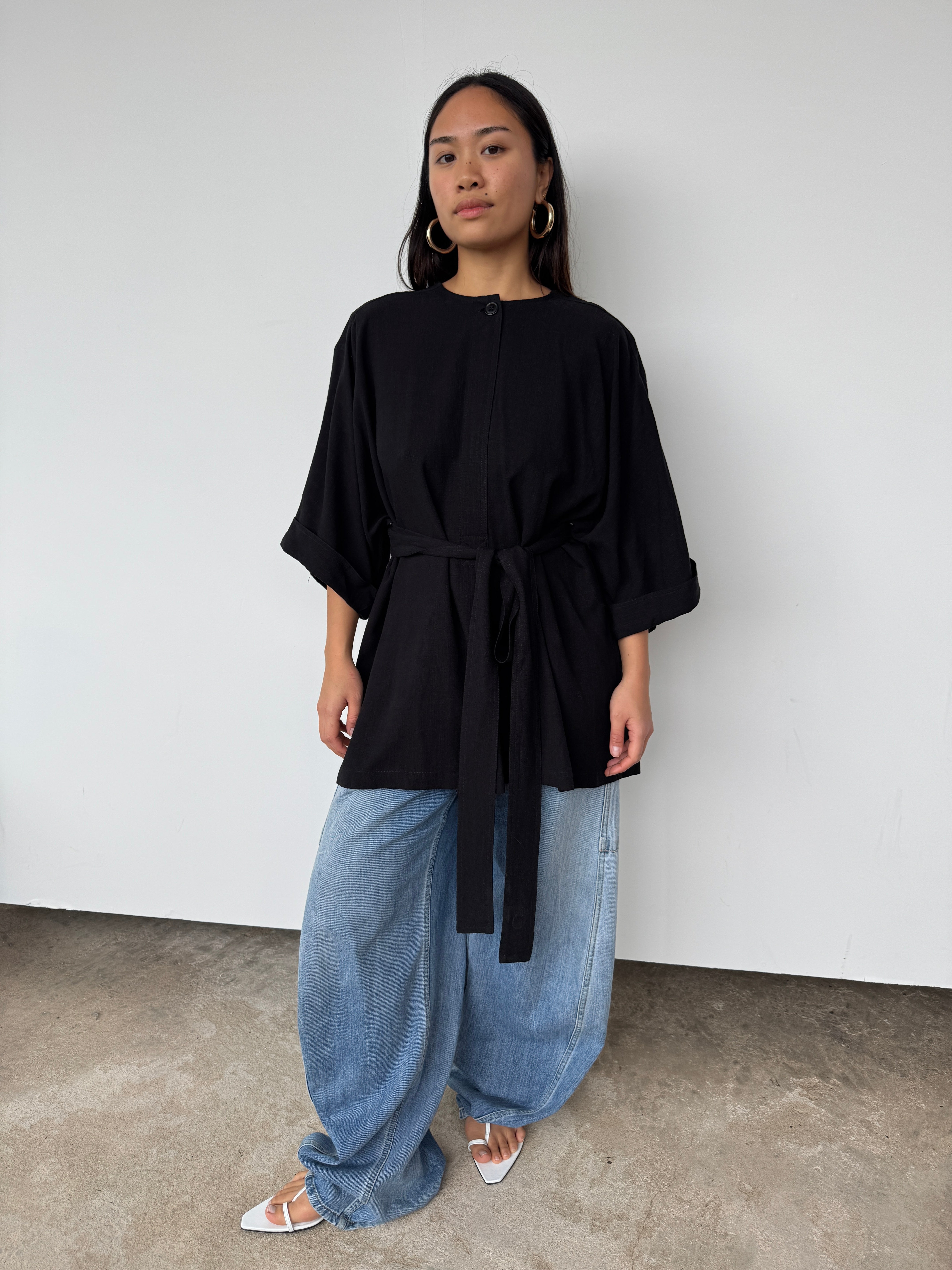 This is a perfect versatile shirt for the spring and summer season. It has a longline length and can be worn with our without the belt. The top is cut with a loose fit and also looks great tucker into your trousers. We love the material to this piece.