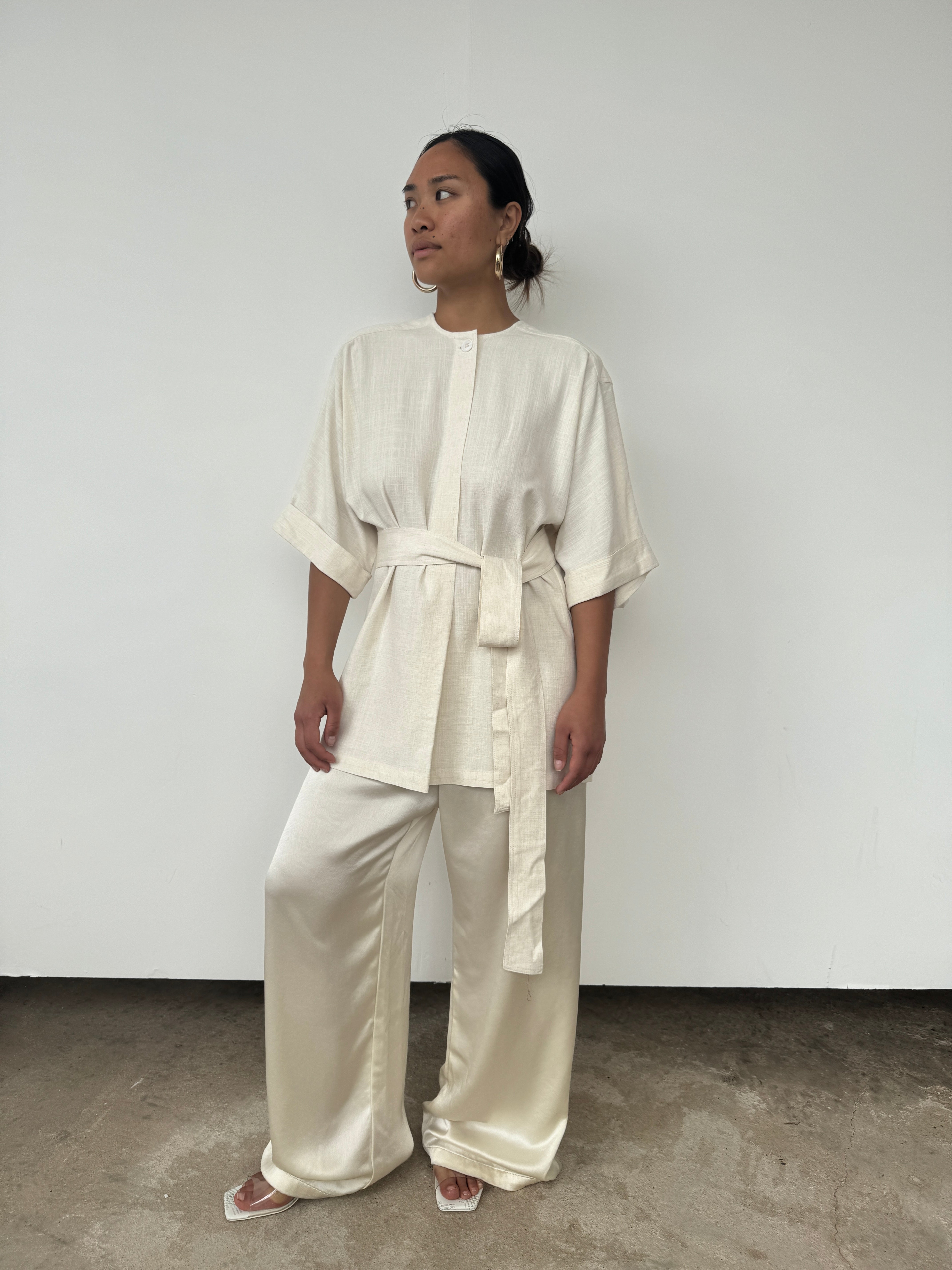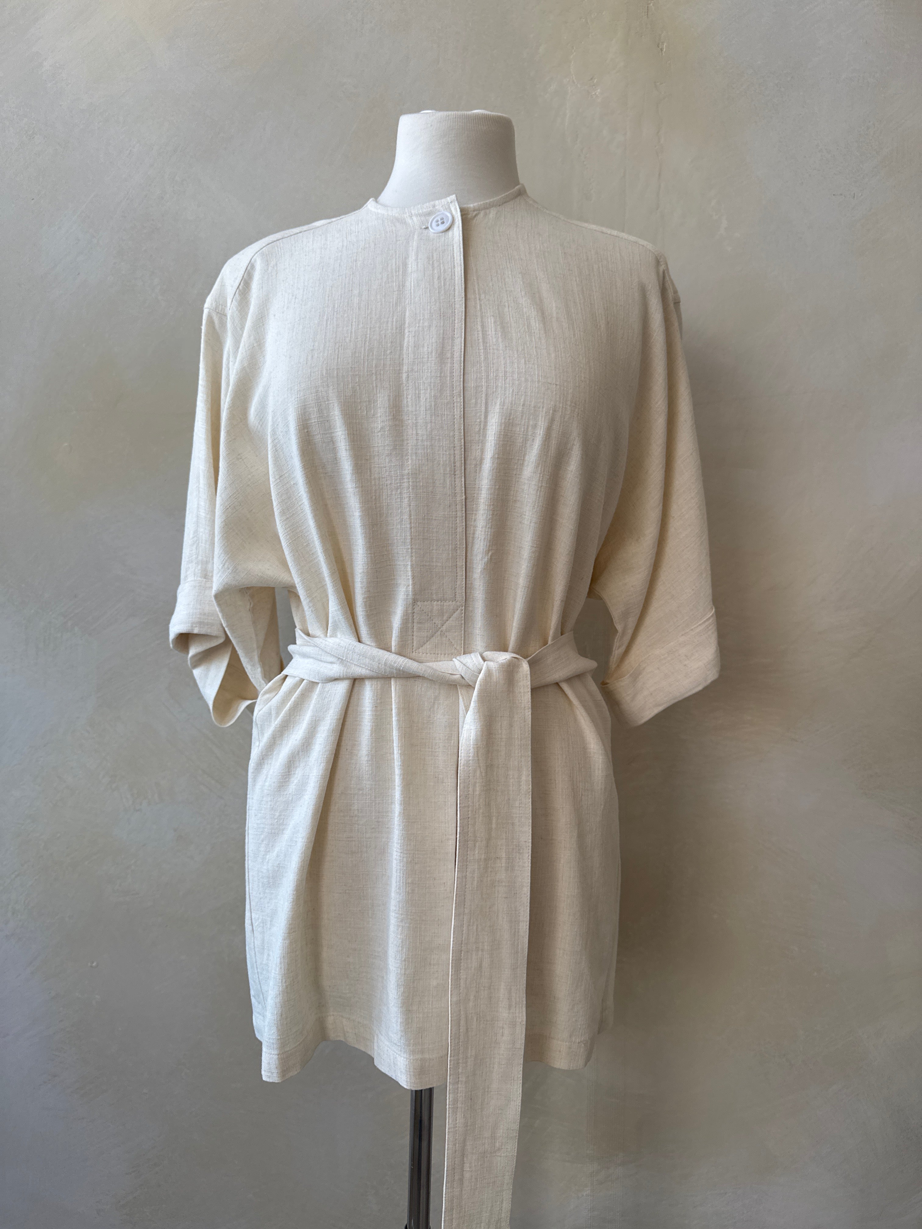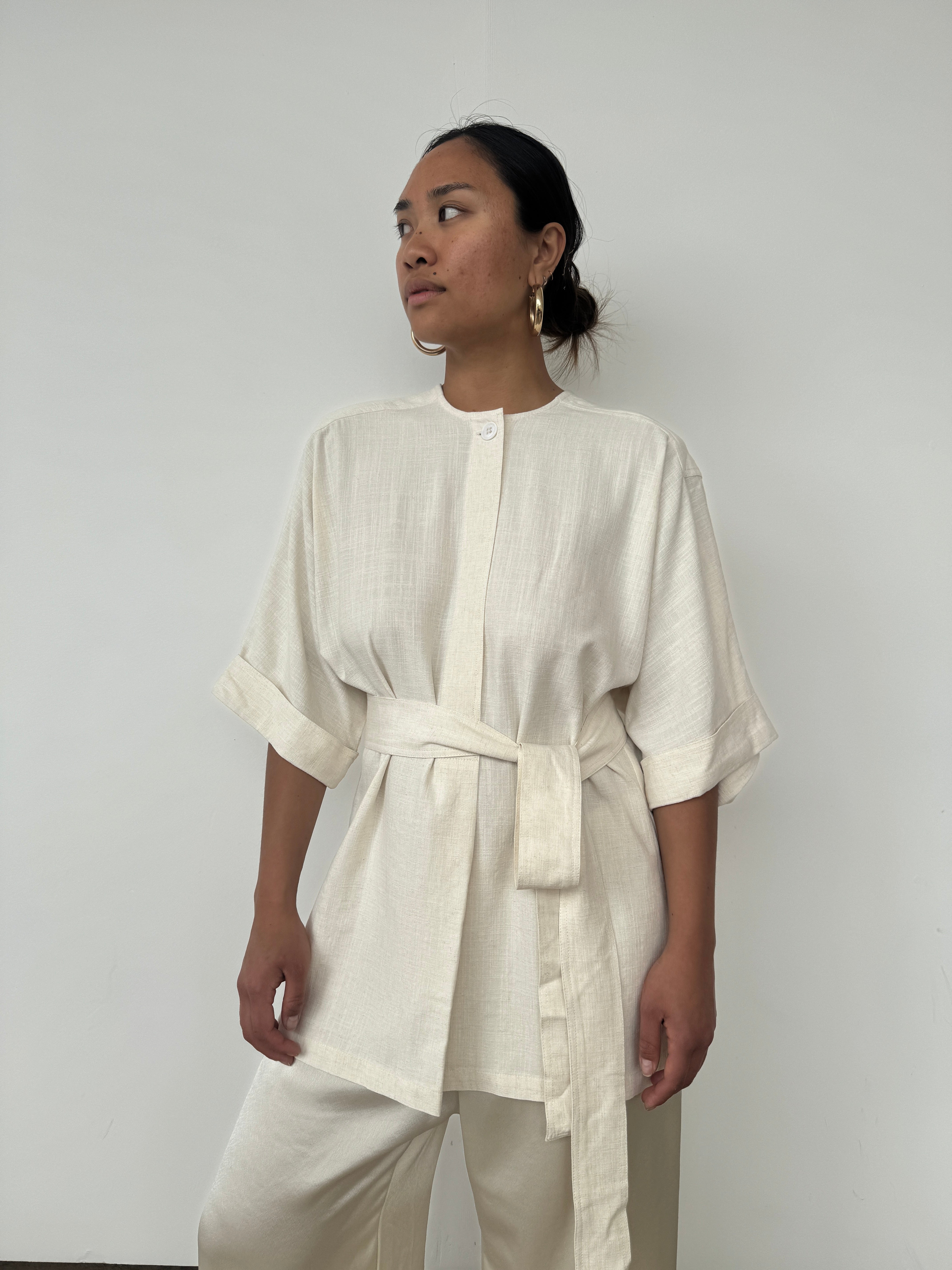 This is a perfect versatile shirt for the spring and summer season. It has a longline length and can be worn with our without the belt. The top is cut with a loose fit and also looks great tucker into your trousers. We love the material to this piece.