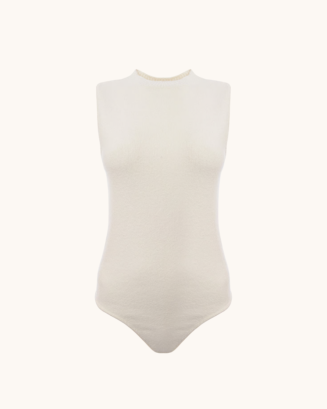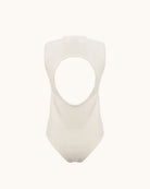 Raey's ivory bodysuit is knitted from cotton-blend boucle and shaped to a high neck, then turns to reveal a circular cutout.