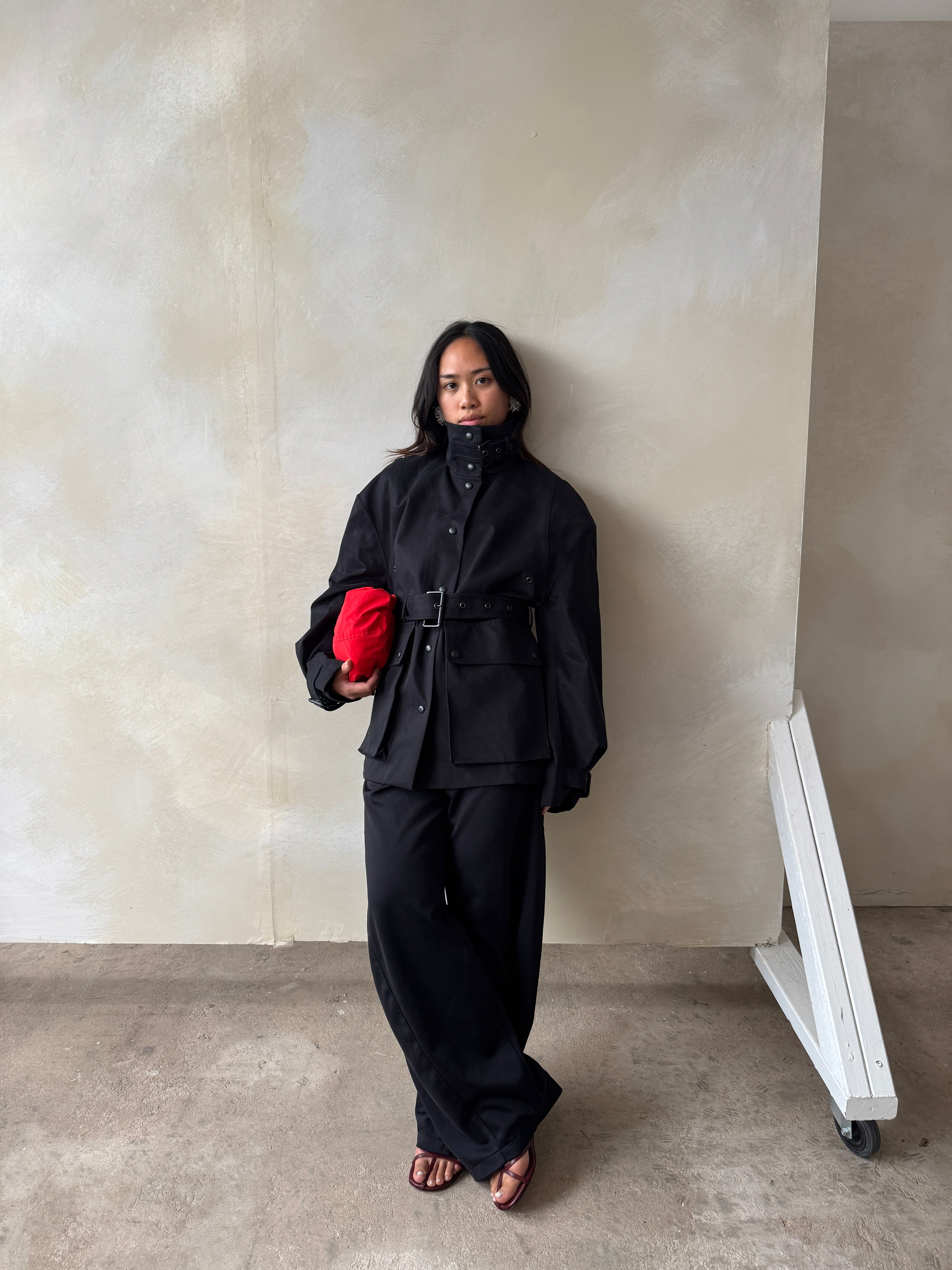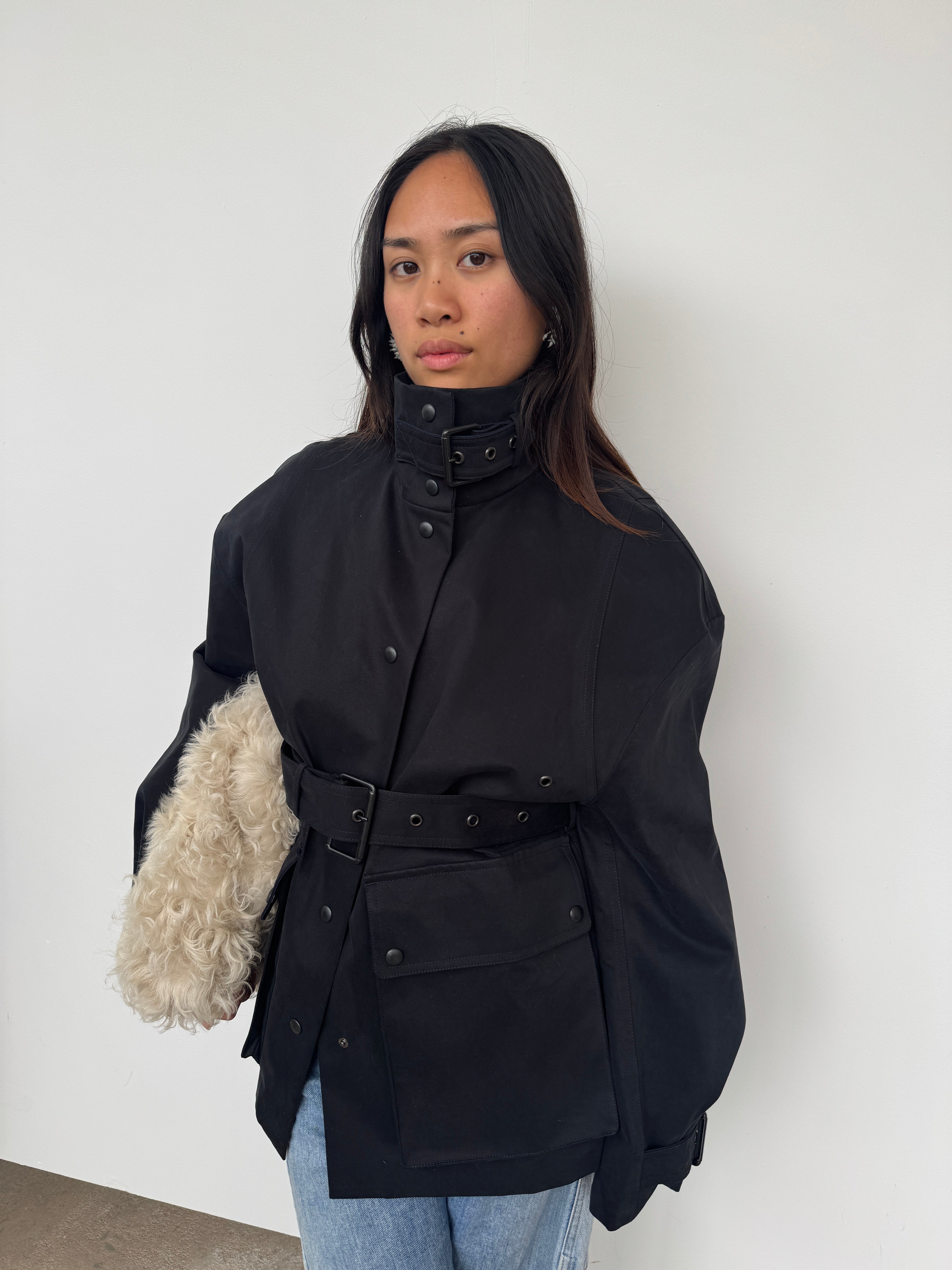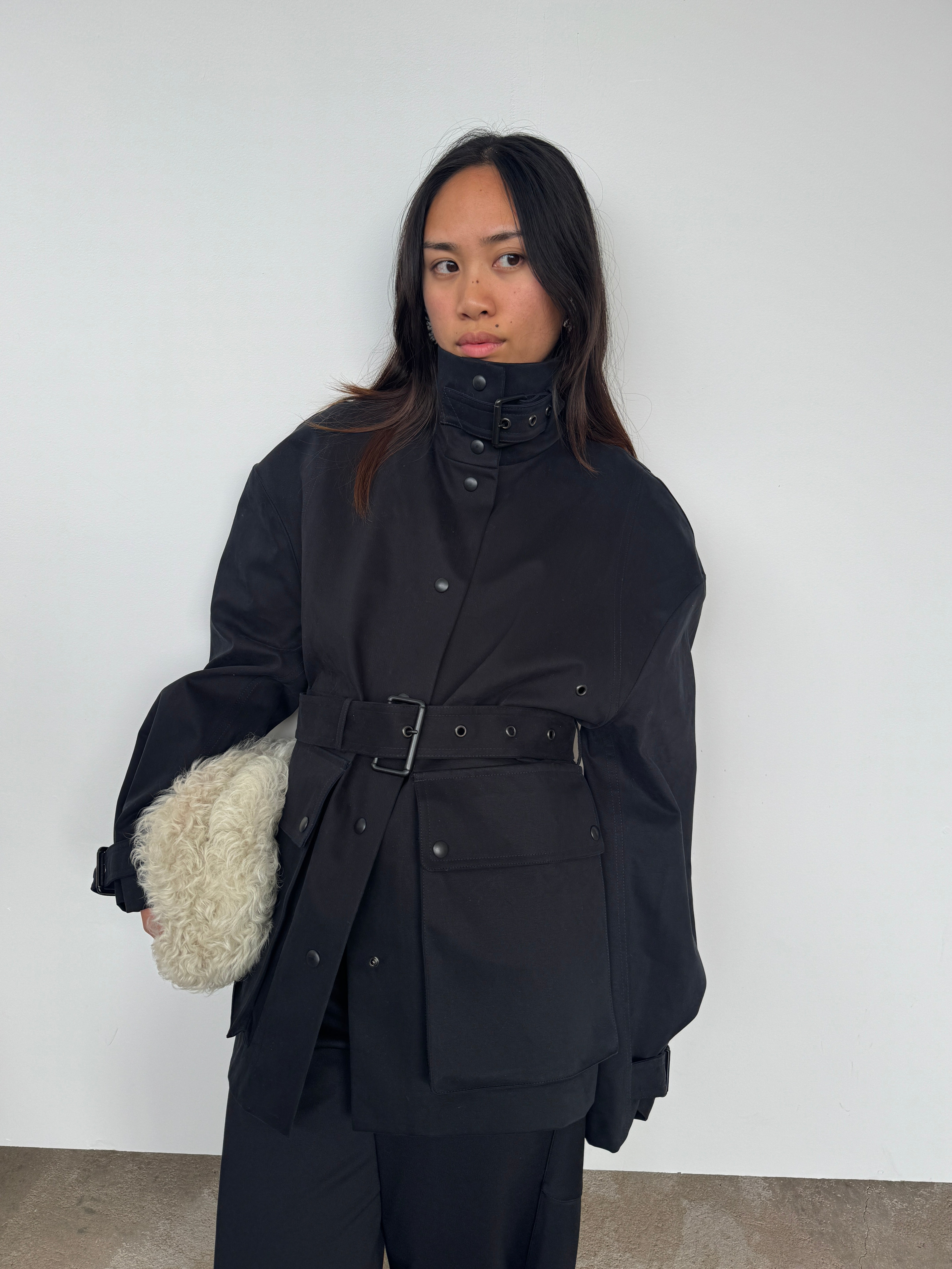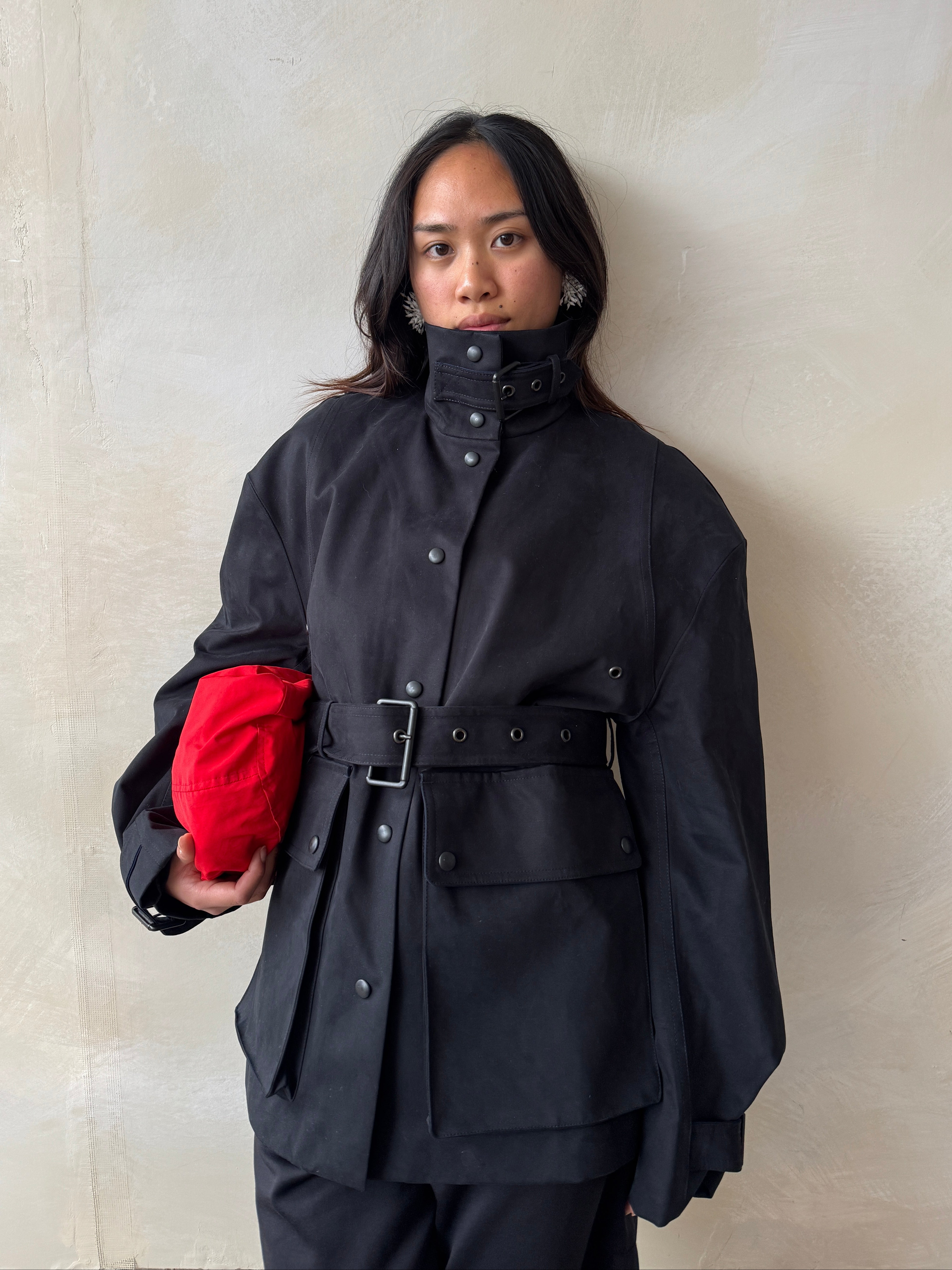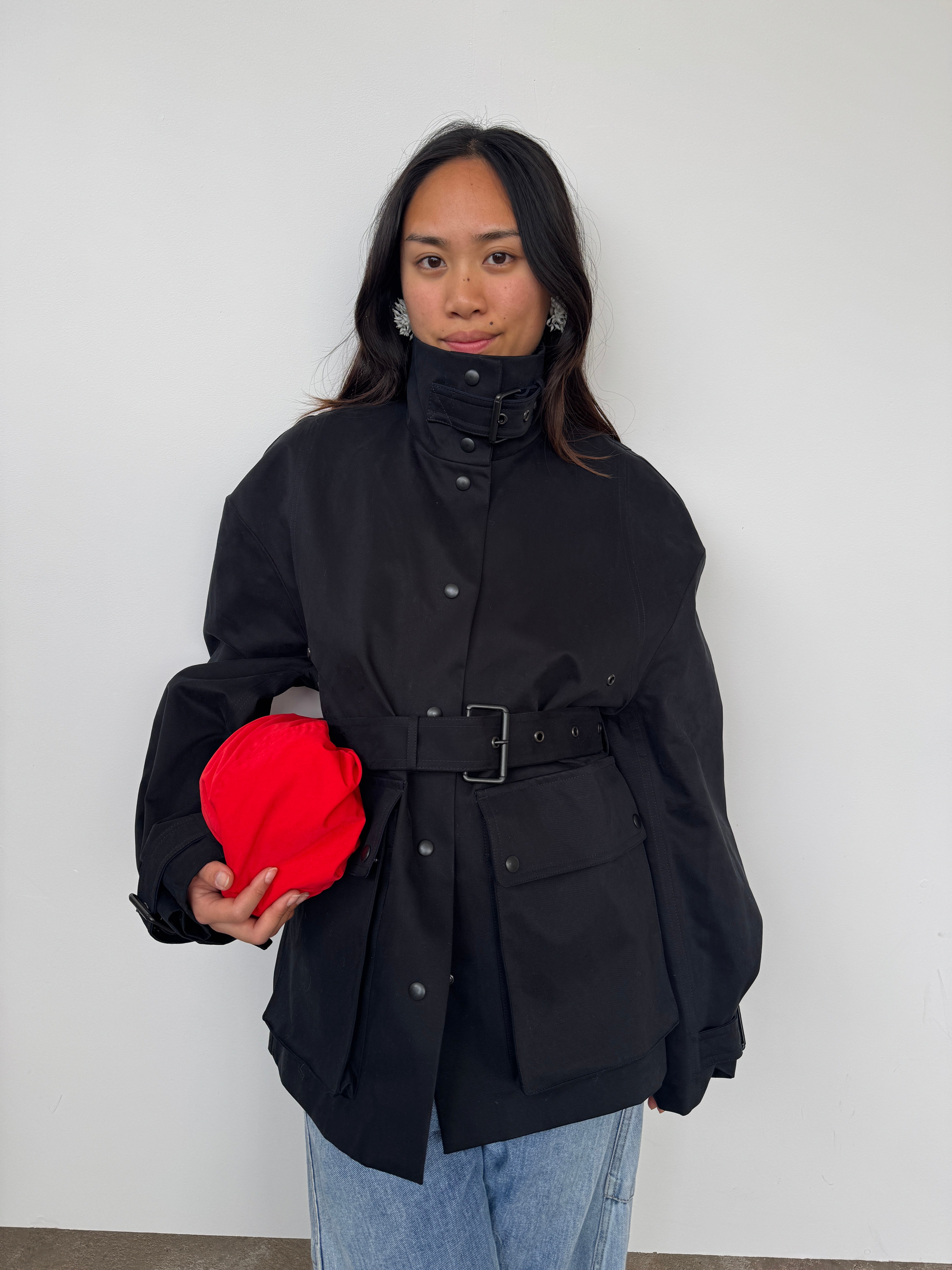 Expertly crafted from 100% rubberised cotton, this Raey jacket is designed with an intentionally oversized silhouette with a clean, structured form. Its versatile weight makes it ideal for layering over cosy knitwear in cooler months or wearing as a standalone statement piece in warmer weather. Use the belt to cinch the waist for a more defined shape, or leave it loose for a more relaxed feel. The hardware and clean lines give it a modern, utilitarian edge.
