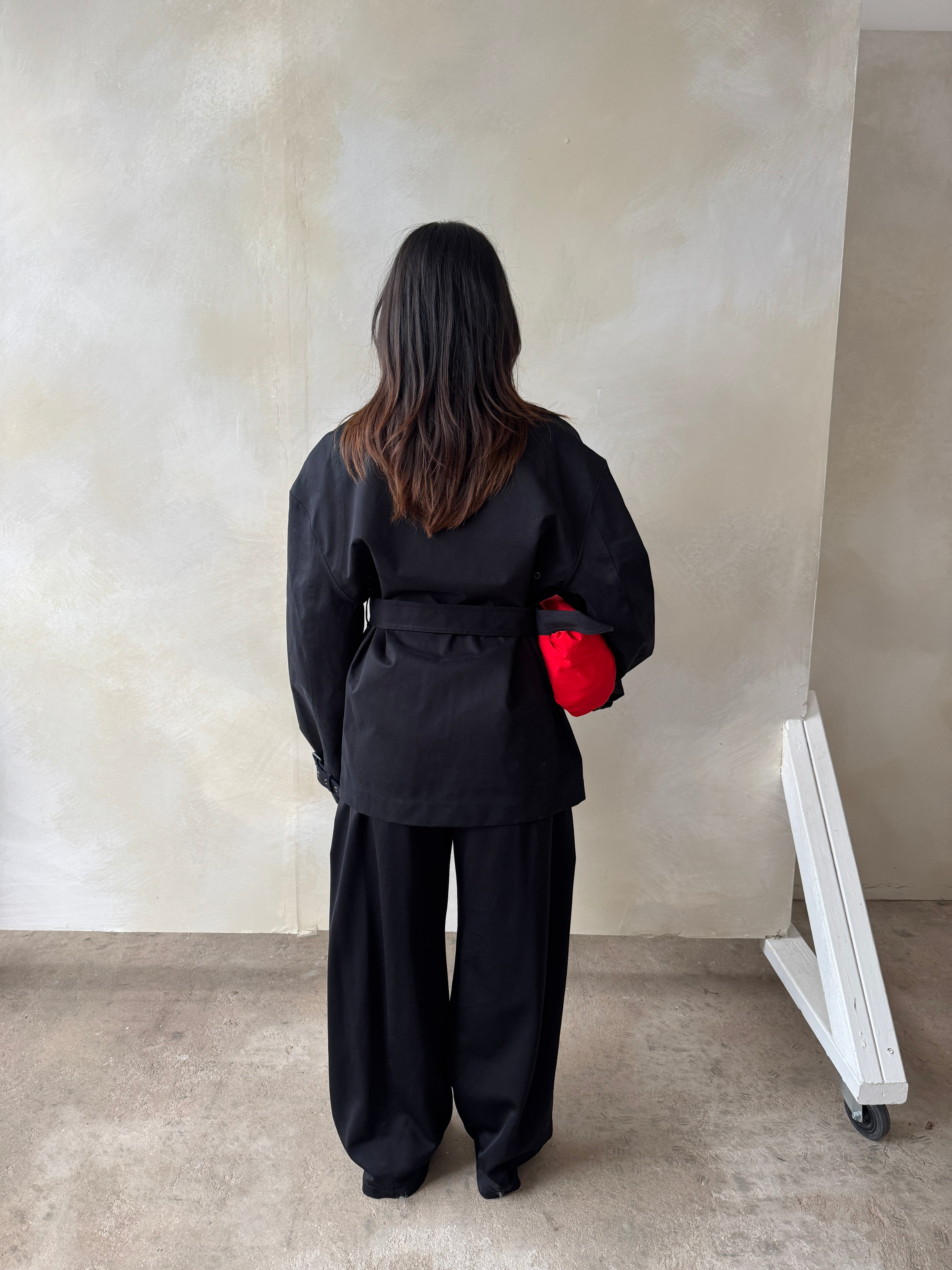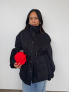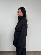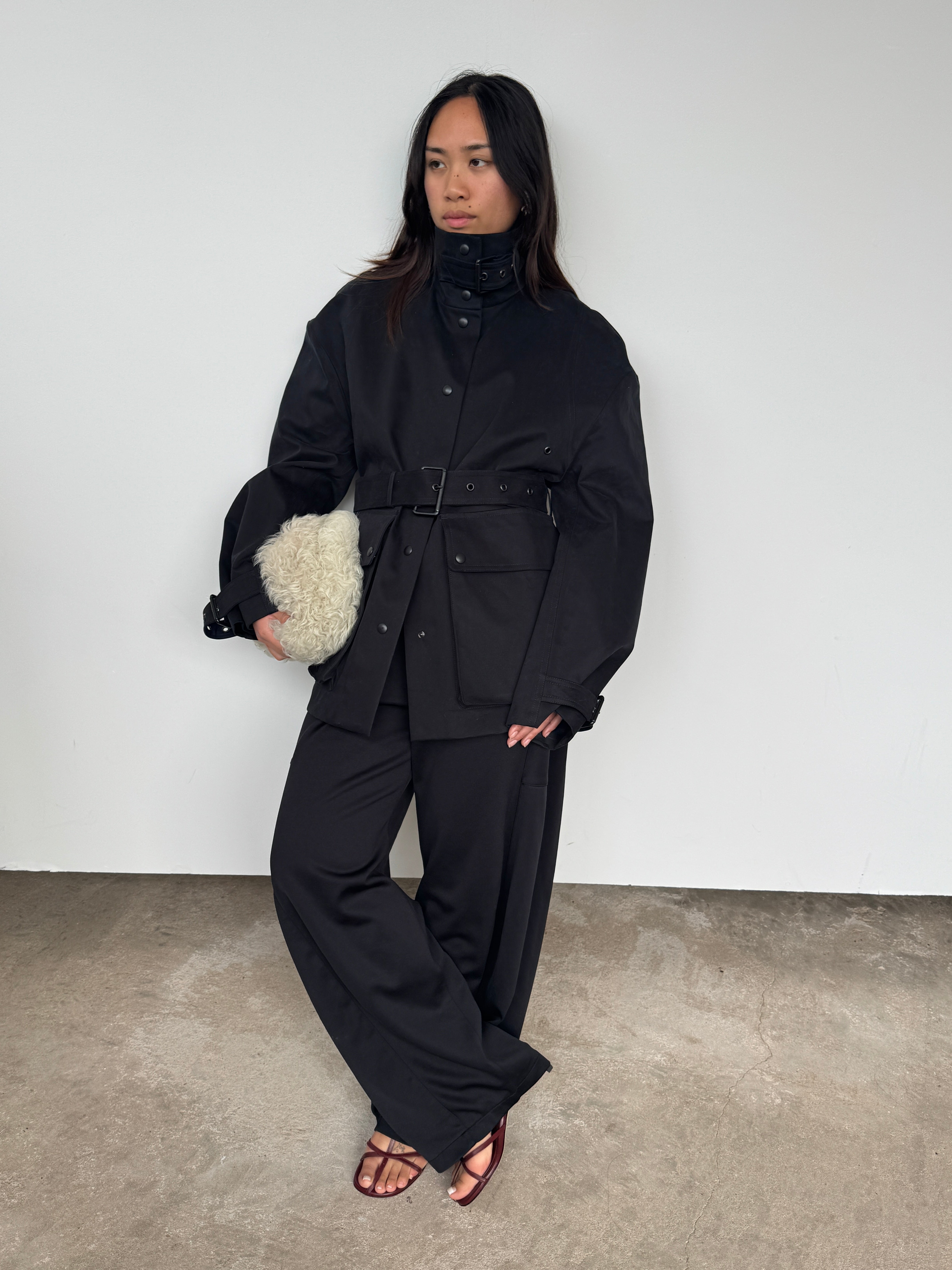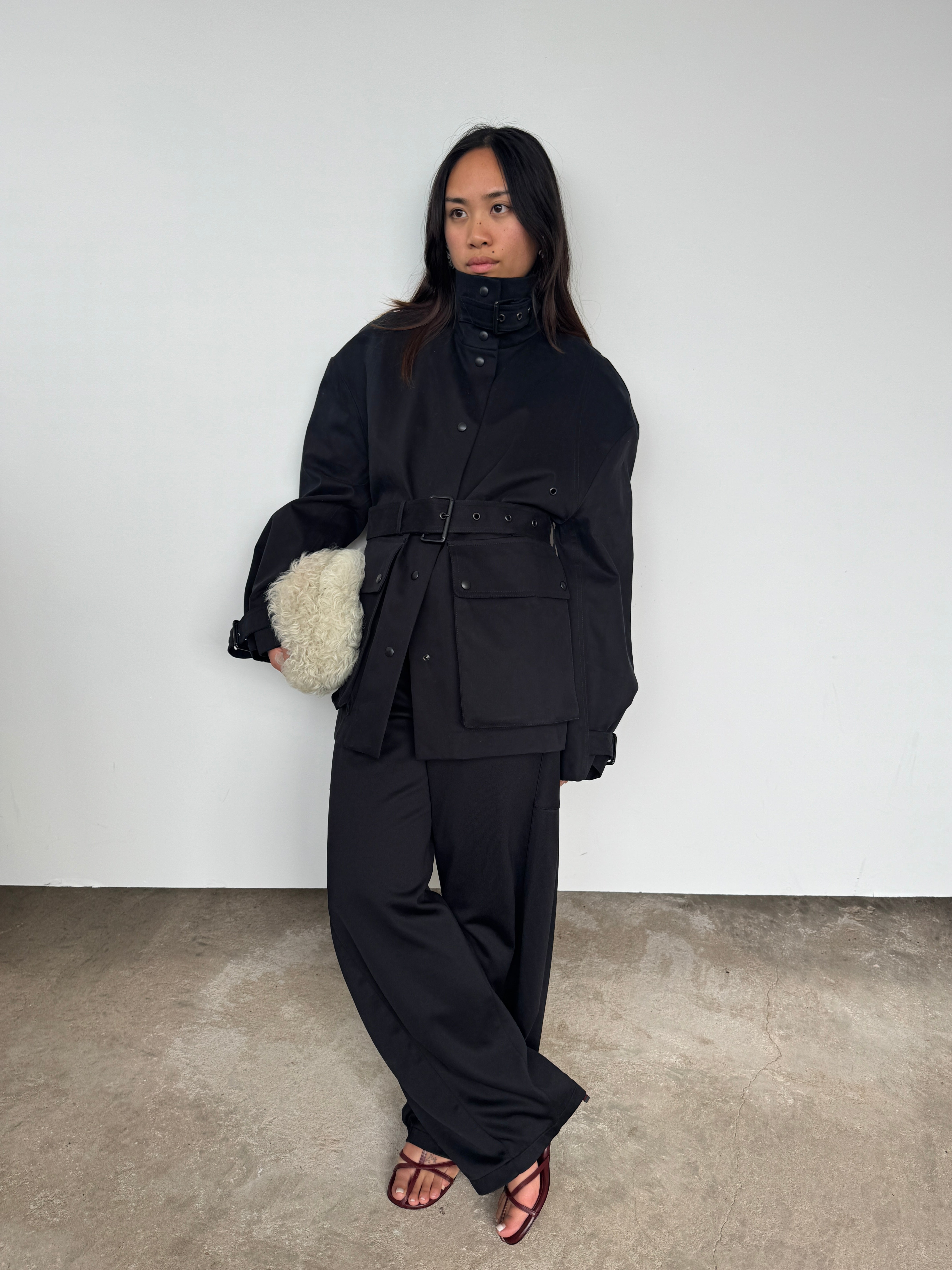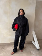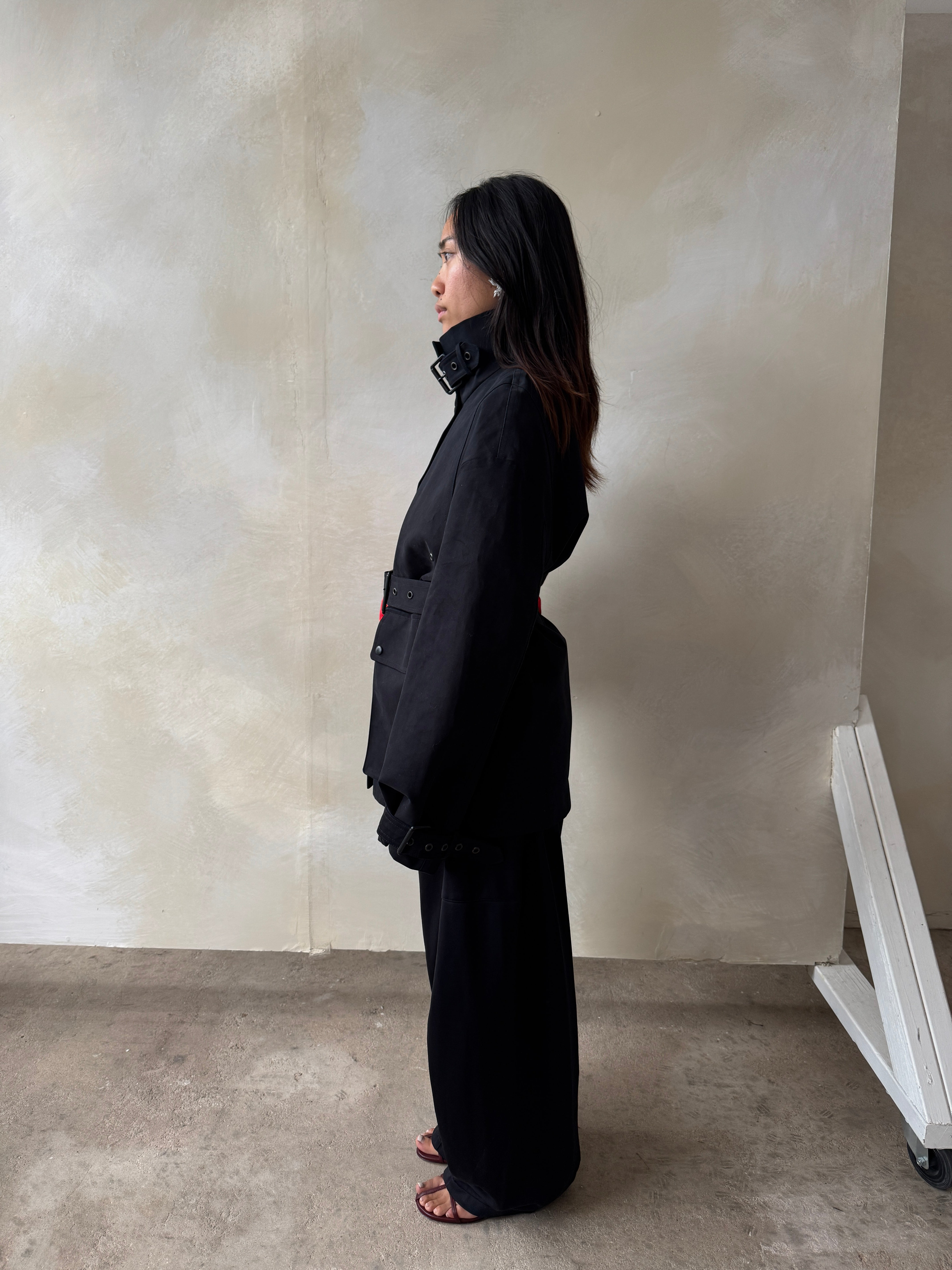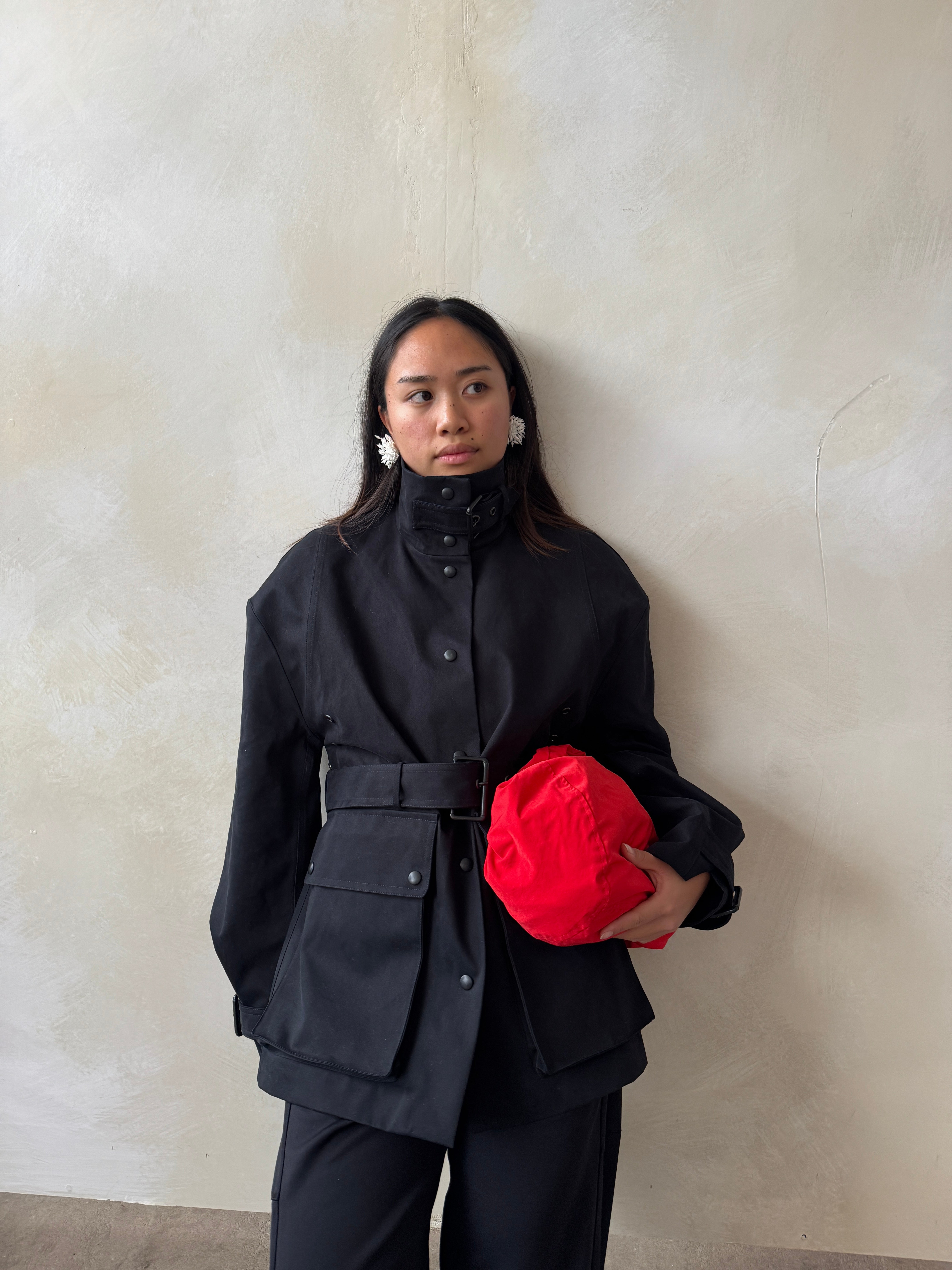 Expertly crafted from 100% rubberised cotton, this Raey jacket is designed with an intentionally oversized silhouette with a clean, structured form. Its versatile weight makes it ideal for layering over cosy knitwear in cooler months or wearing as a standalone statement piece in warmer weather. Use the belt to cinch the waist for a more defined shape, or leave it loose for a more relaxed feel. The hardware and clean lines give it a modern, utilitarian edge.