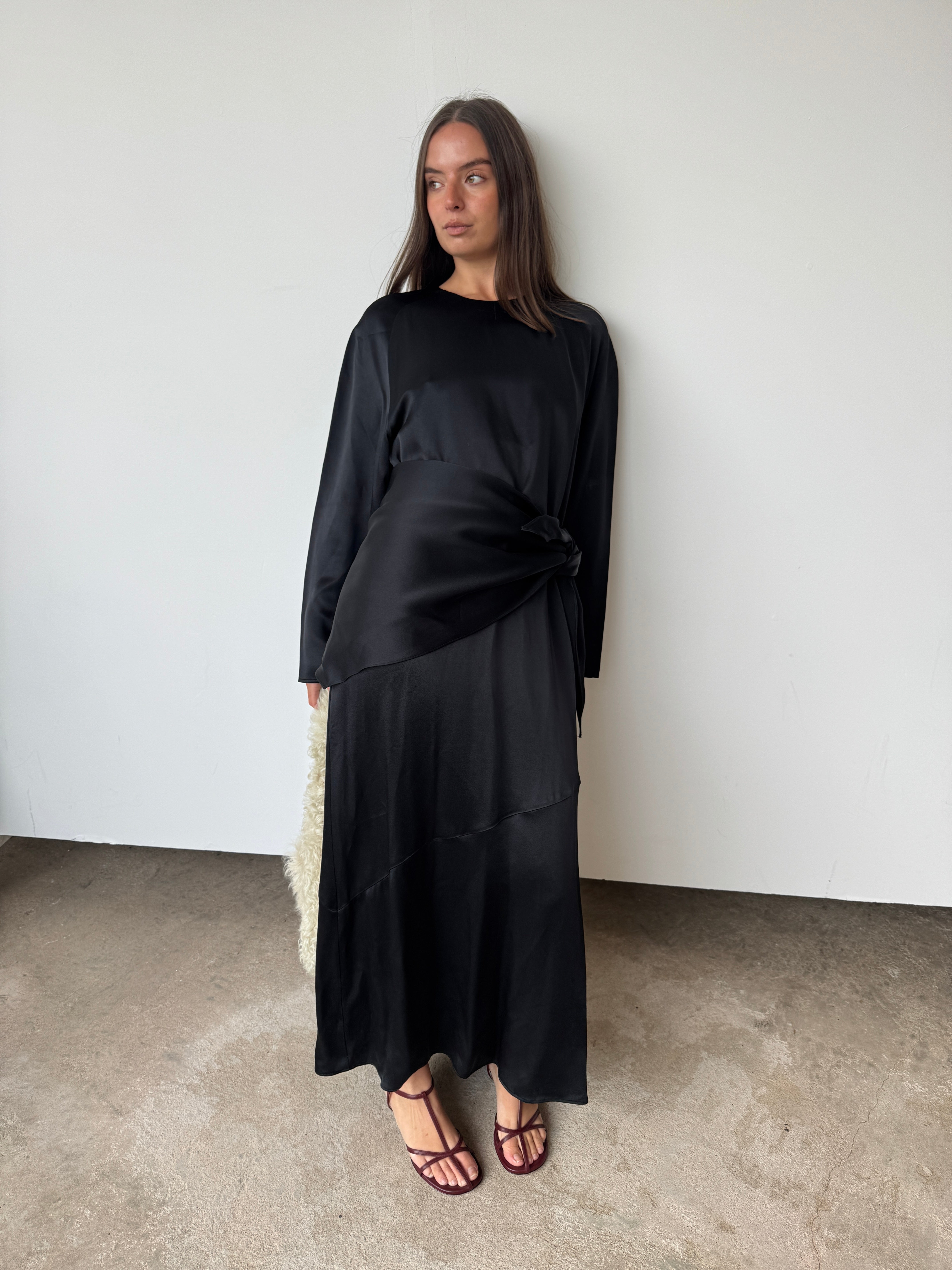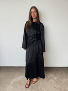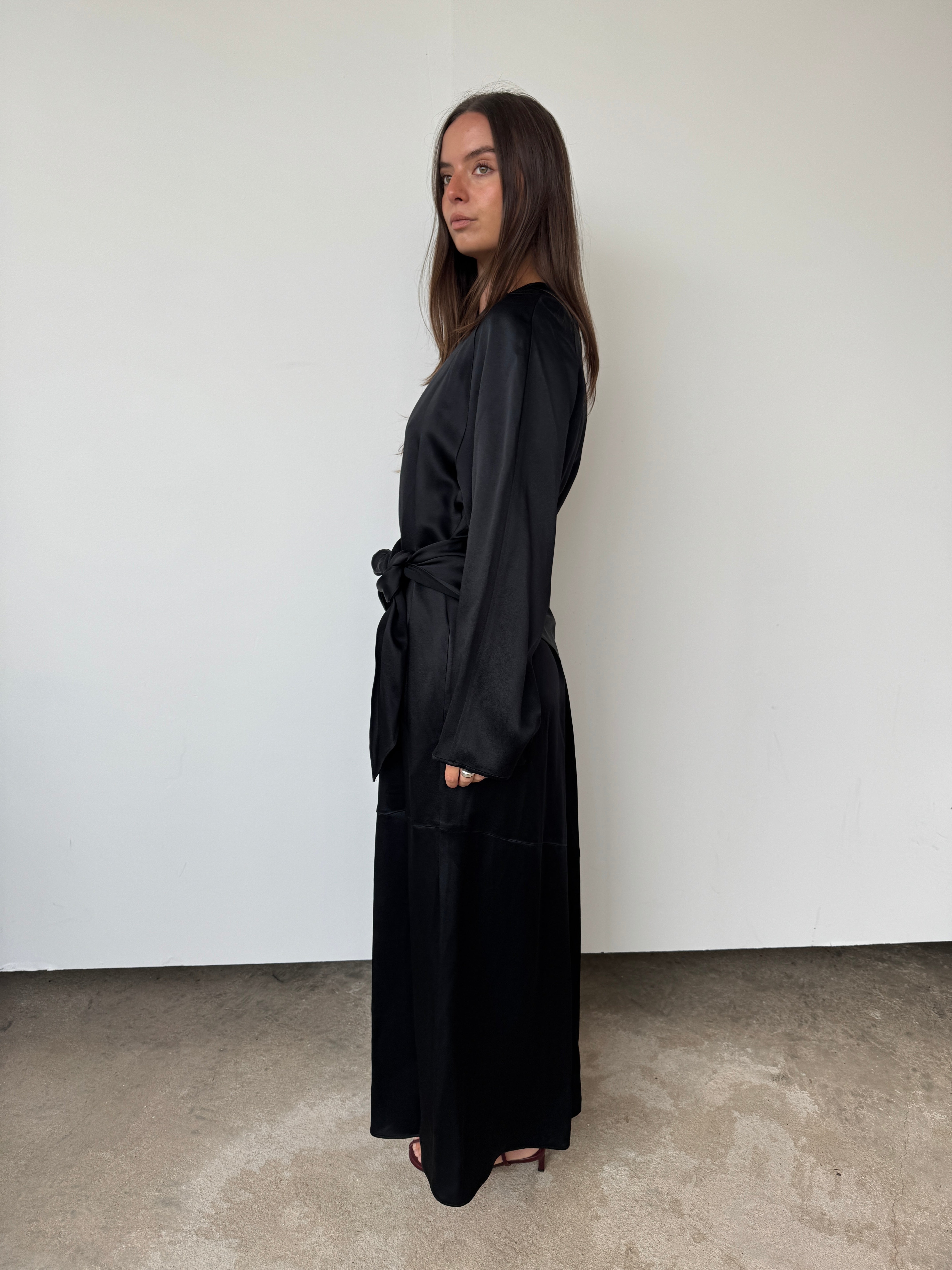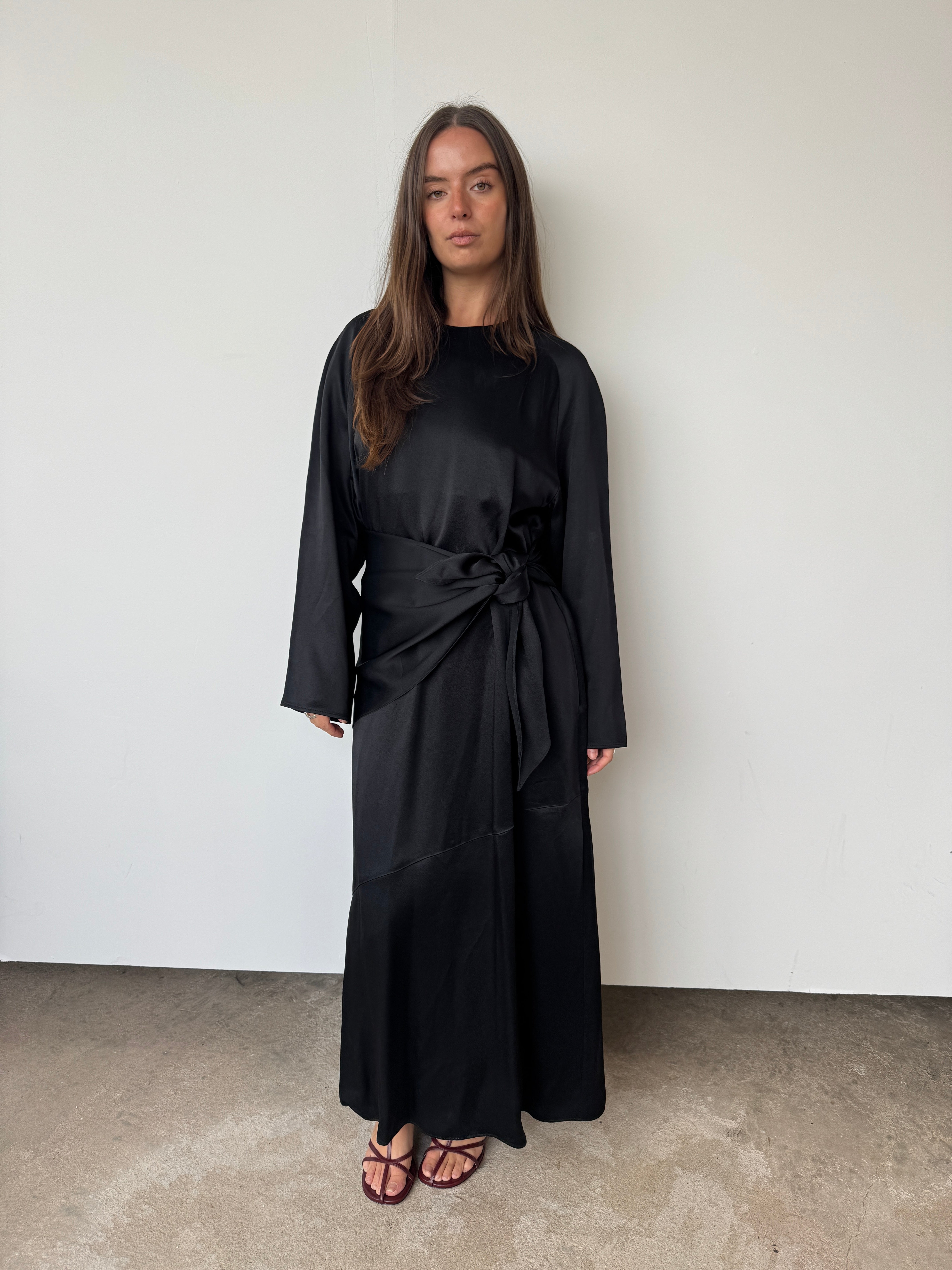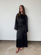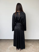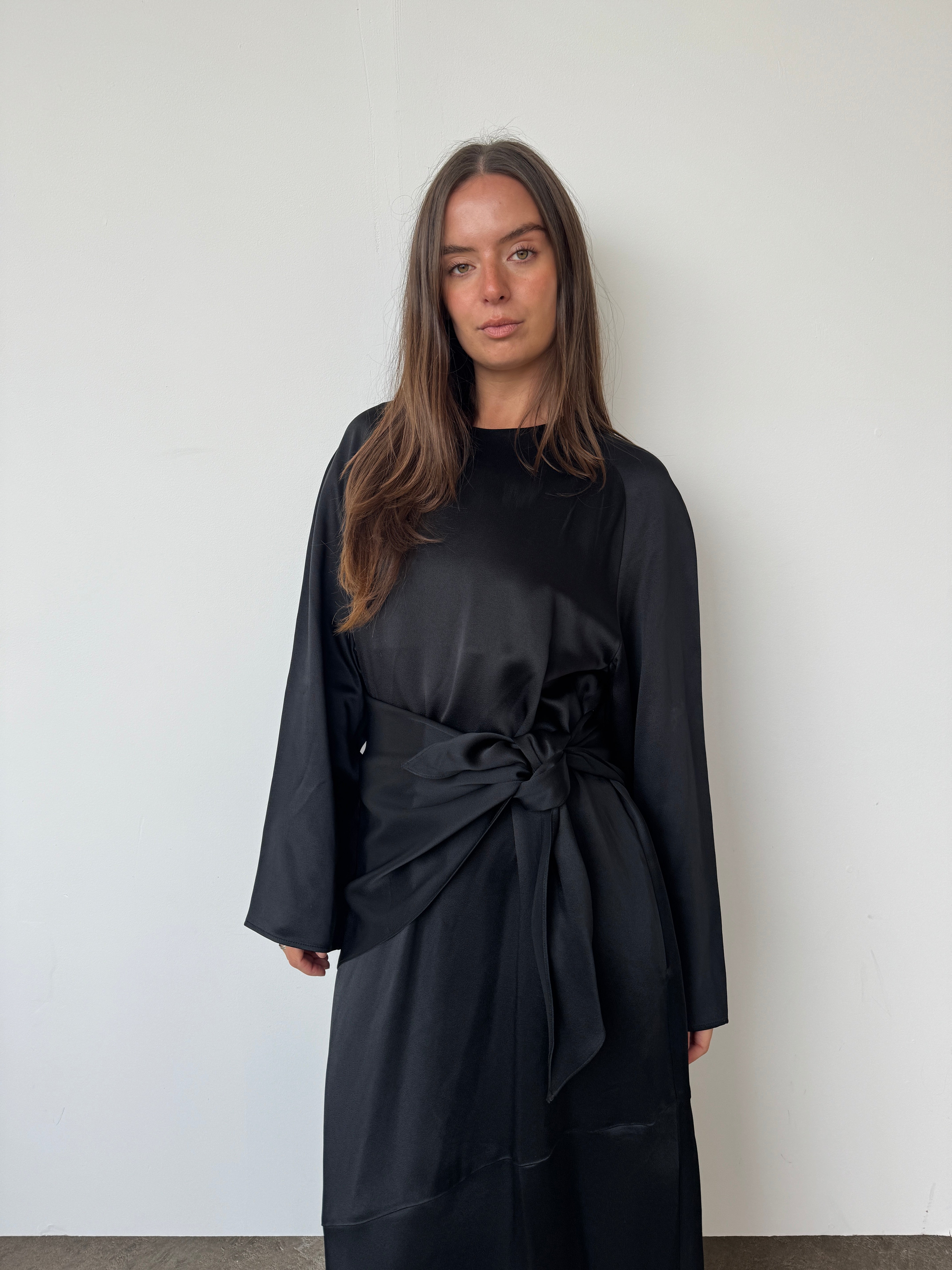 Designed and made in Europe The Sasha dress is the ultimate easy dress made from Italian viscose acetate with a satin finish and a beautiful weight and drape. The dress features raglan sleeves, a generous loose-fitting body with an angled seam across the skirt for movement and flow. It is slightly longer at the back for added detail. The opening is an edge-to-edge split on the back neck with a button fastening, allowing versatility in ways to wear. You can wear this dress back to front, with an open neckline. It has hidden side pockets. The dress also has a diamond shaped matching scarf that offers multiple styling options; a scarf, a top, a belt, a head scarf.
