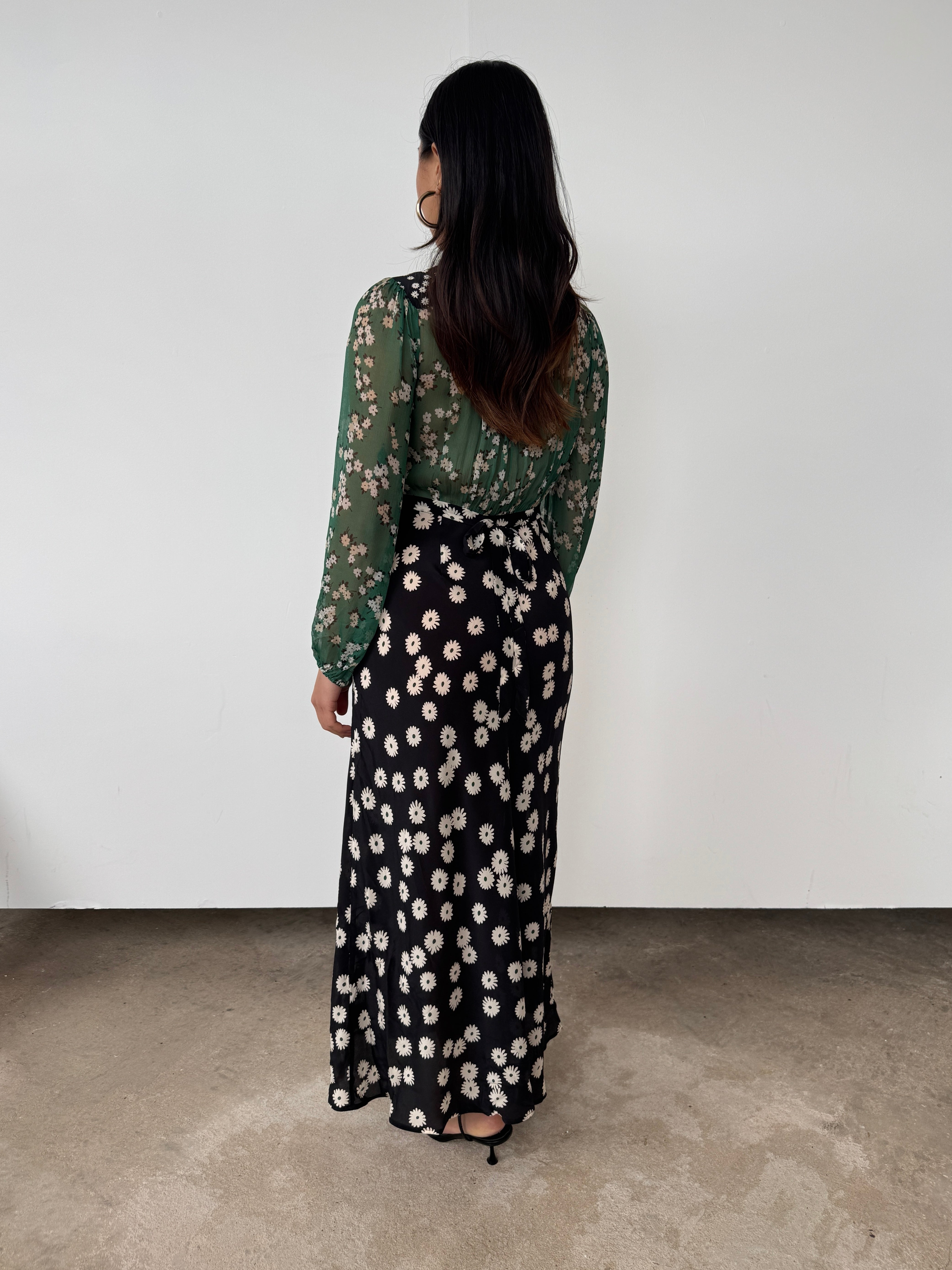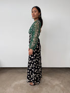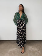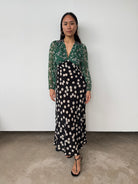 "1970s-inspired but with a RIXO twist, Kaila is a new classic. The contrasting prints bring a dose of bold, maximalism to a timeless shape. Throw on your favourite RIXO ankle boots for a vintage-inspired every day look or heels and a pair of statement earrings for special nights to remember."