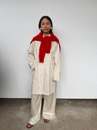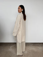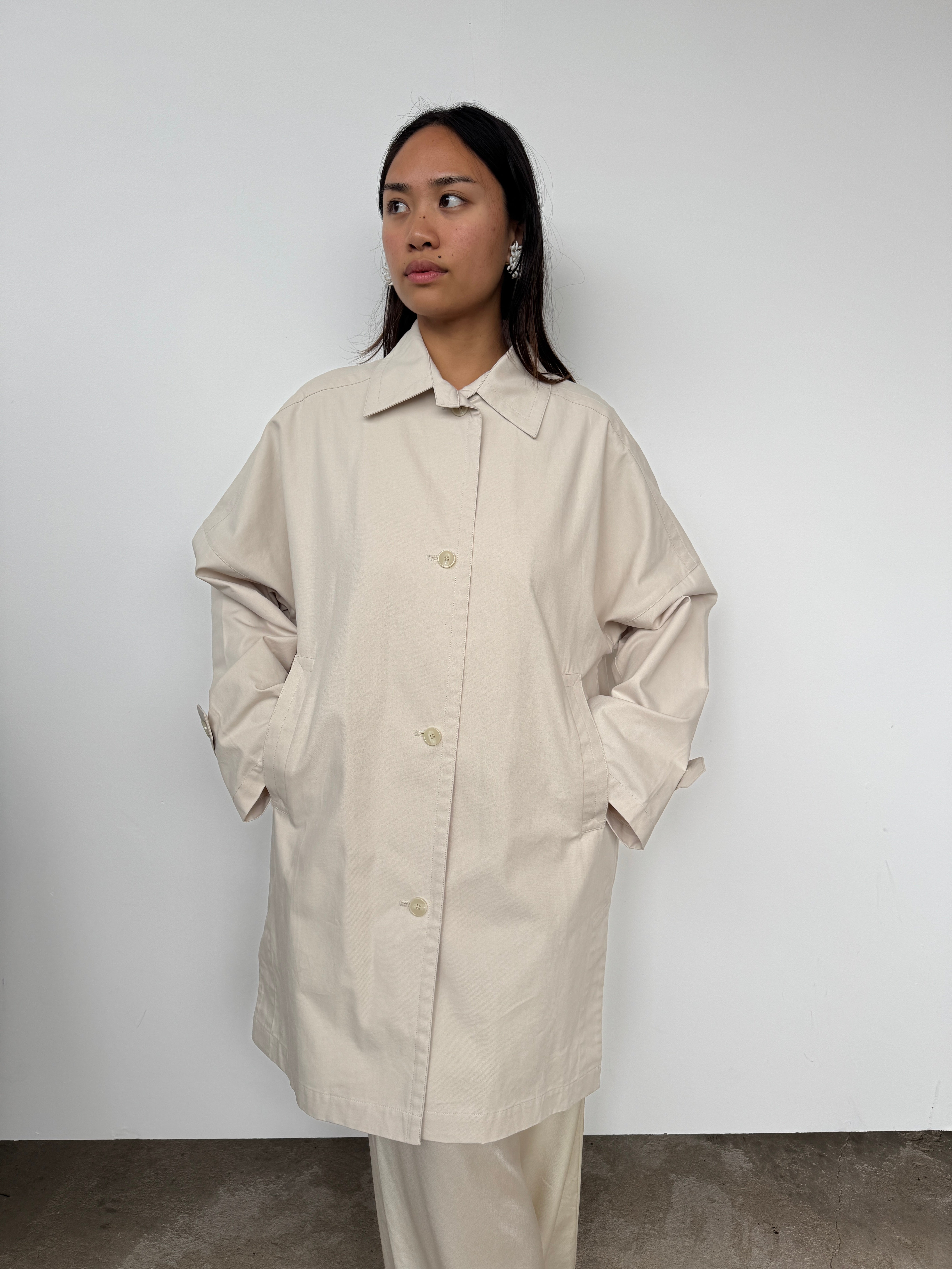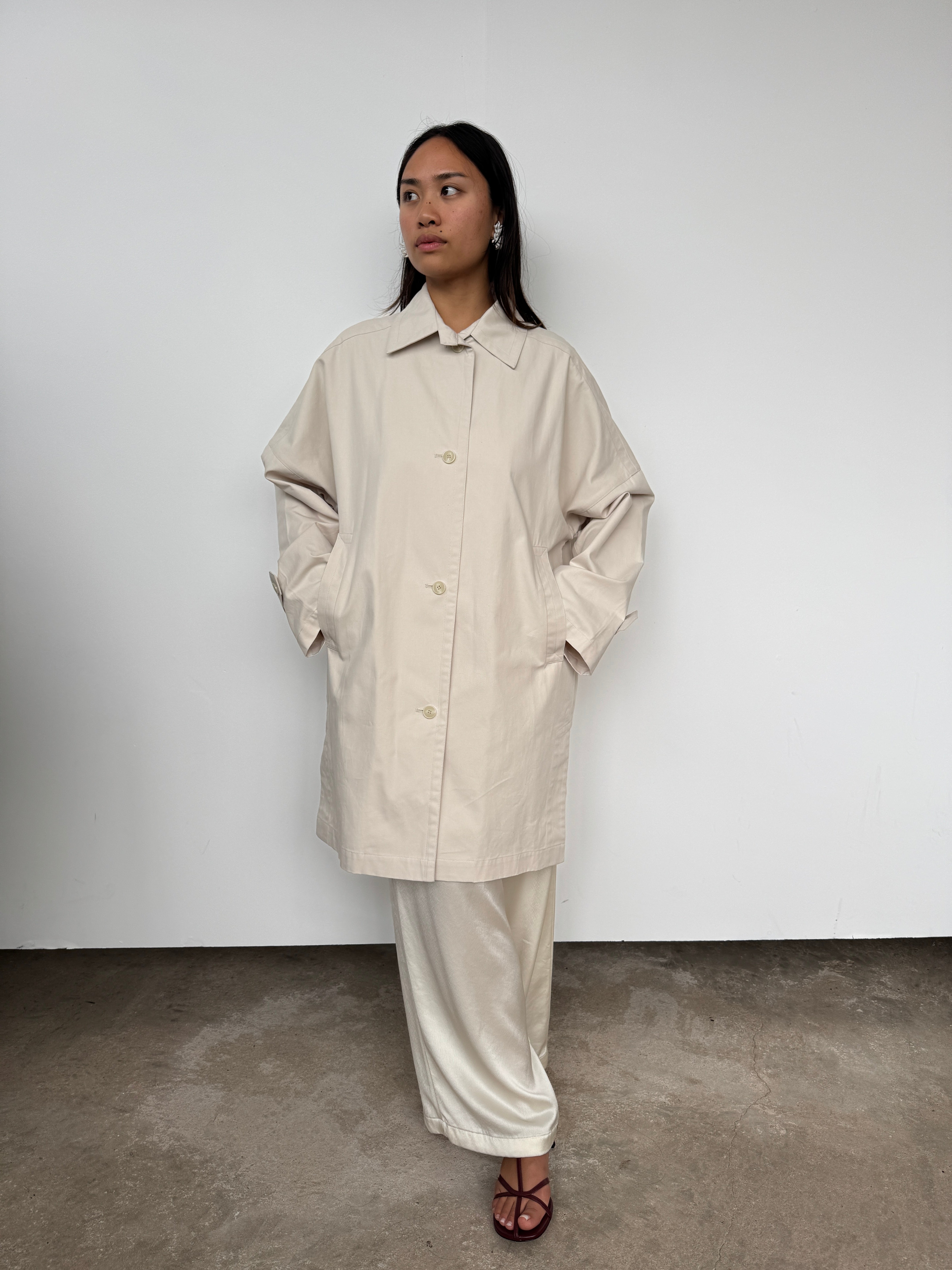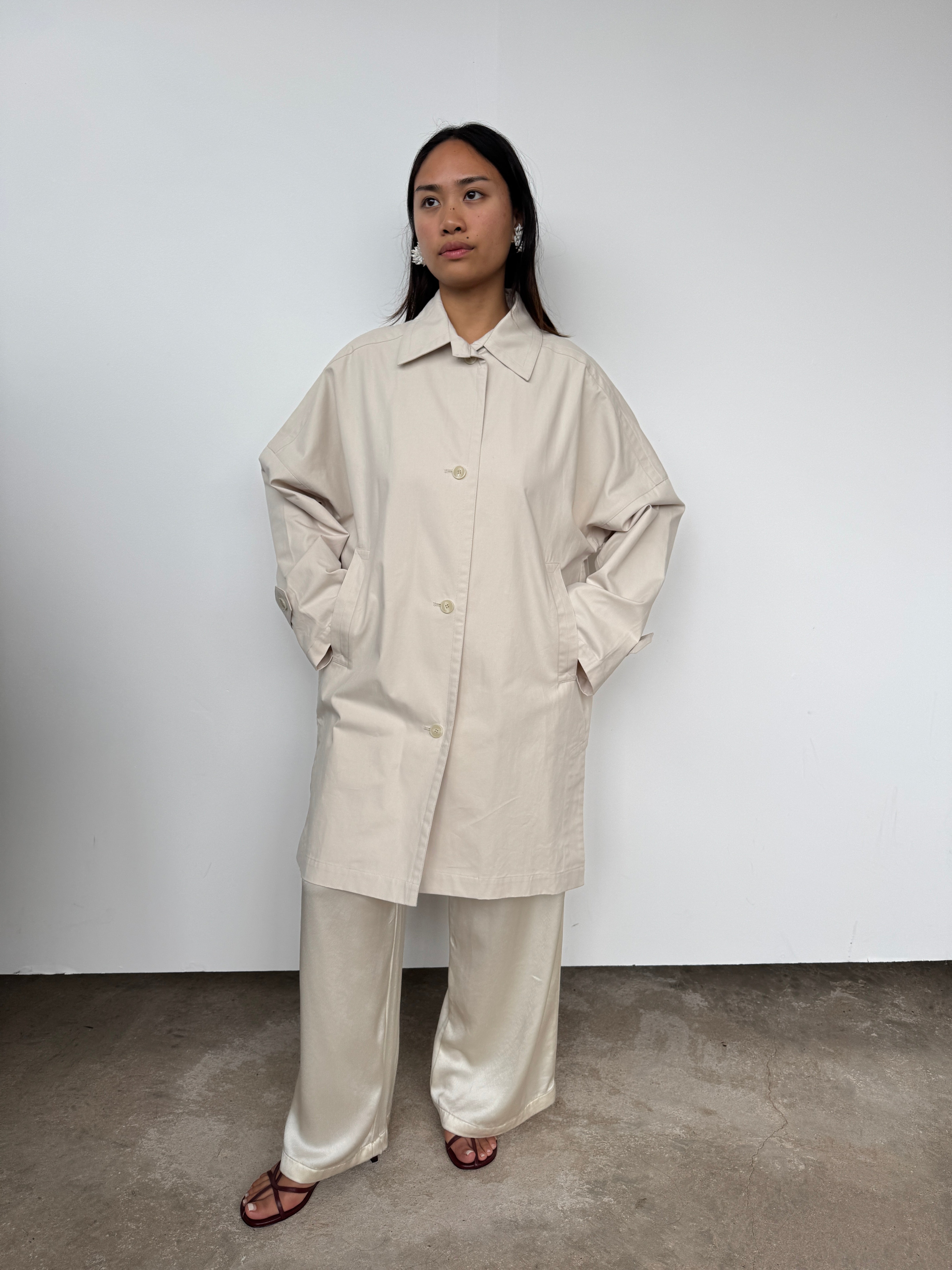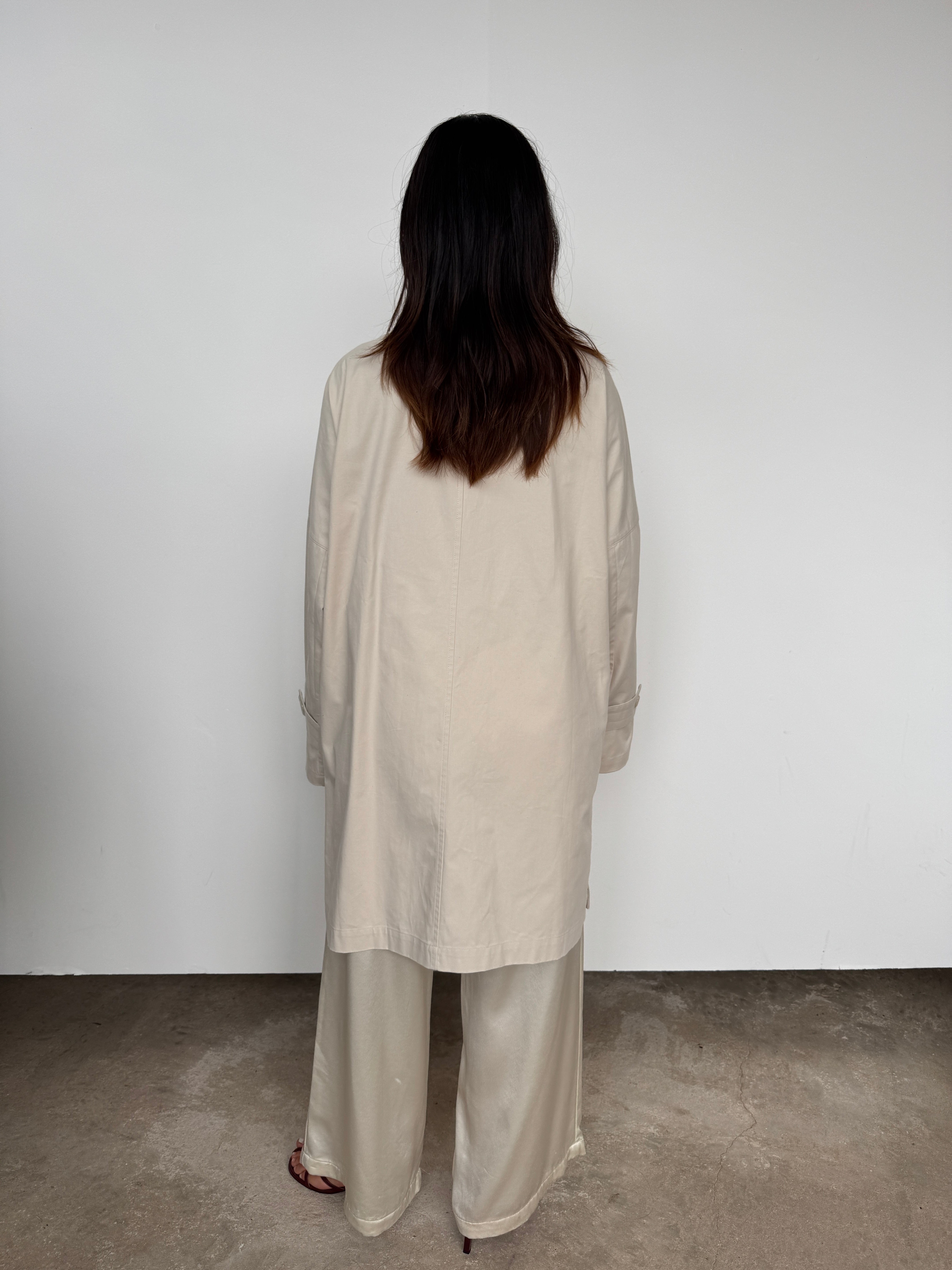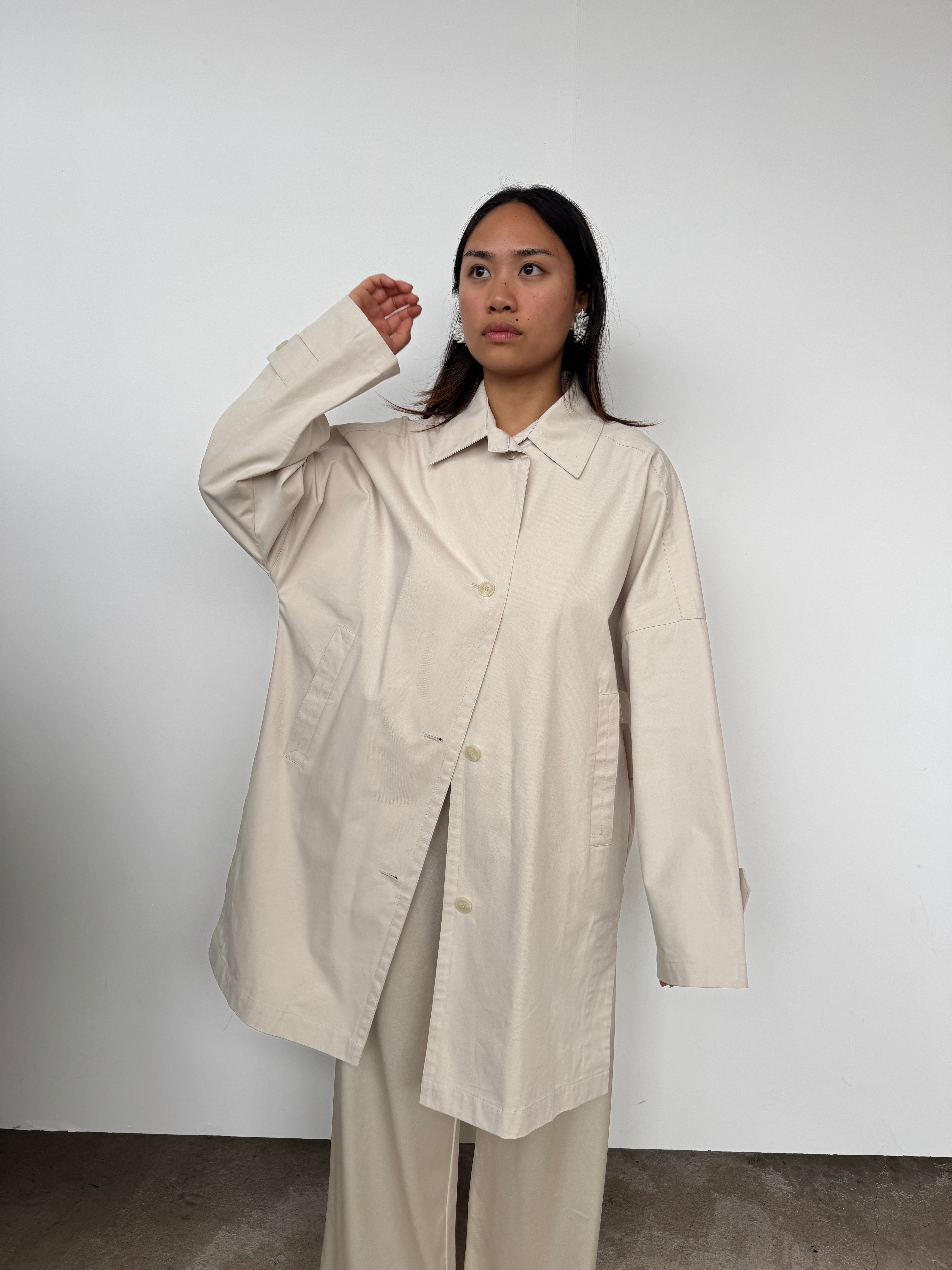 A relaxed silhouette crafted with thoughtful details, this oversized jacket features a midi length, front button closure, and side split for versatile styling.
