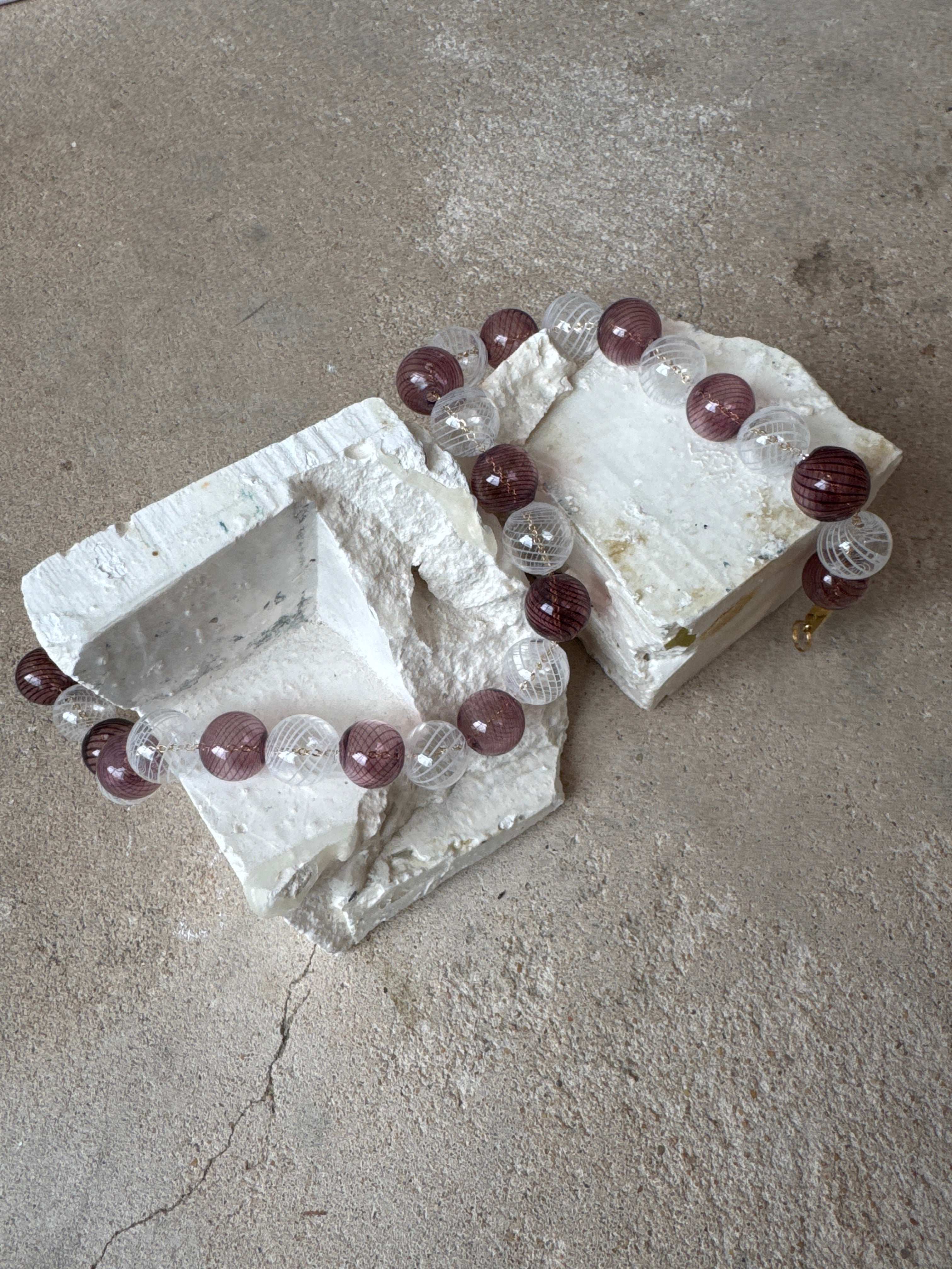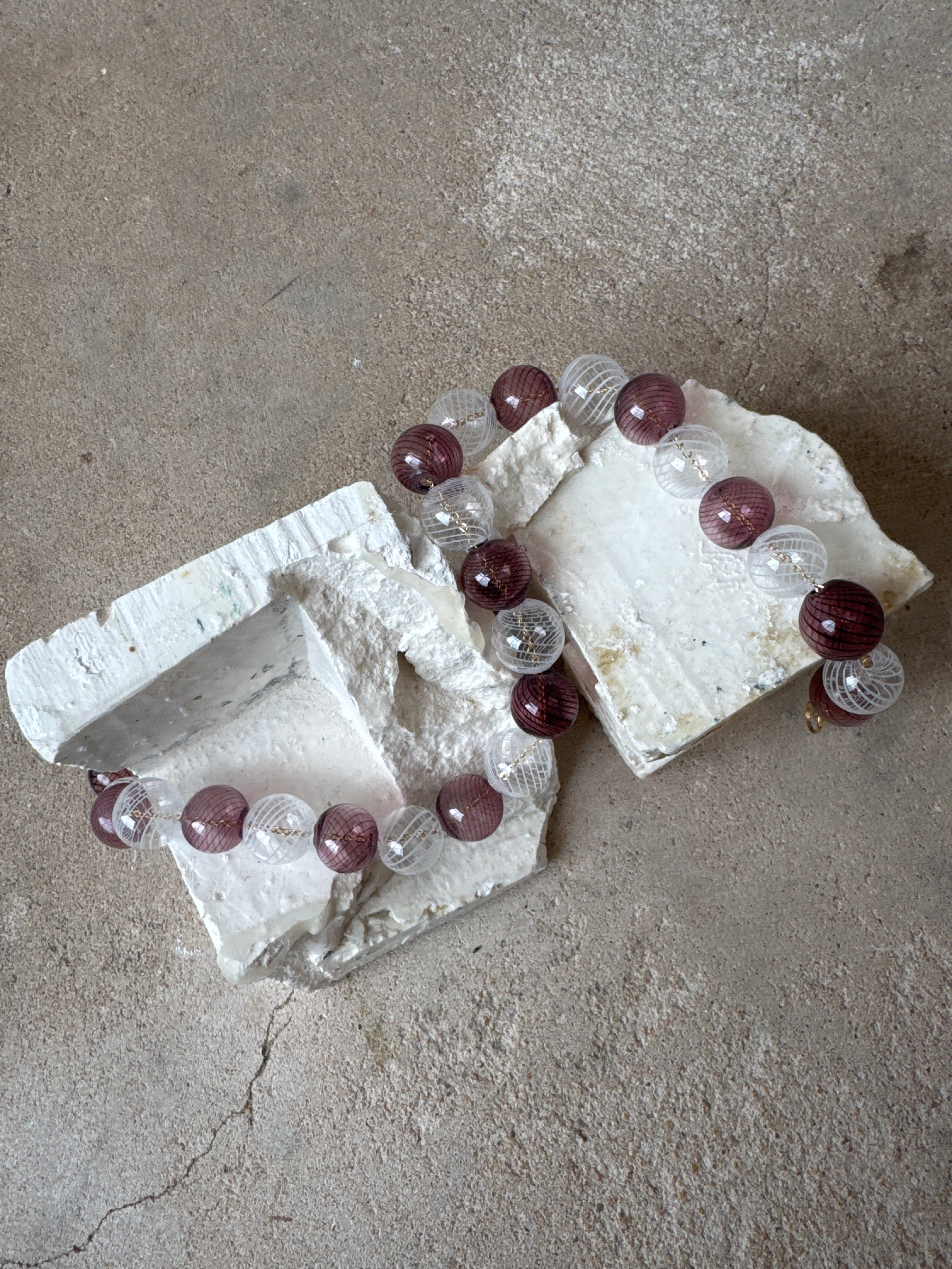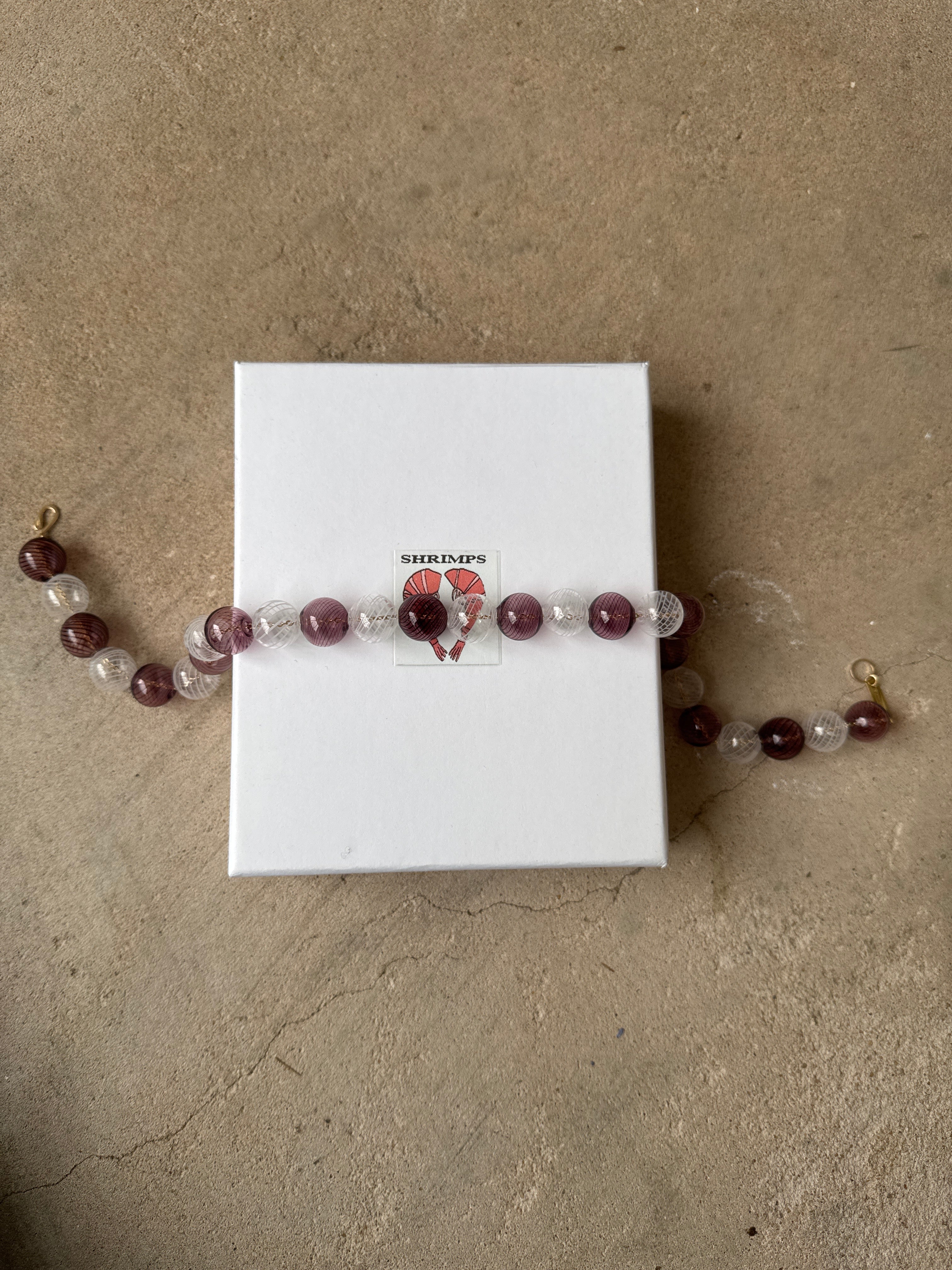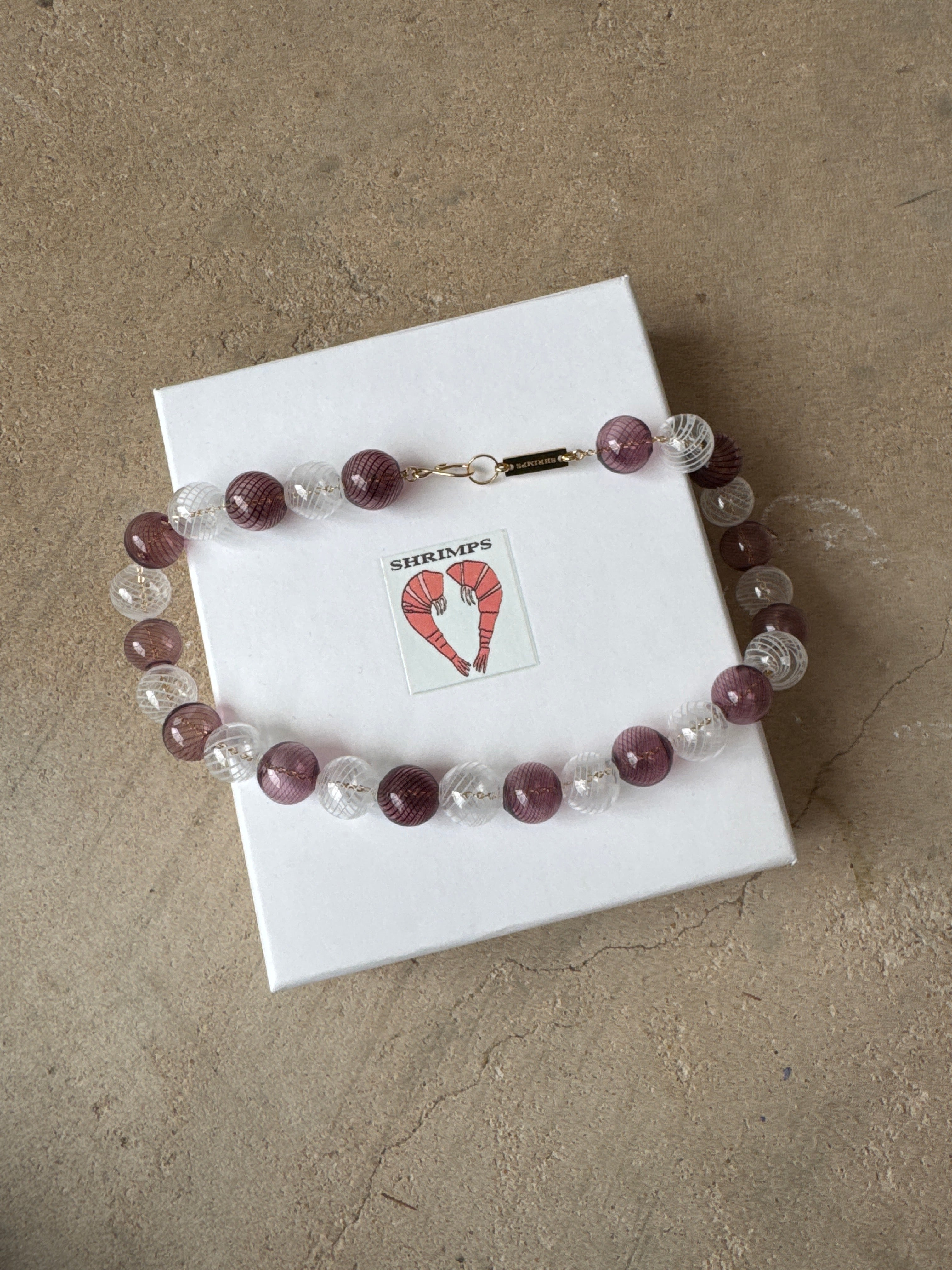 "The Mamie Necklace is a round neck design with hallow glass beads with a gold chain."
