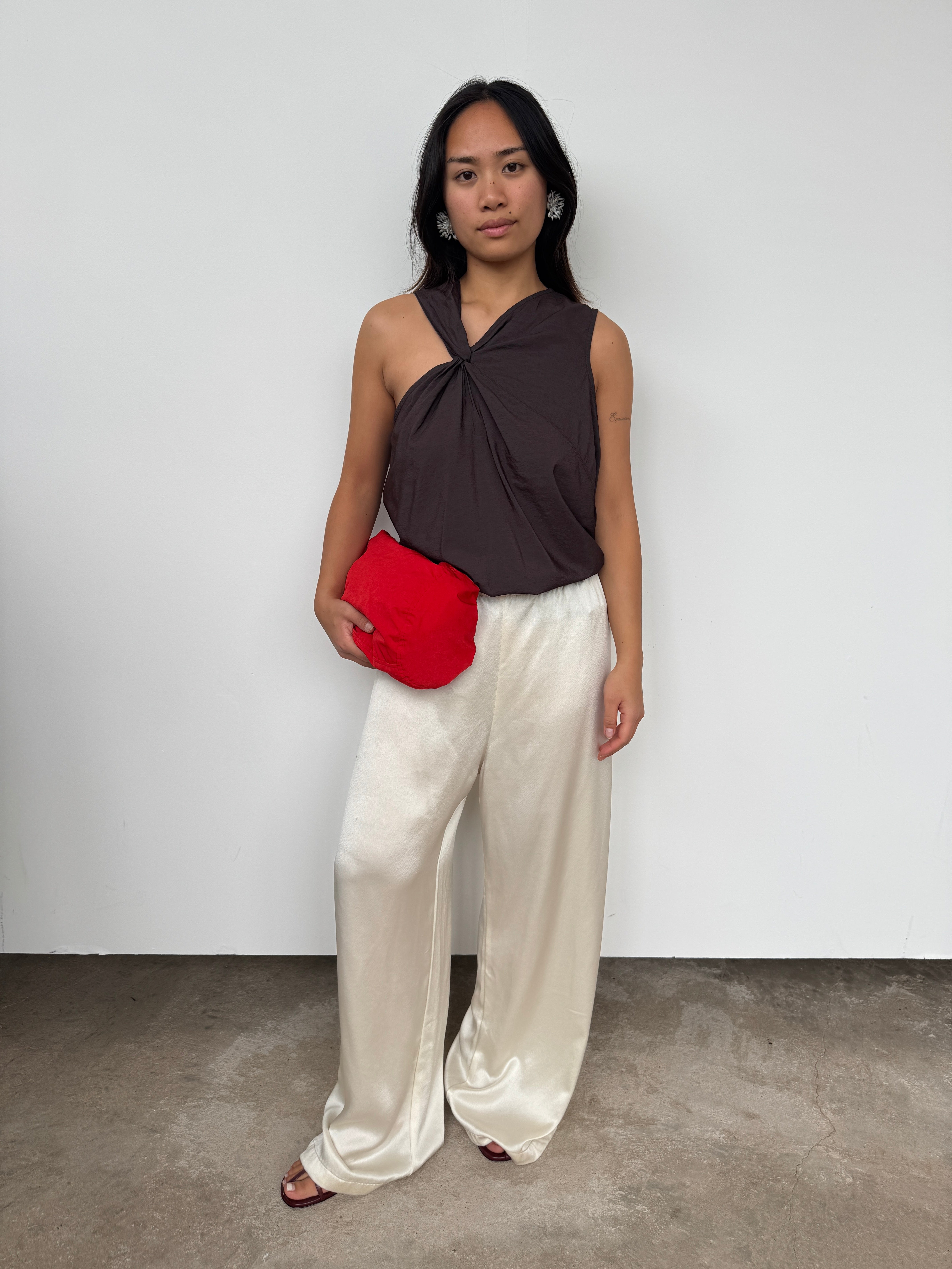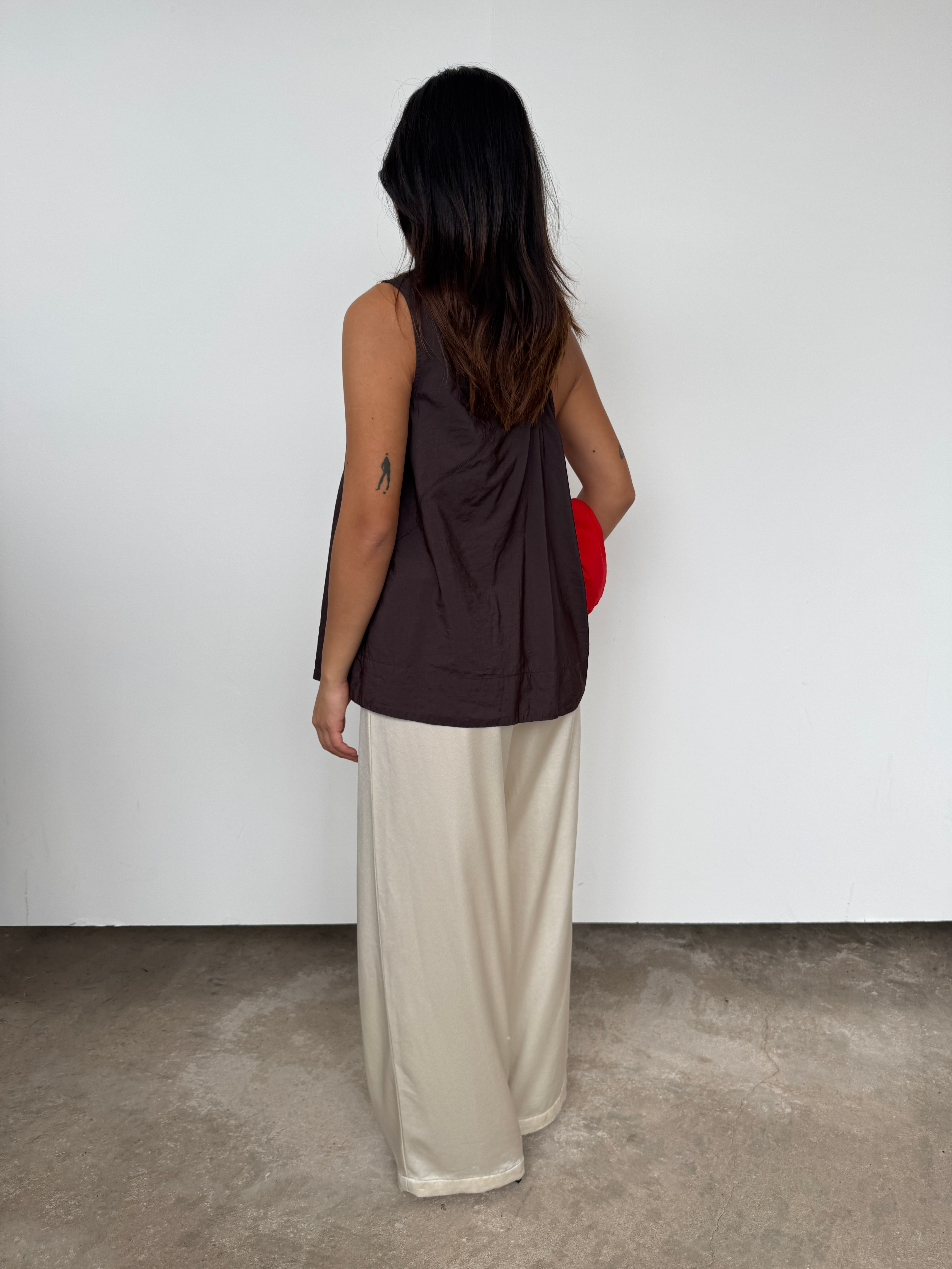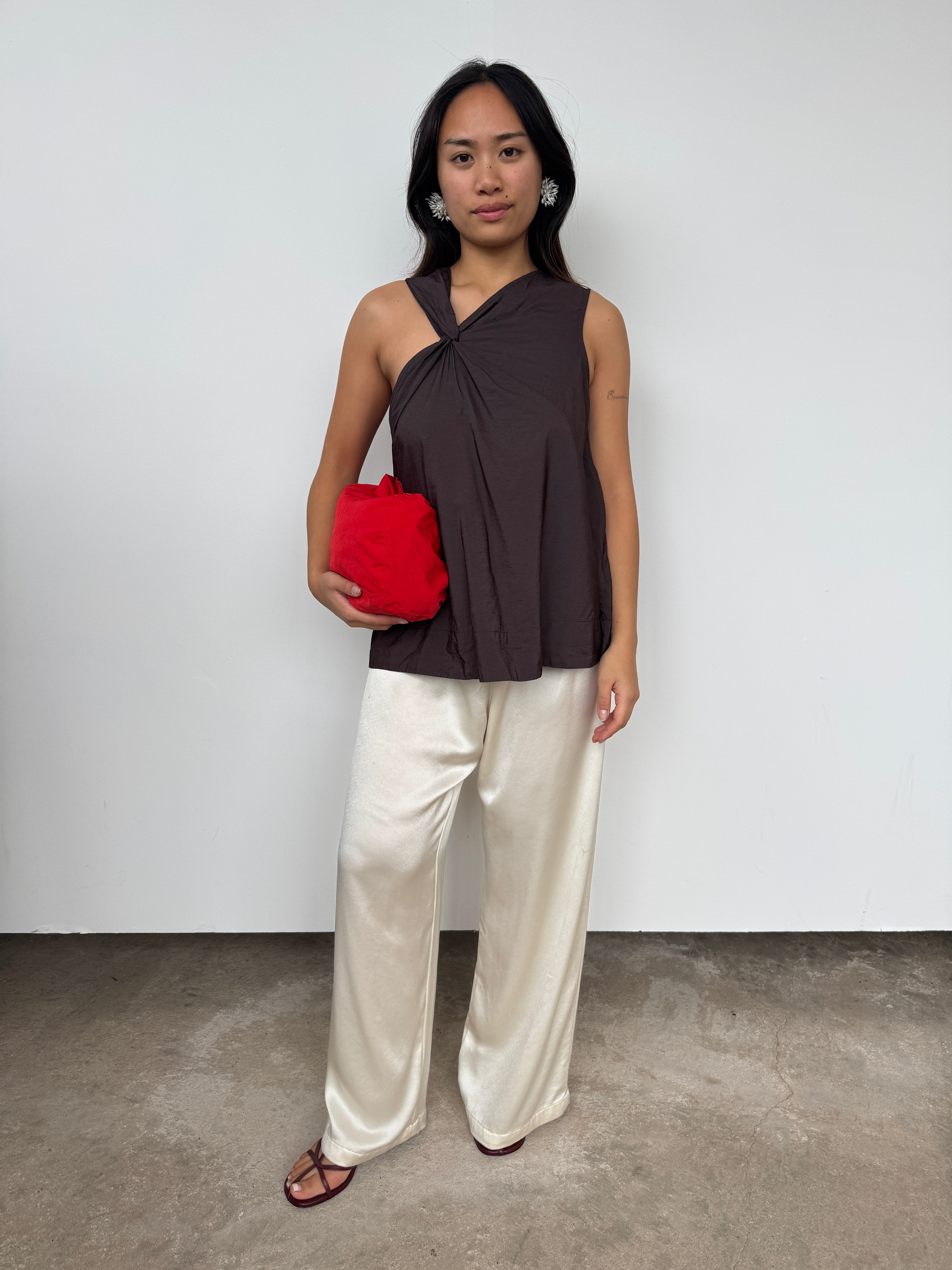 An asymmetric top with a front knot, featuring a side opening with an invisible zip for a sleek finish. The design includes a construction detail at the collar, adding a unique touch. Made from fluid viscose, this top offers both comfort and style.