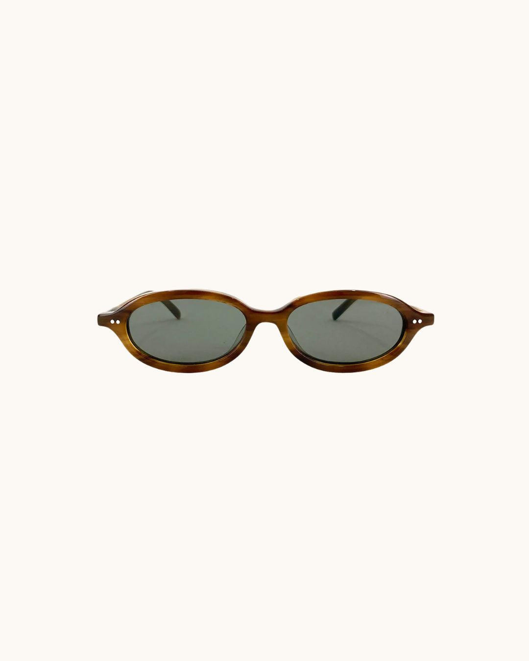"Paying homage to the iconic 90’s aesthetic, this sleek 90s Slim Oval Sunglasses frame is fitted with mineral glass lenses and finished with double-rivet accents. Comes with a St. Agni case and cleaning cloth"