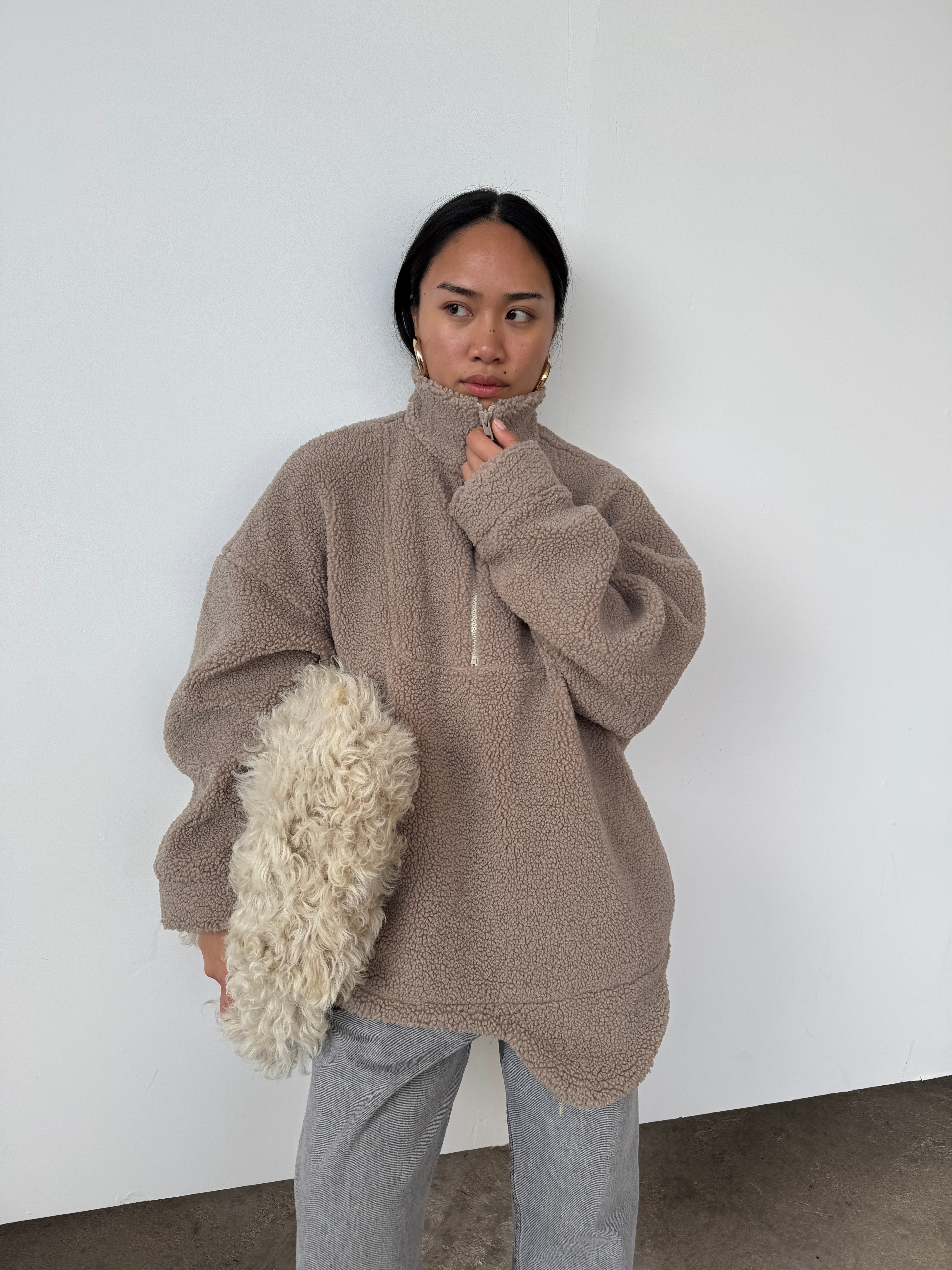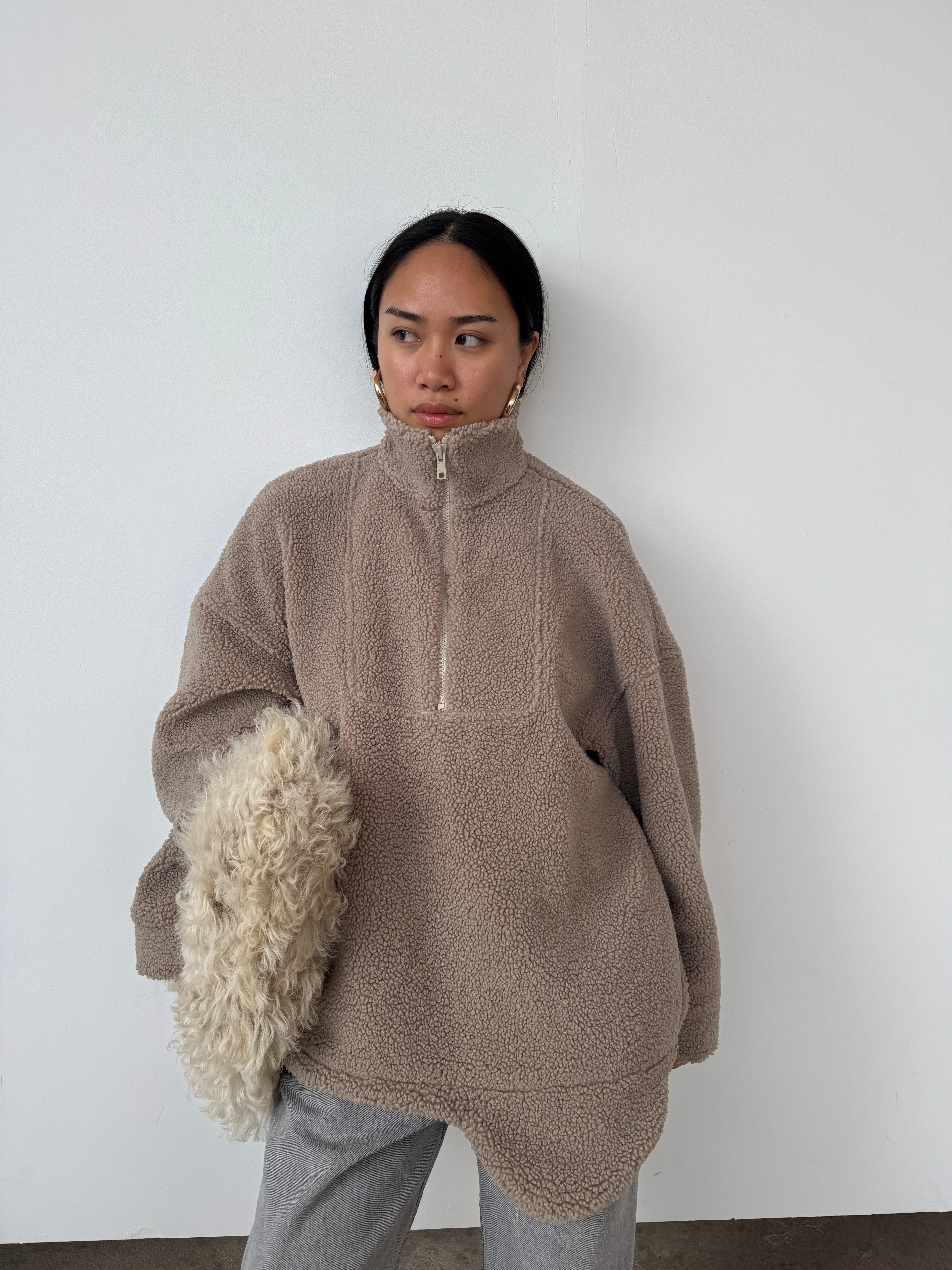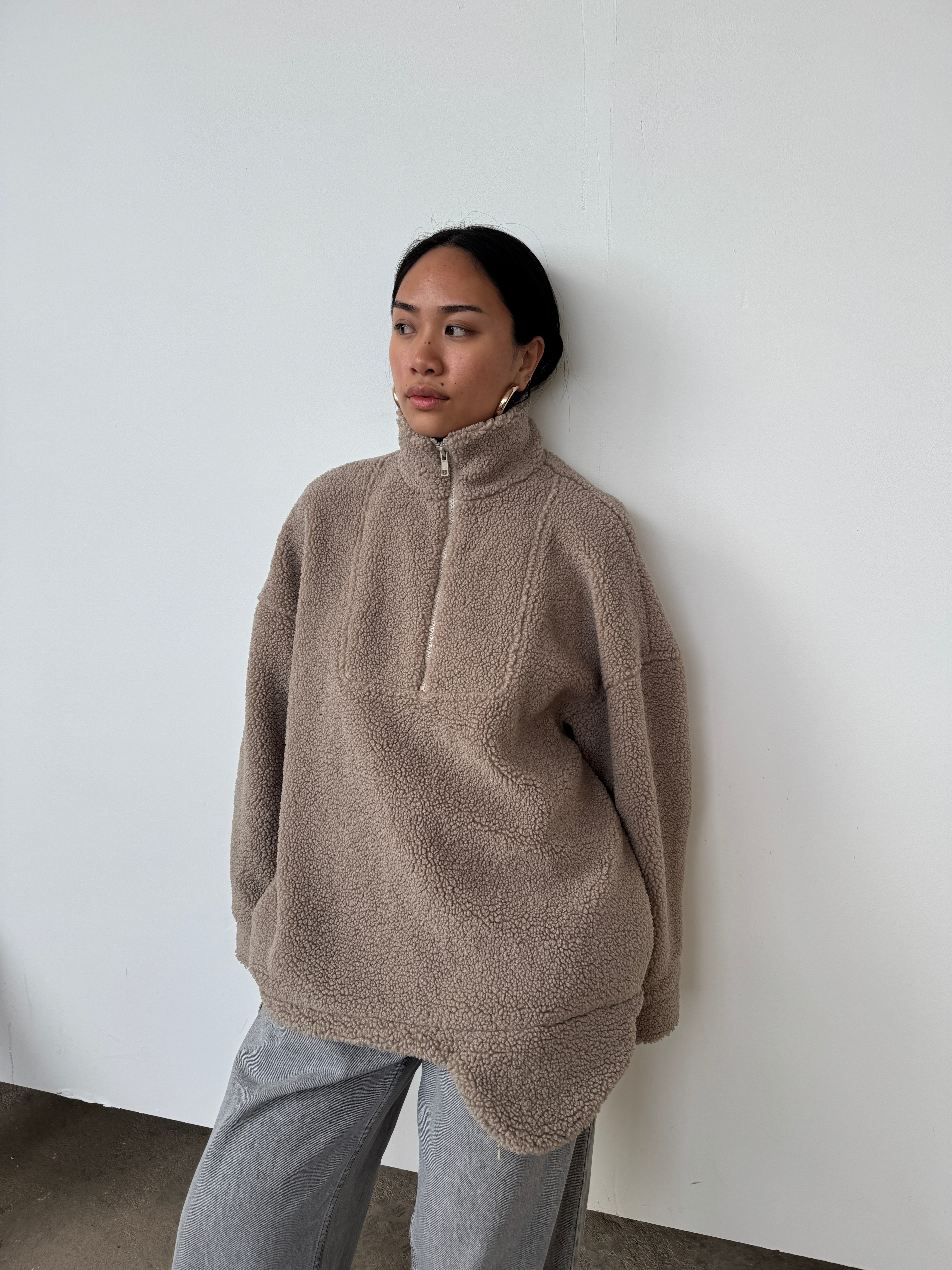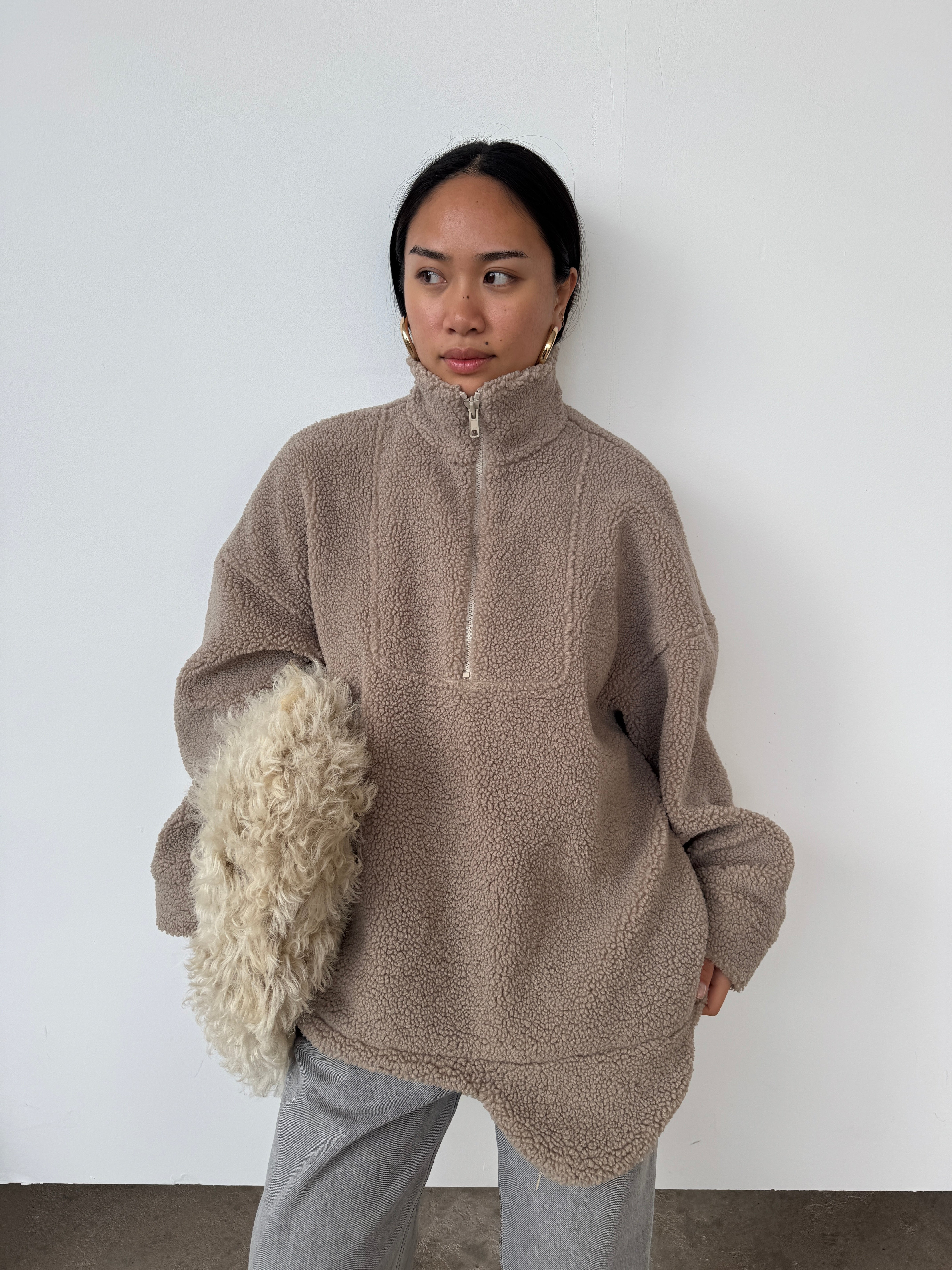 The perfect throw-on piece. So cosy, warm, and we love the interesting shape to the hem. Features a half-zip to the front, pockets, and as internal toggles to cinch the hem if desired. Please note, this piece comes up big