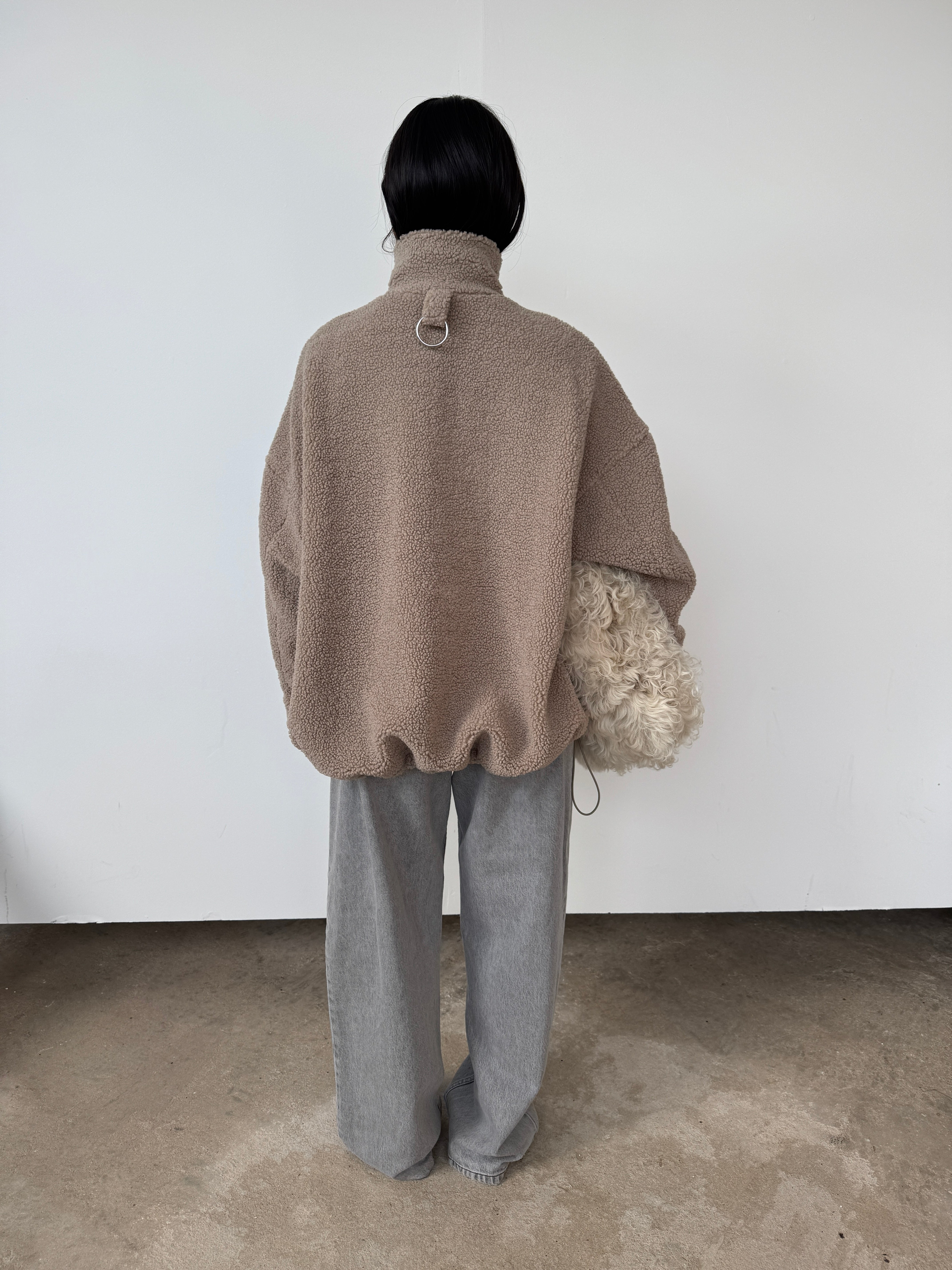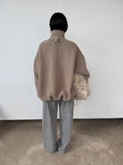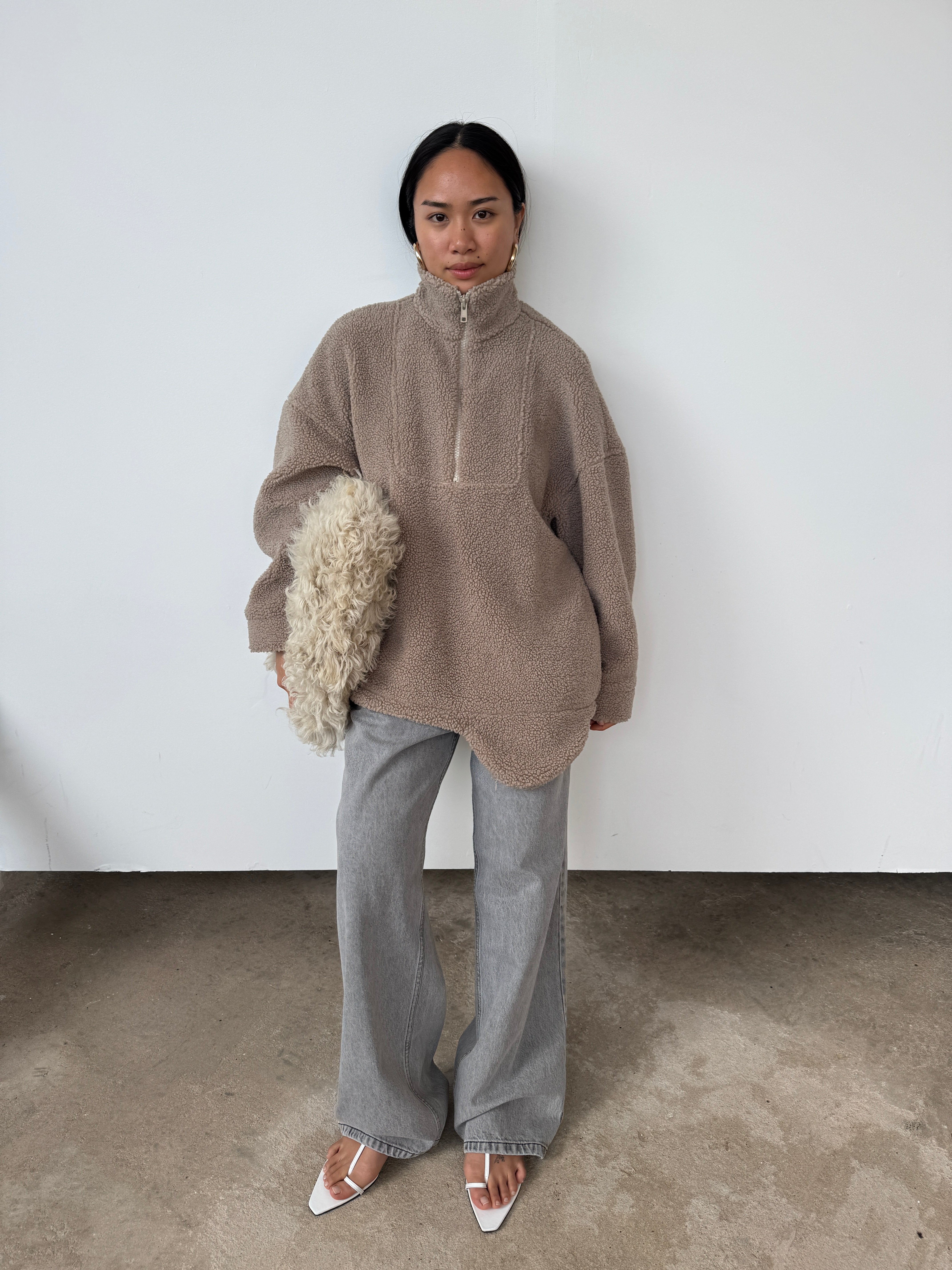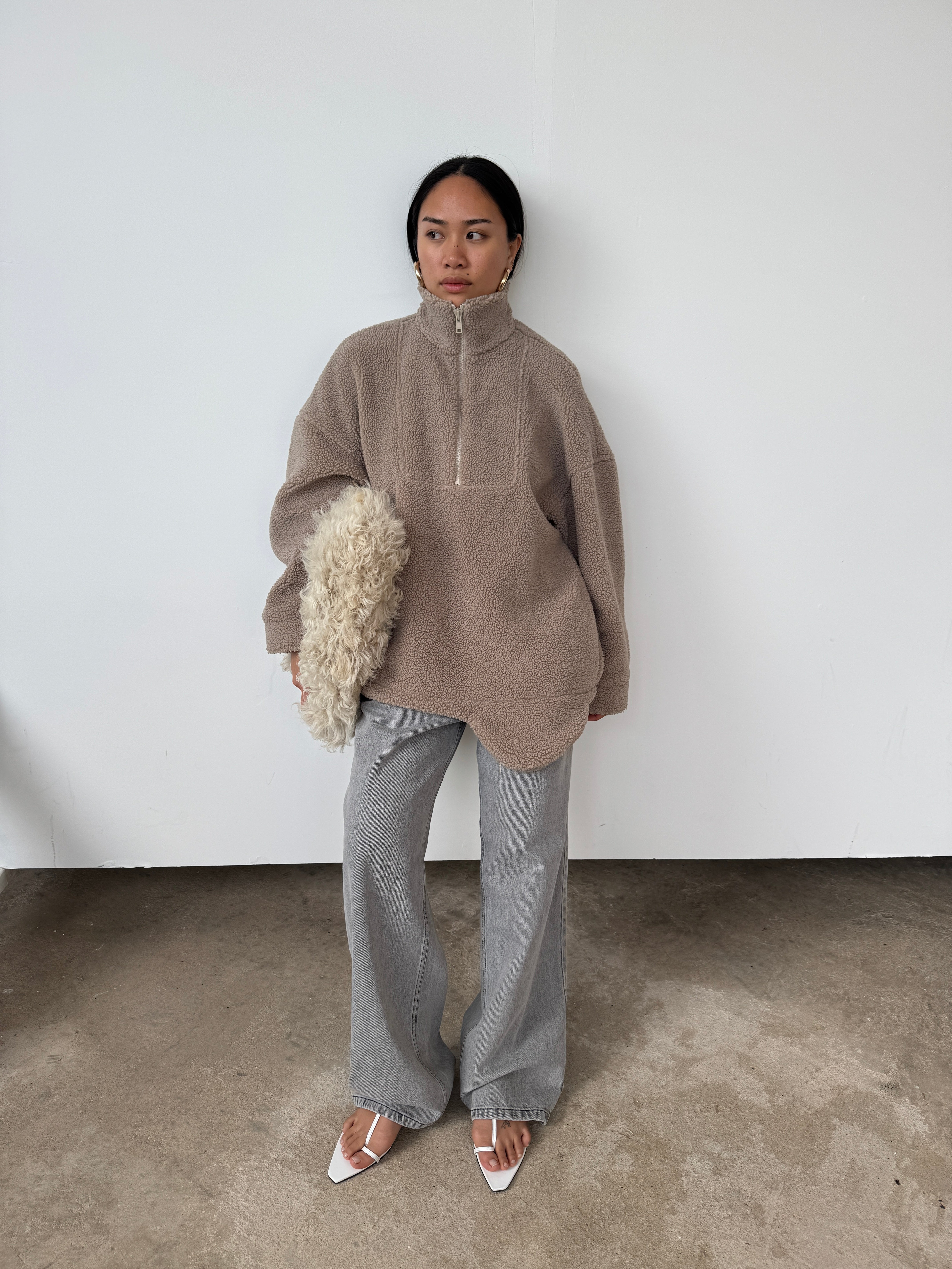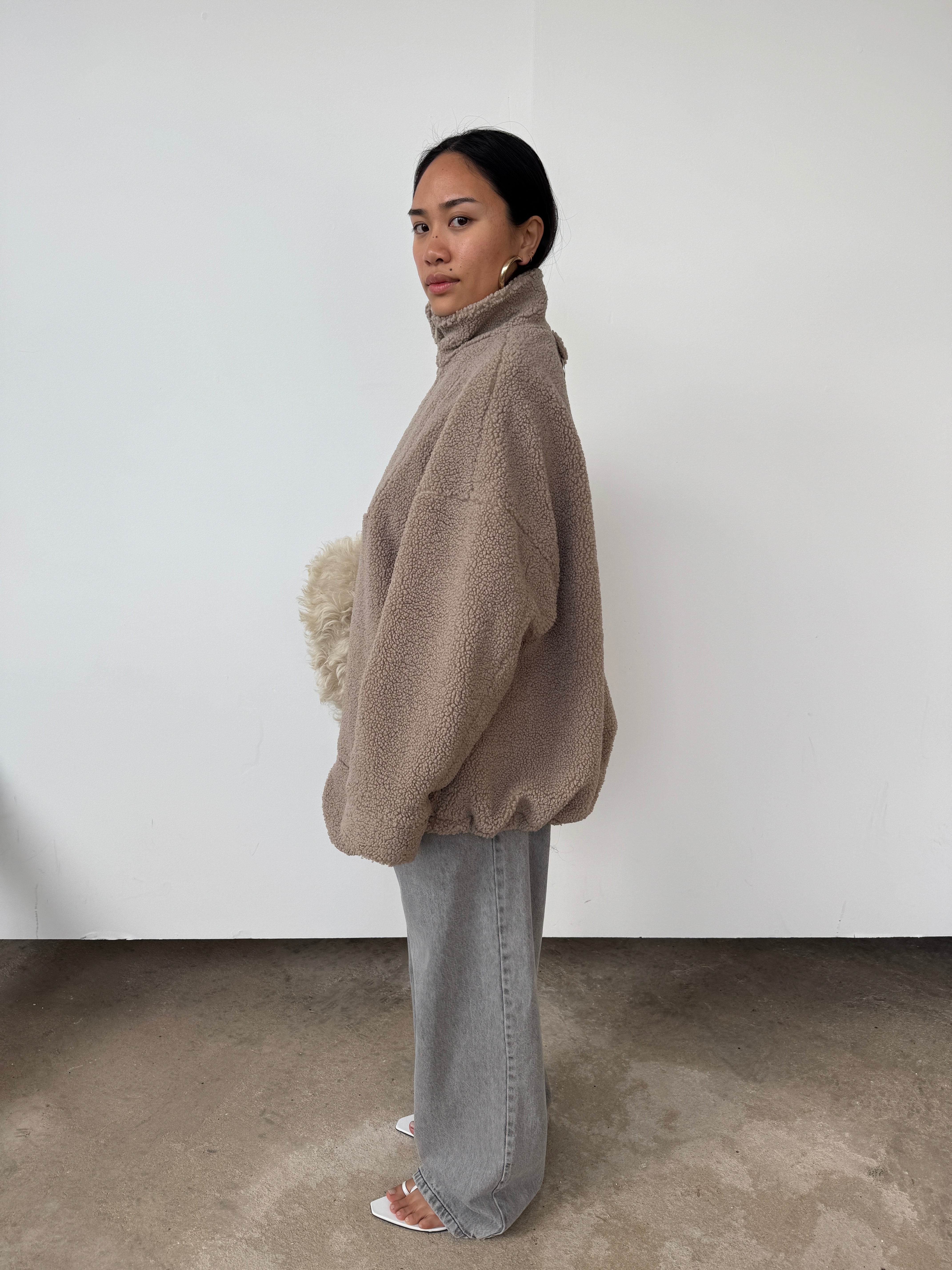 The perfect throw-on piece. So cosy, warm, and we love the interesting shape to the hem. Features a half-zip to the front, pockets, and as internal toggles to cinch the hem if desired. Please note, this piece comes up big