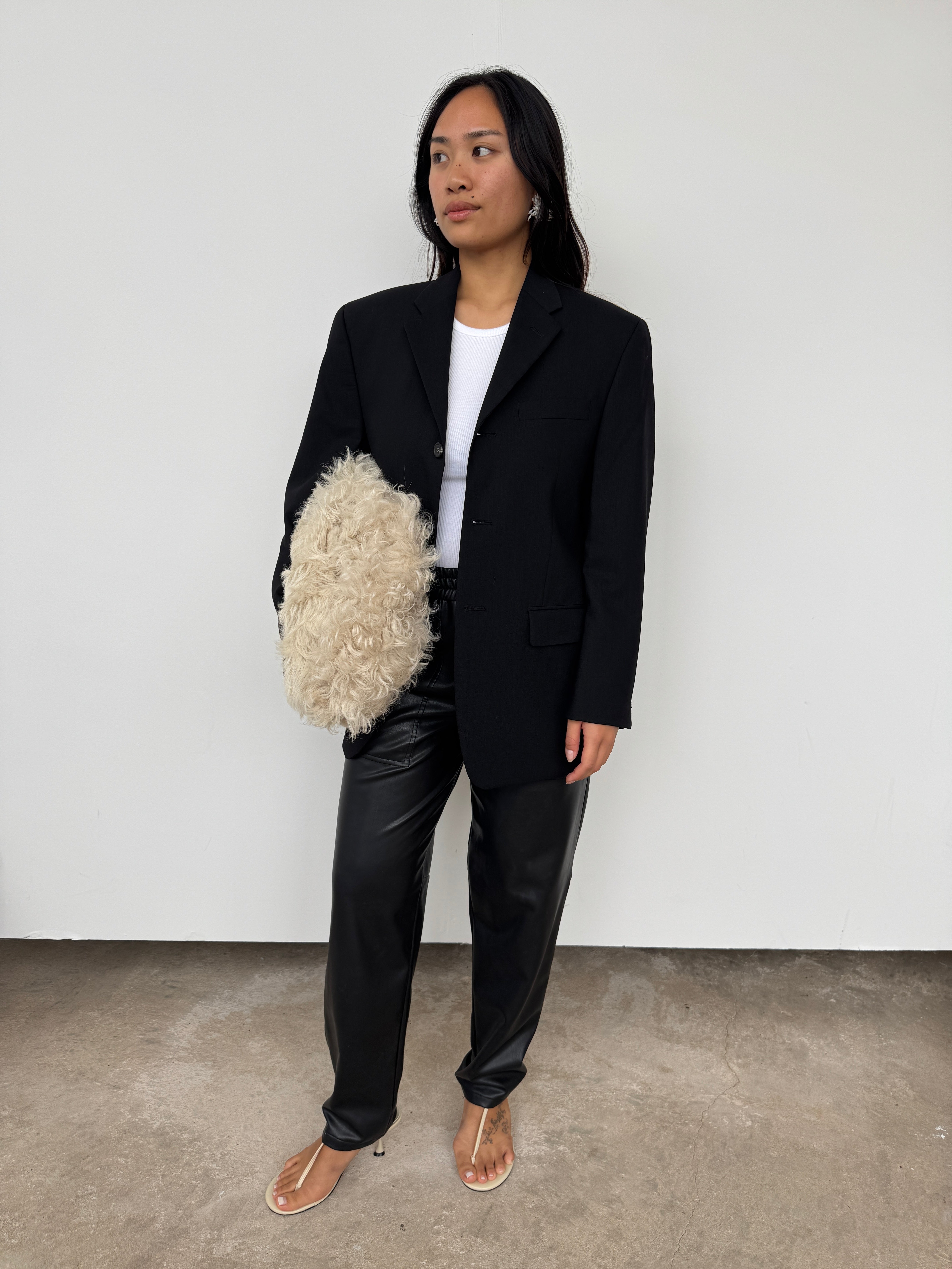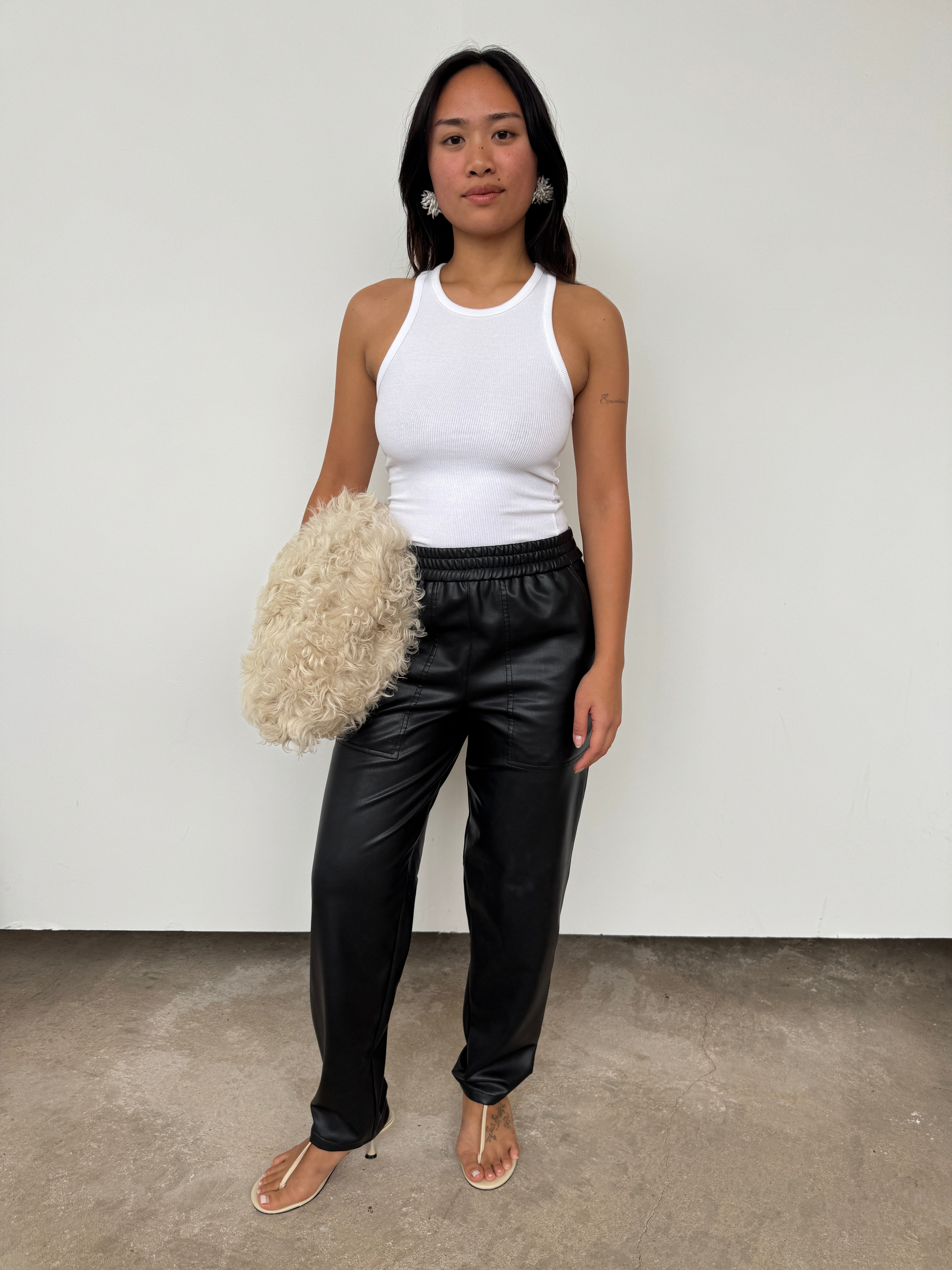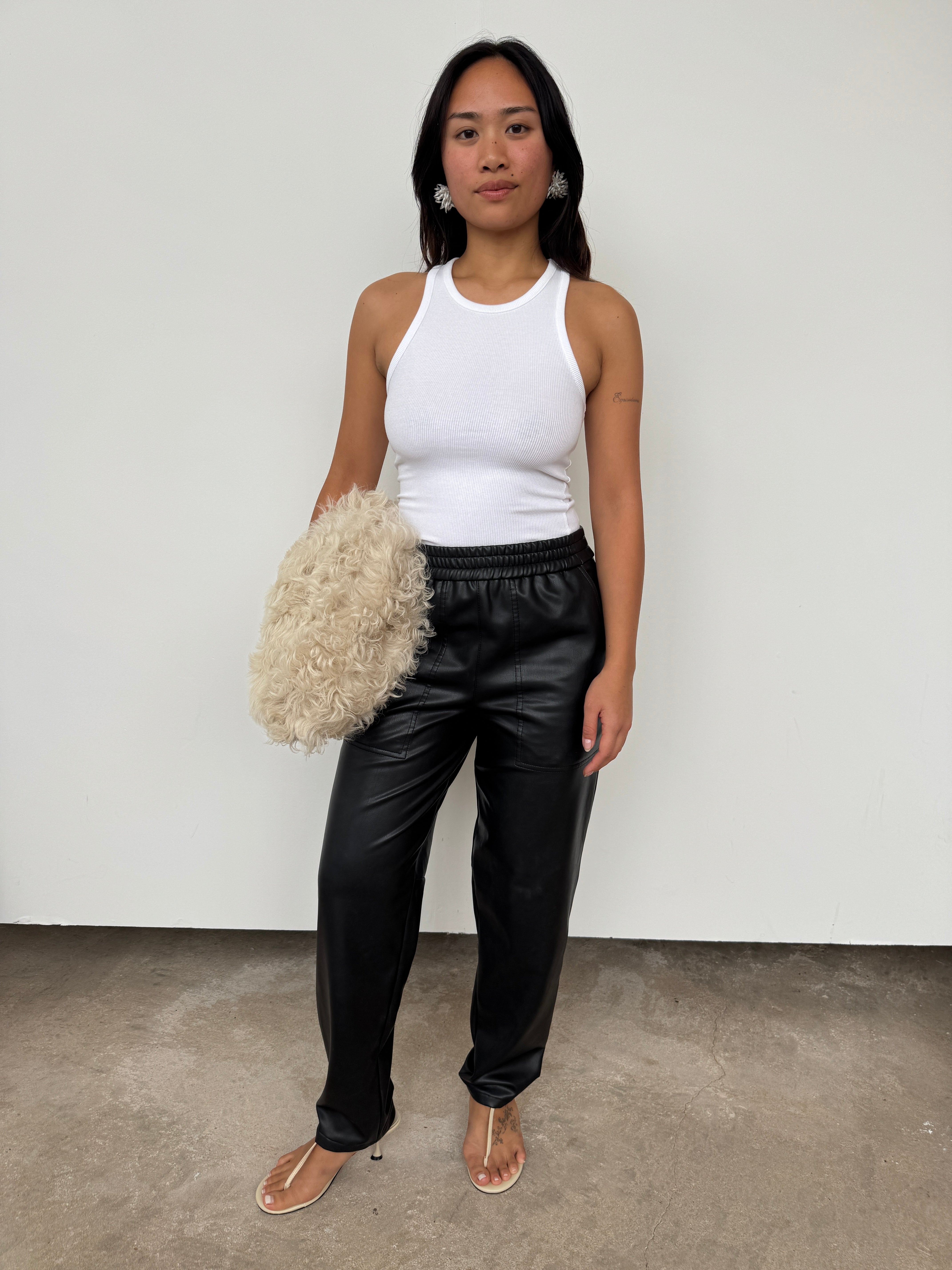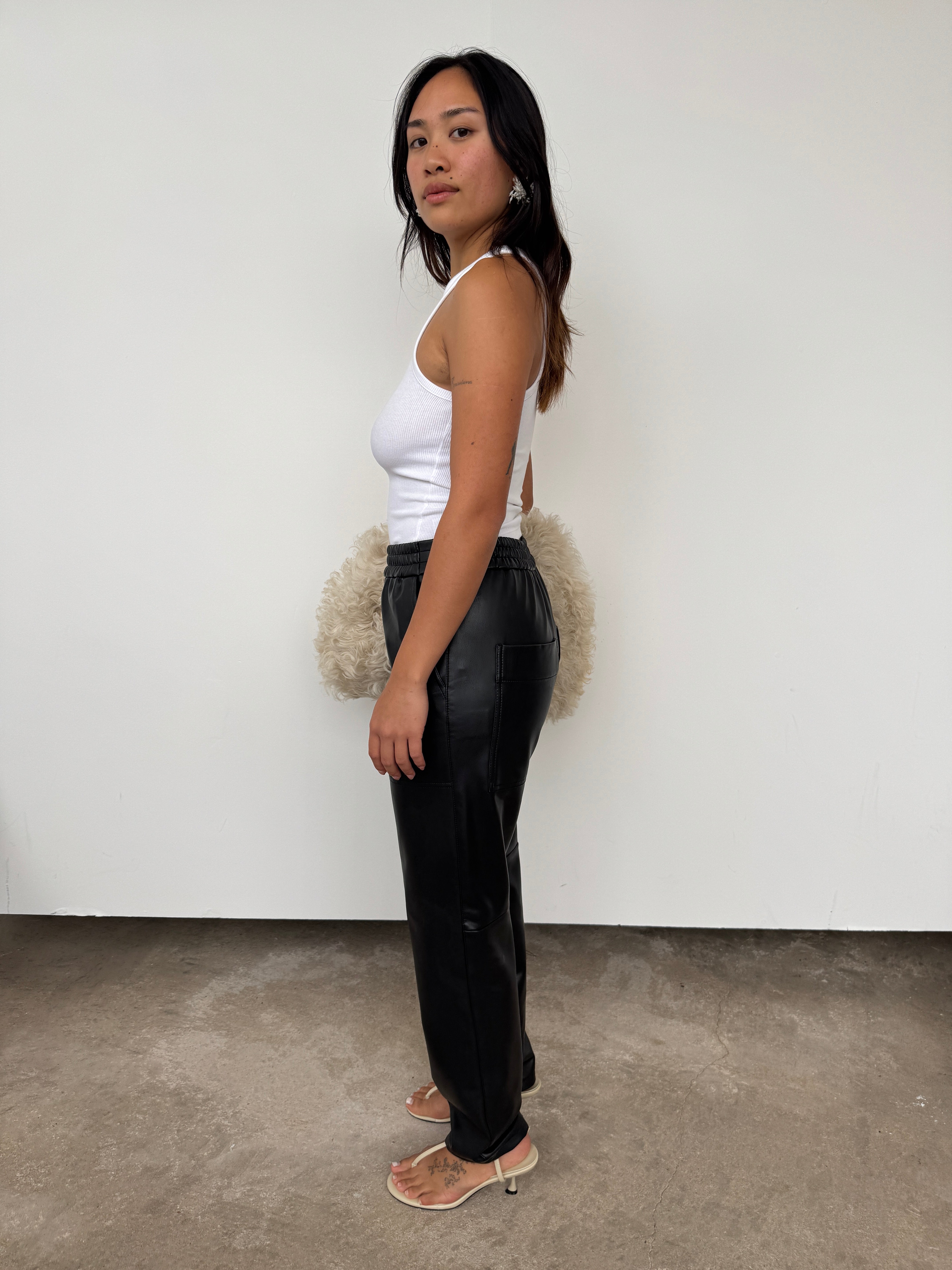 These vegan leather trousers have a straight cut, slightly fitted at the ankles and with an elasticated waistband.