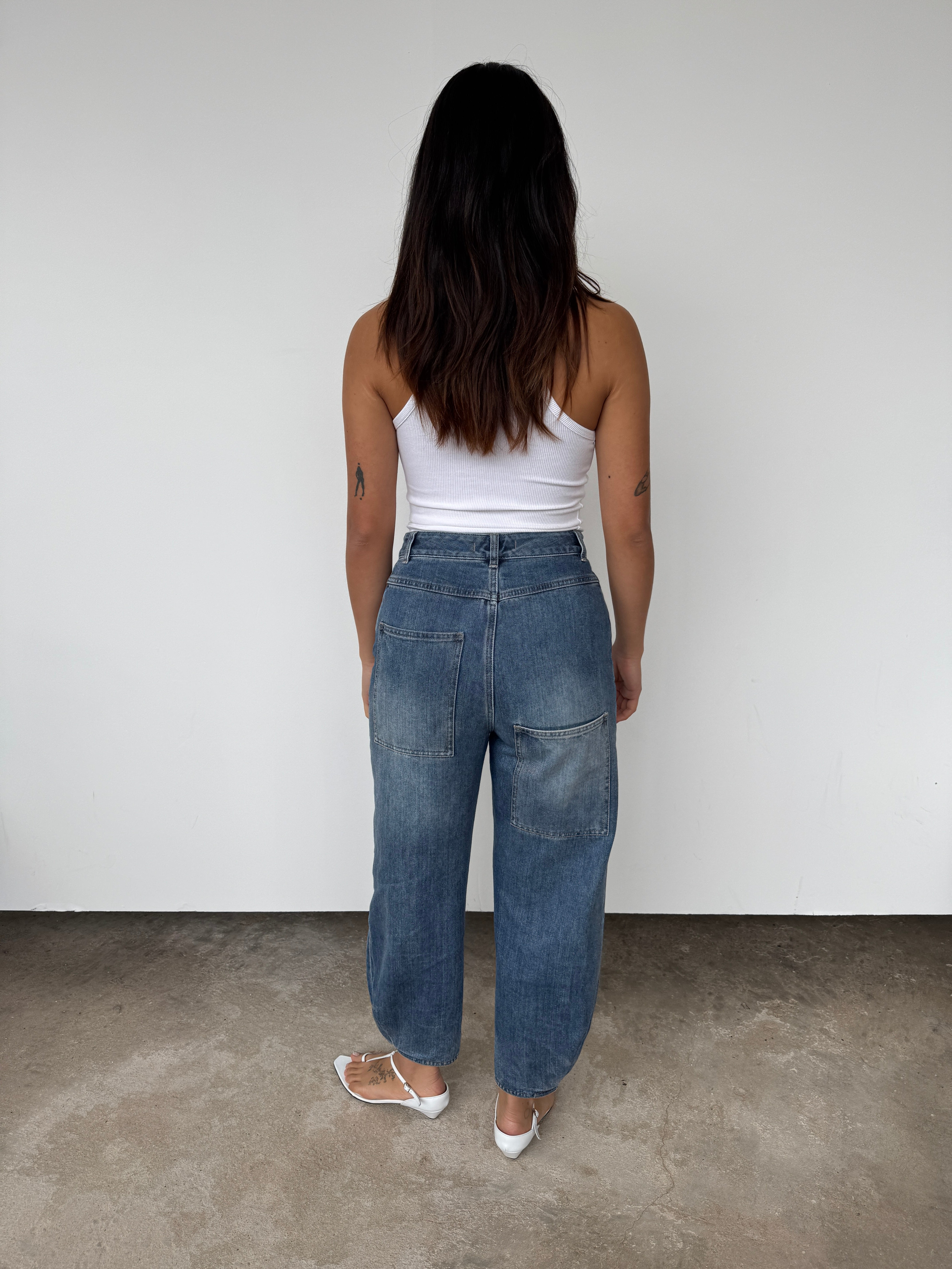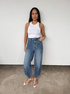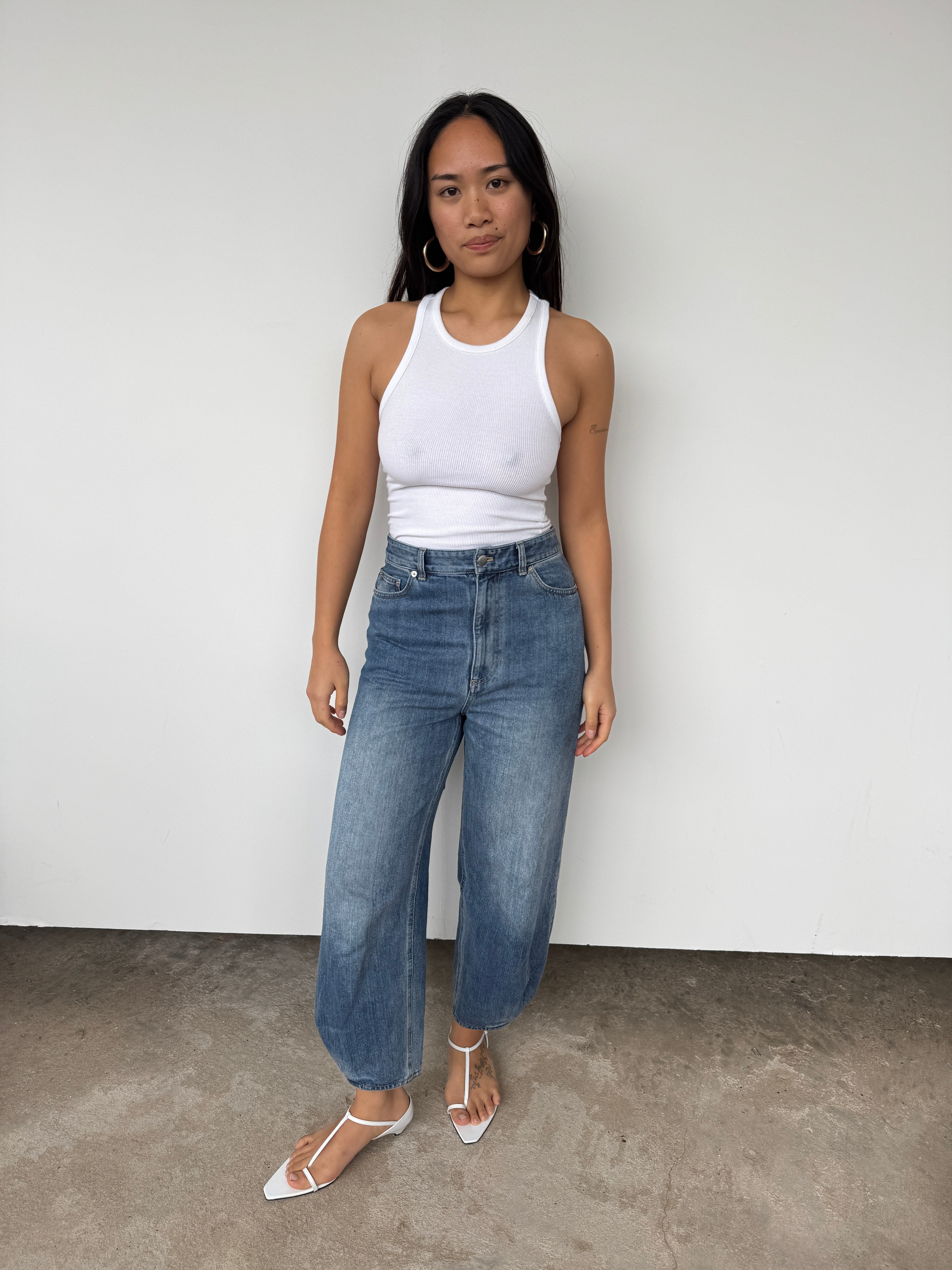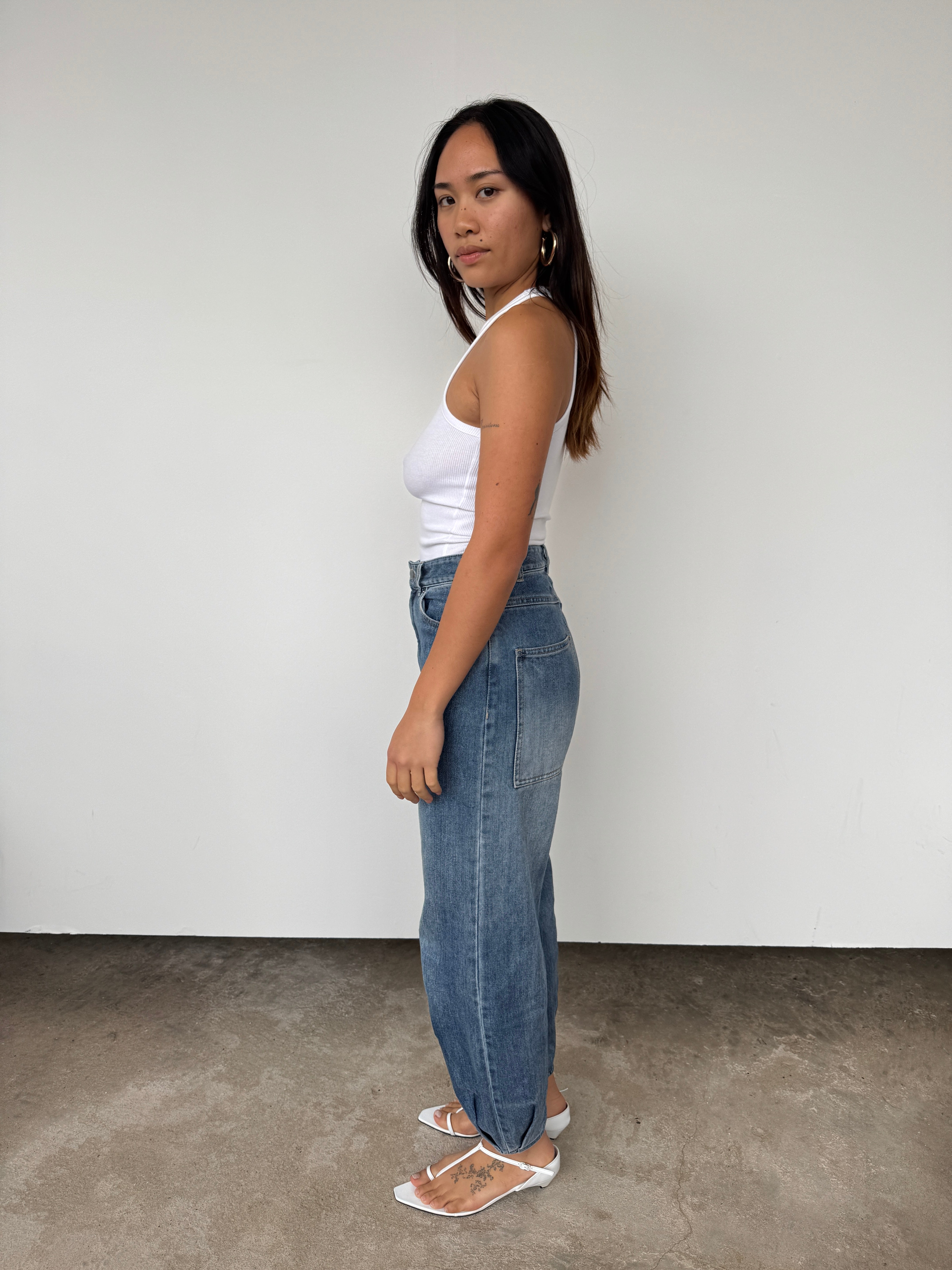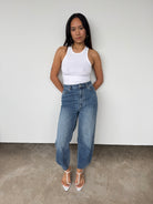 Crafted in a Japanese 3x1 left-hand twill denim with enzyme stone wash, the Classic Wash Denim High Waisted Quinn Jean is created from the Brancusi—with a higher rise for added control, ultimately achieving a more tailored look. They have a high-rise with a full bottom and are designed to sit at the natural waist.