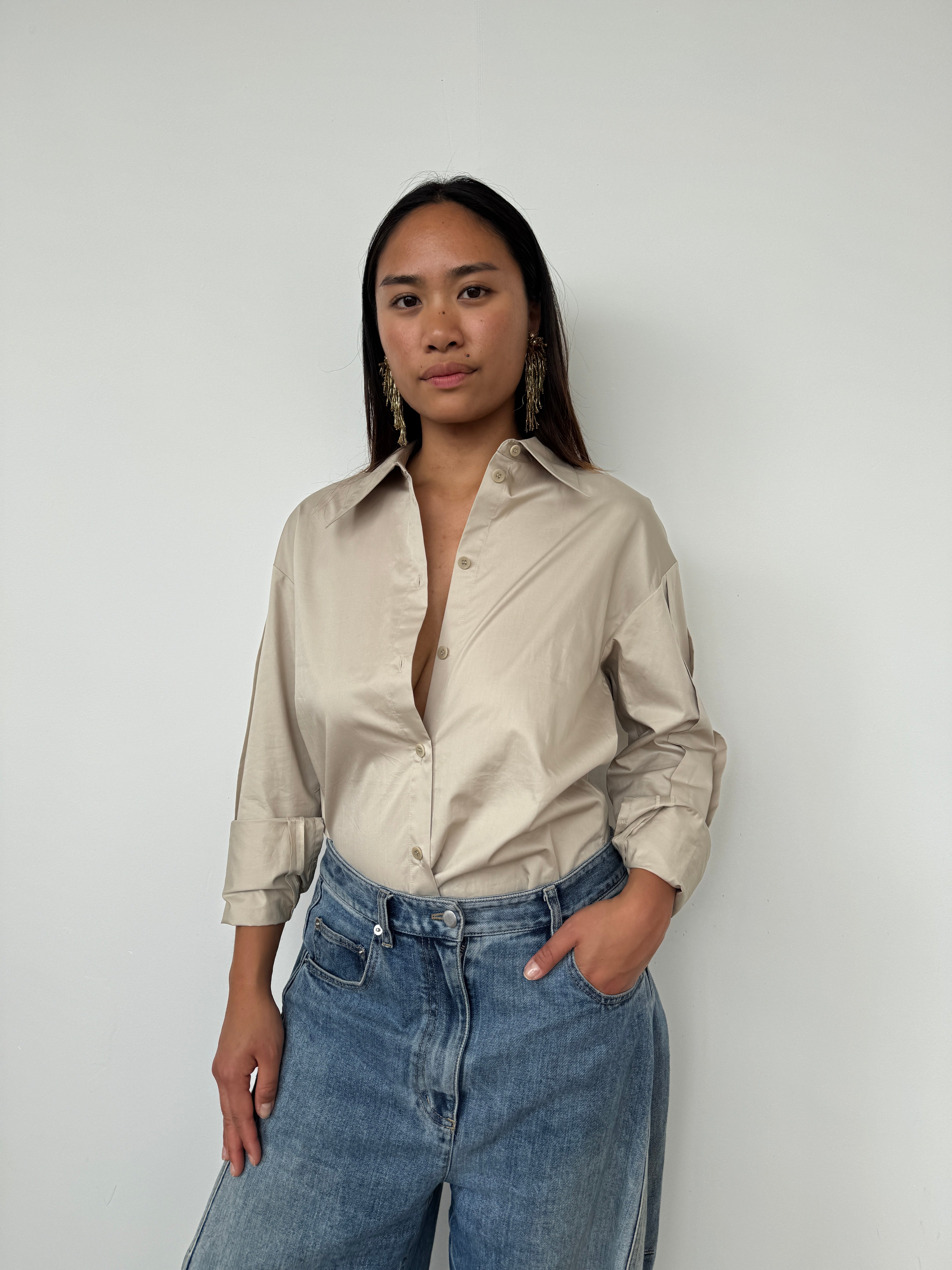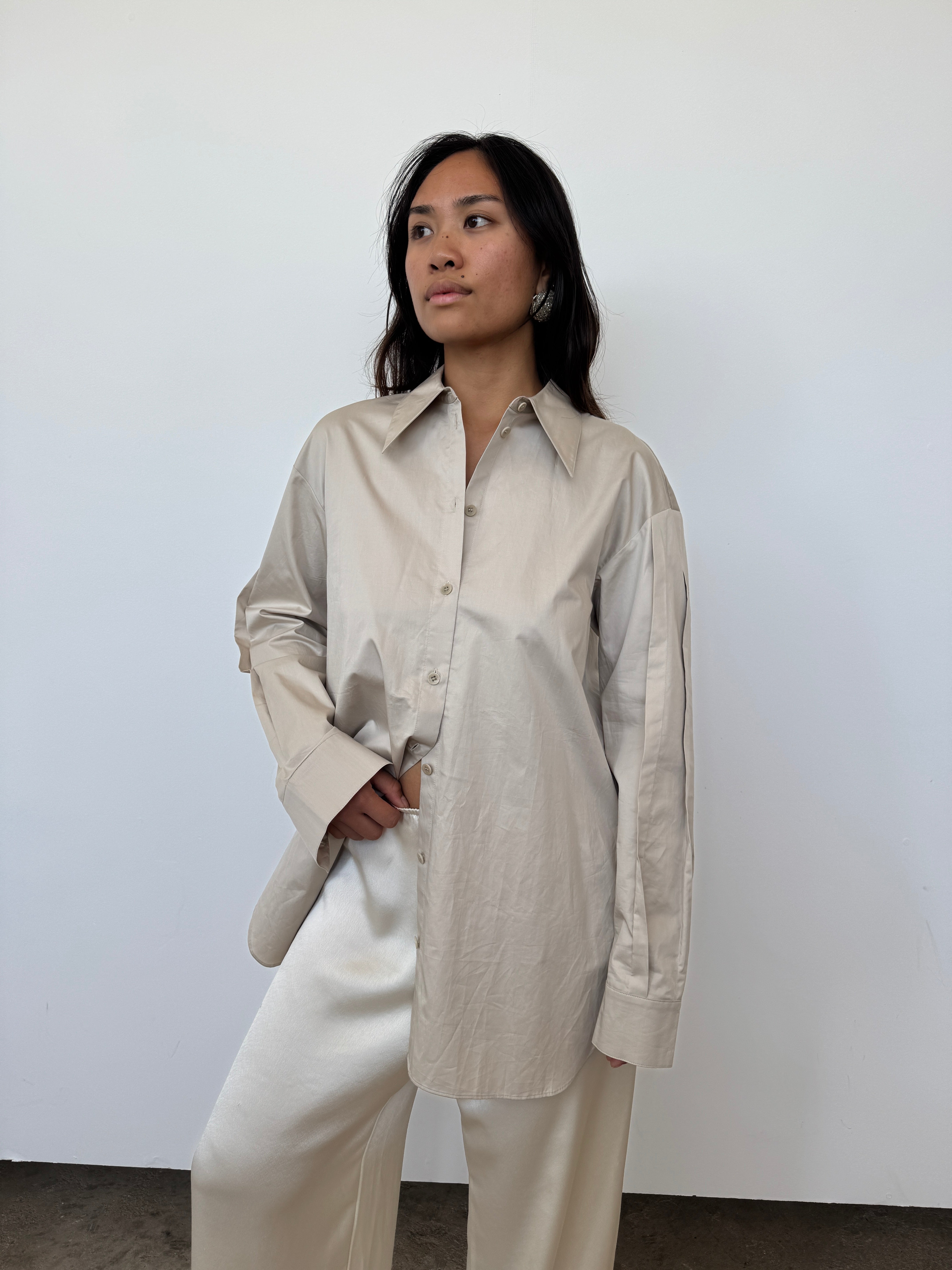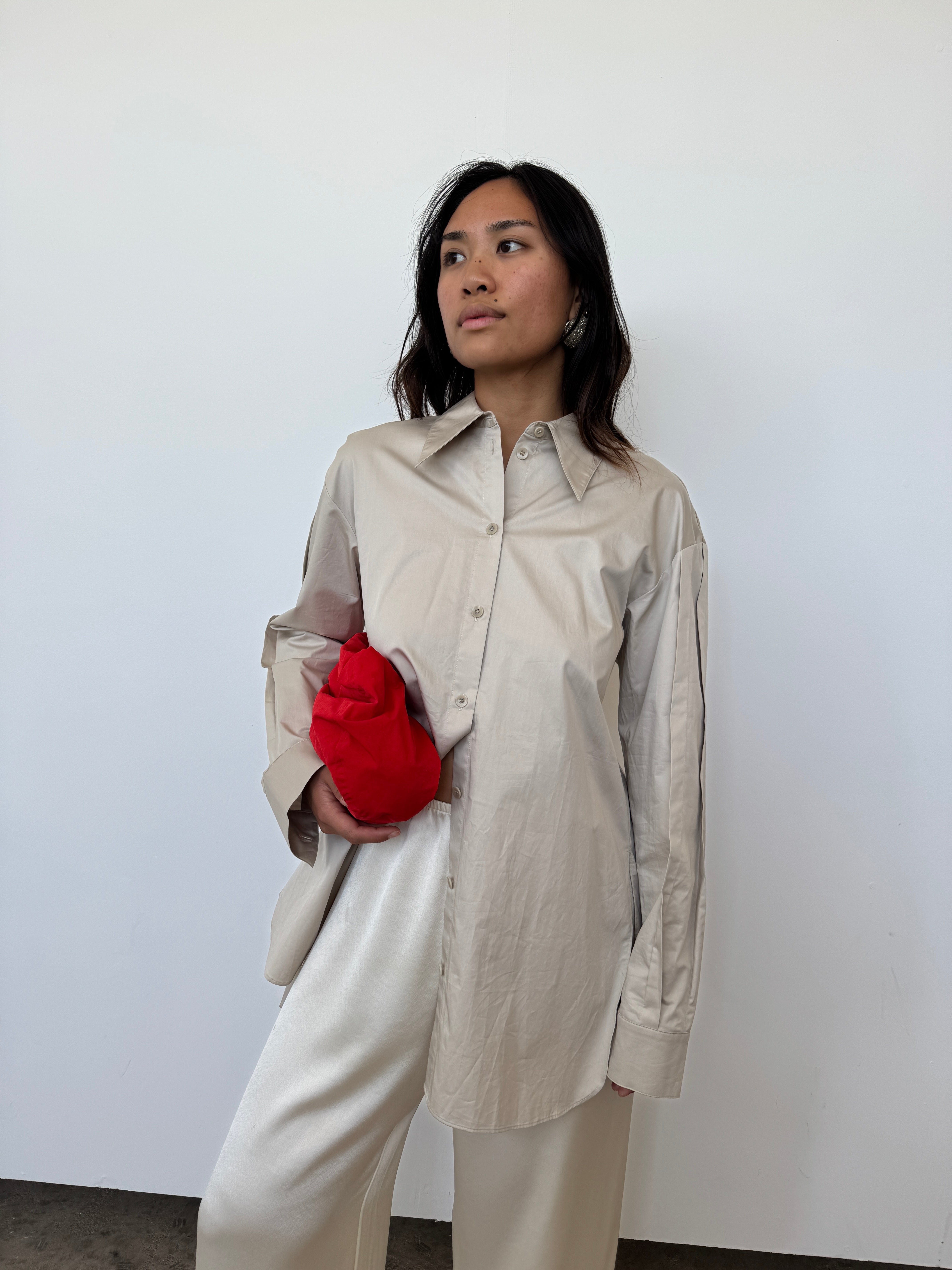 "The Eco Poplin Shirt with Tucked Sleeve is crafted from your workhorse fabrication in a silhouette that works even harder, that we, as Creative Pragmatists, are constantly seeking. Challenging a classic button up by adding additional buttons up the back, allowing you to wear buttoned or unbuttoned to tie and create more styling options."