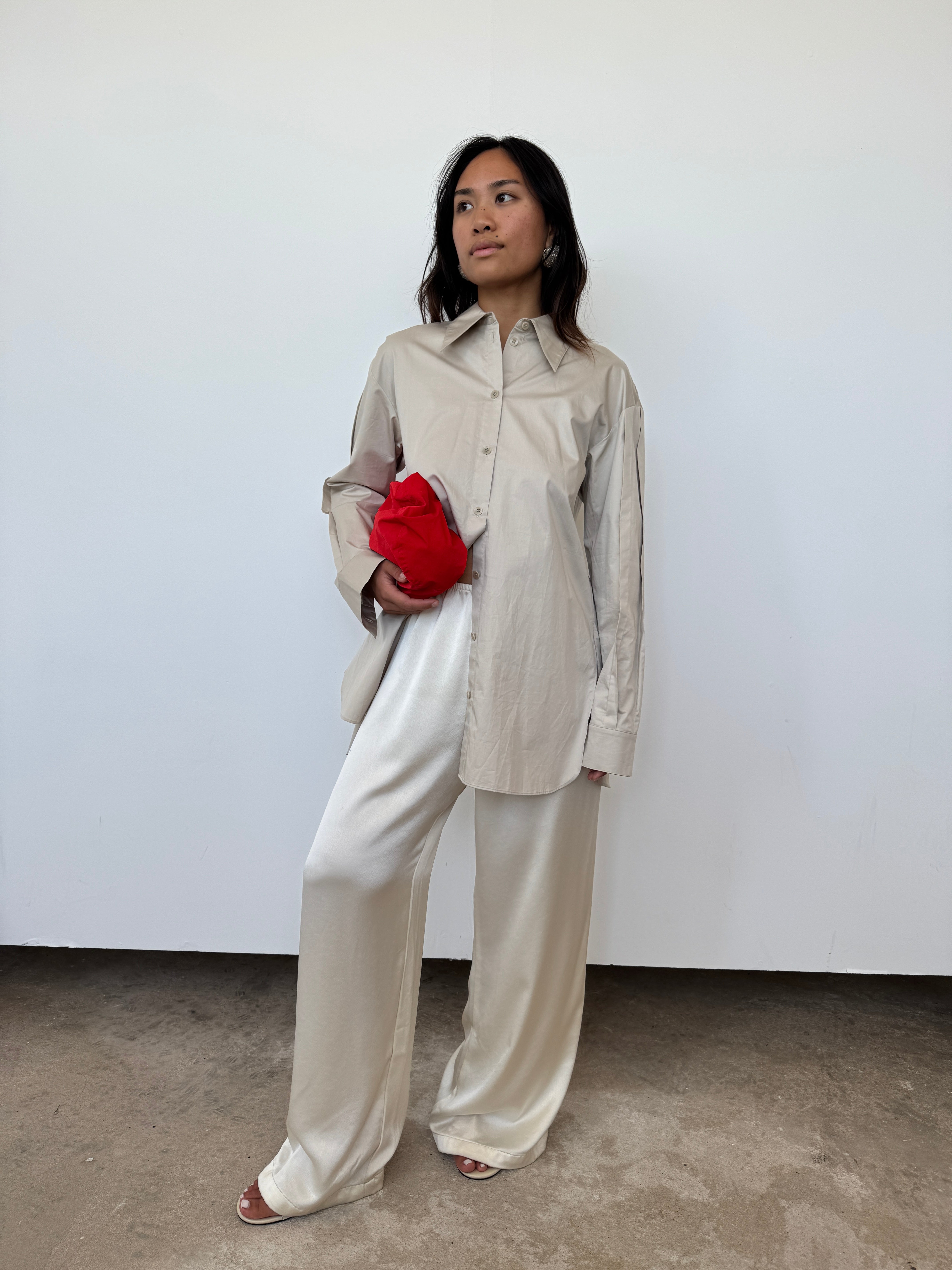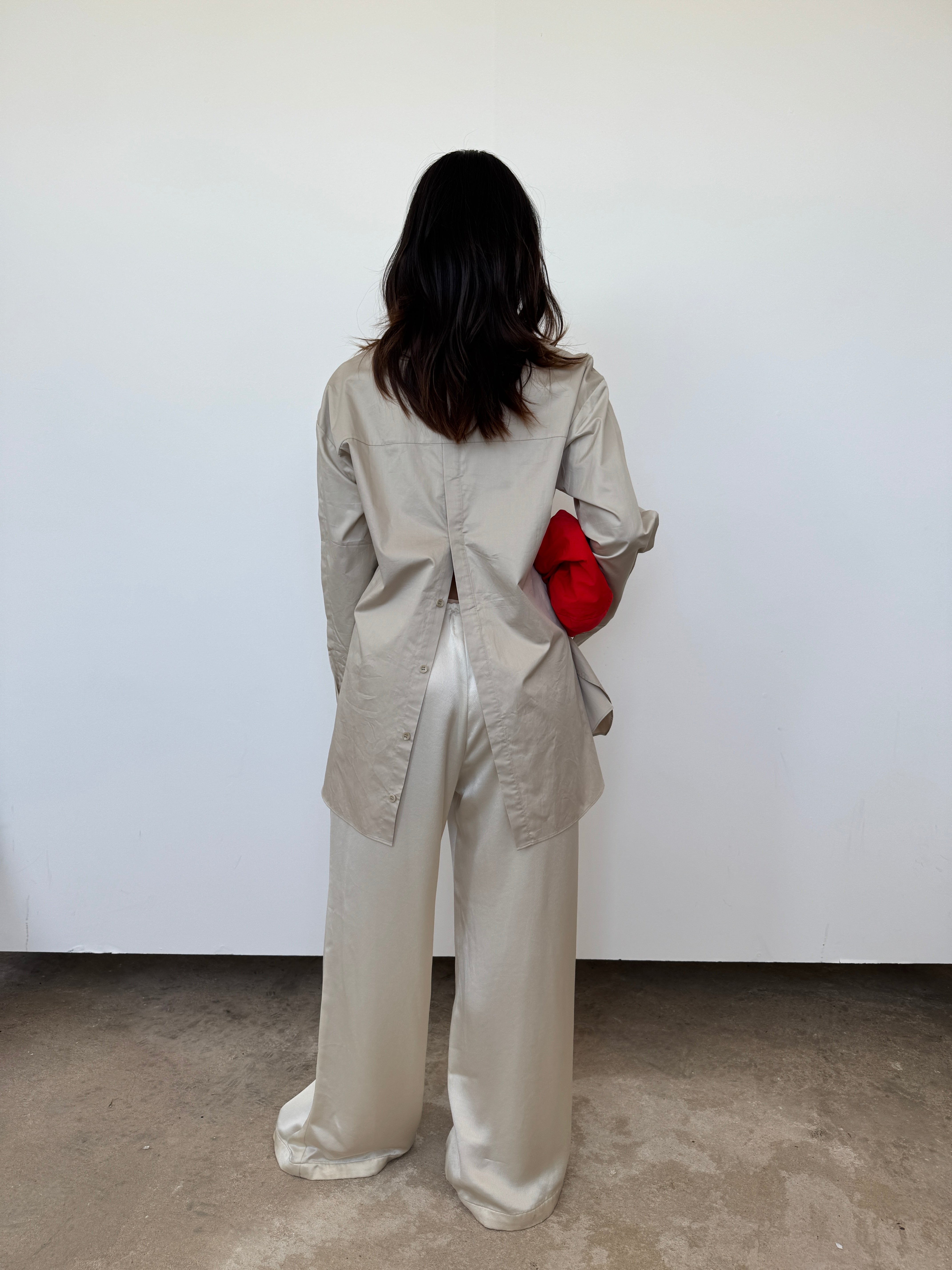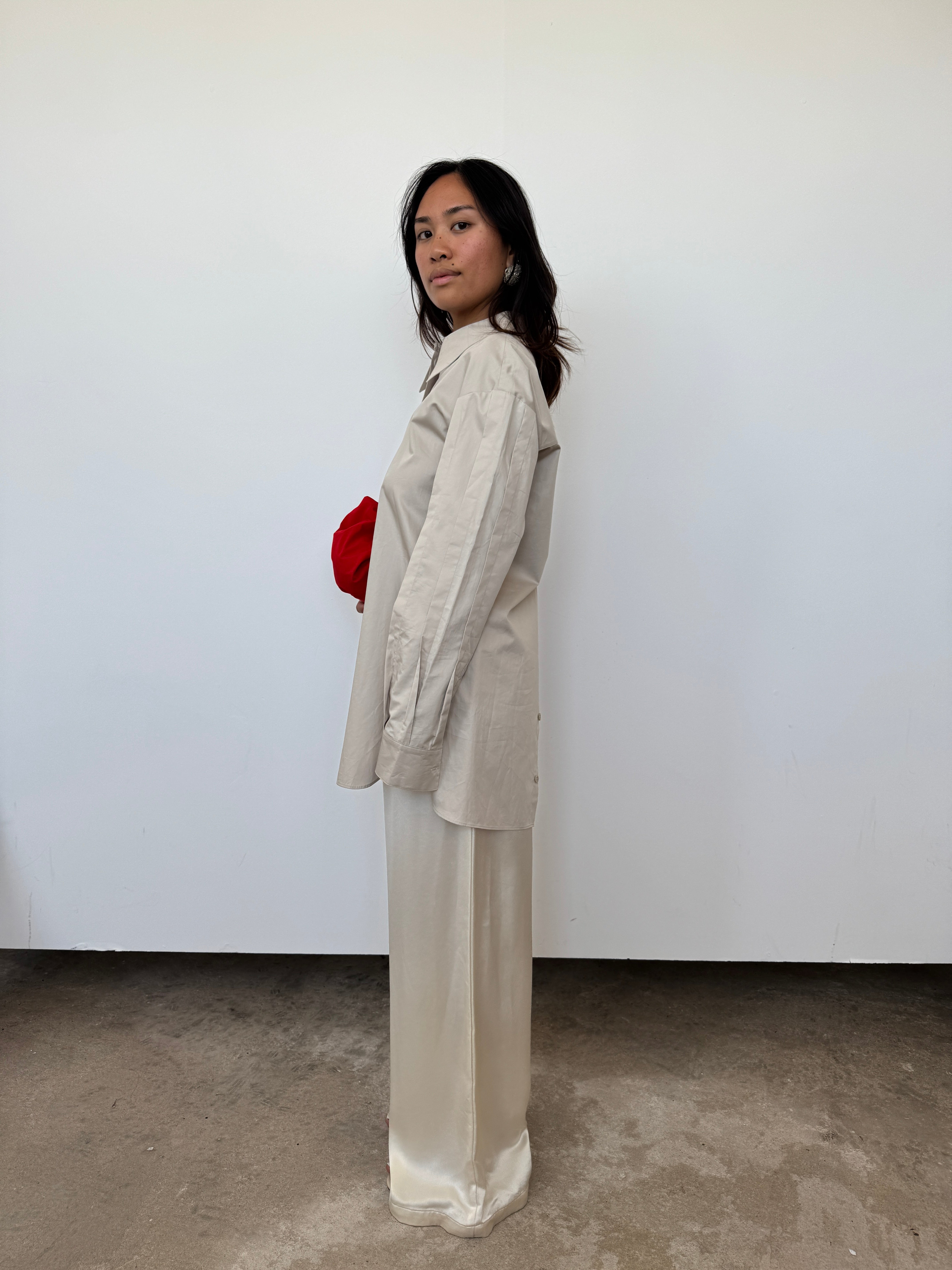 "The Eco Poplin Shirt with Tucked Sleeve is crafted from your workhorse fabrication in a silhouette that works even harder, that we, as Creative Pragmatists, are constantly seeking. Challenging a classic button up by adding additional buttons up the back, allowing you to wear buttoned or unbuttoned to tie and create more styling options."