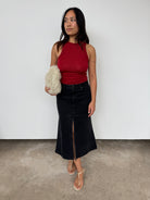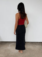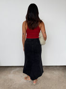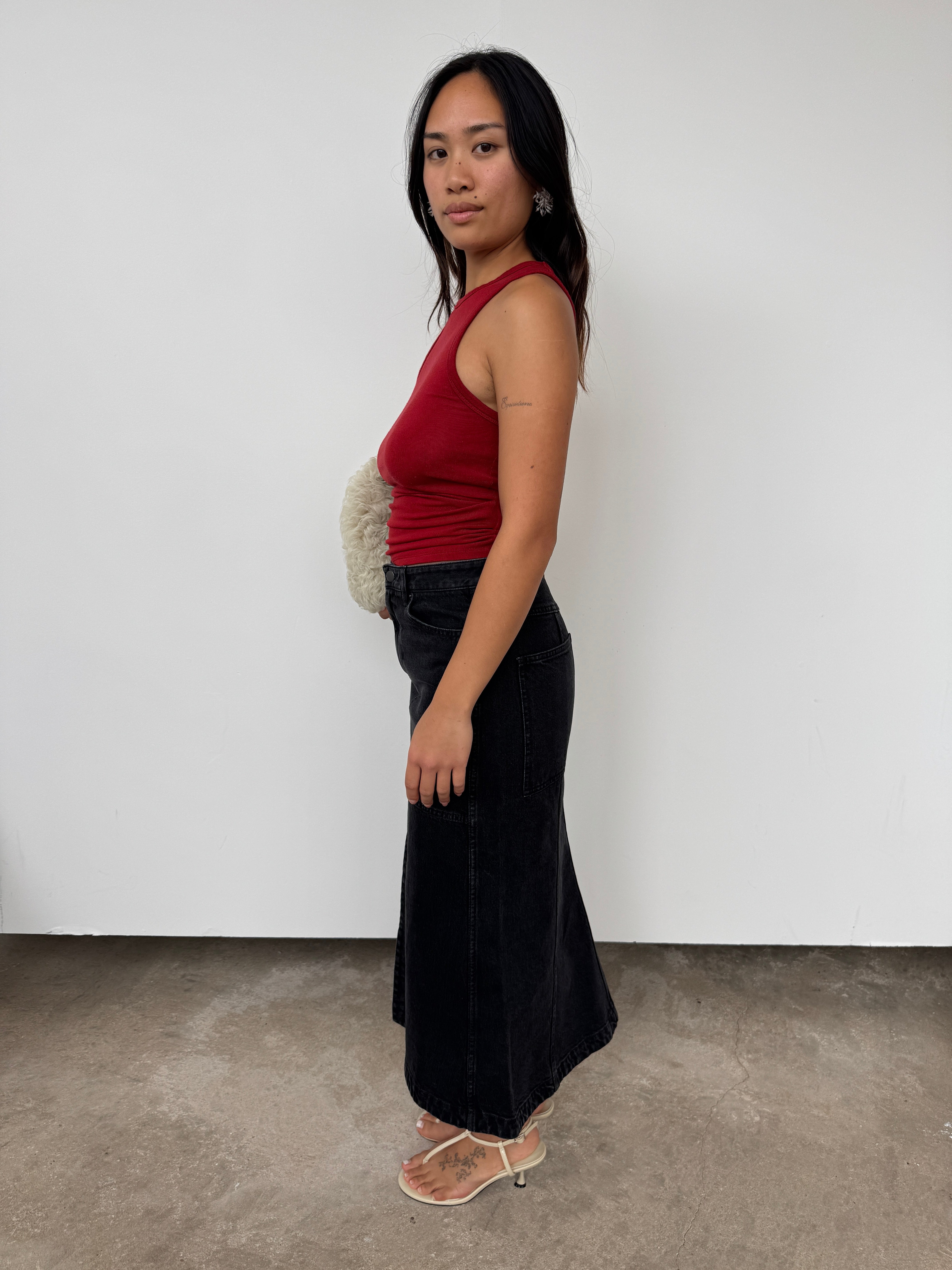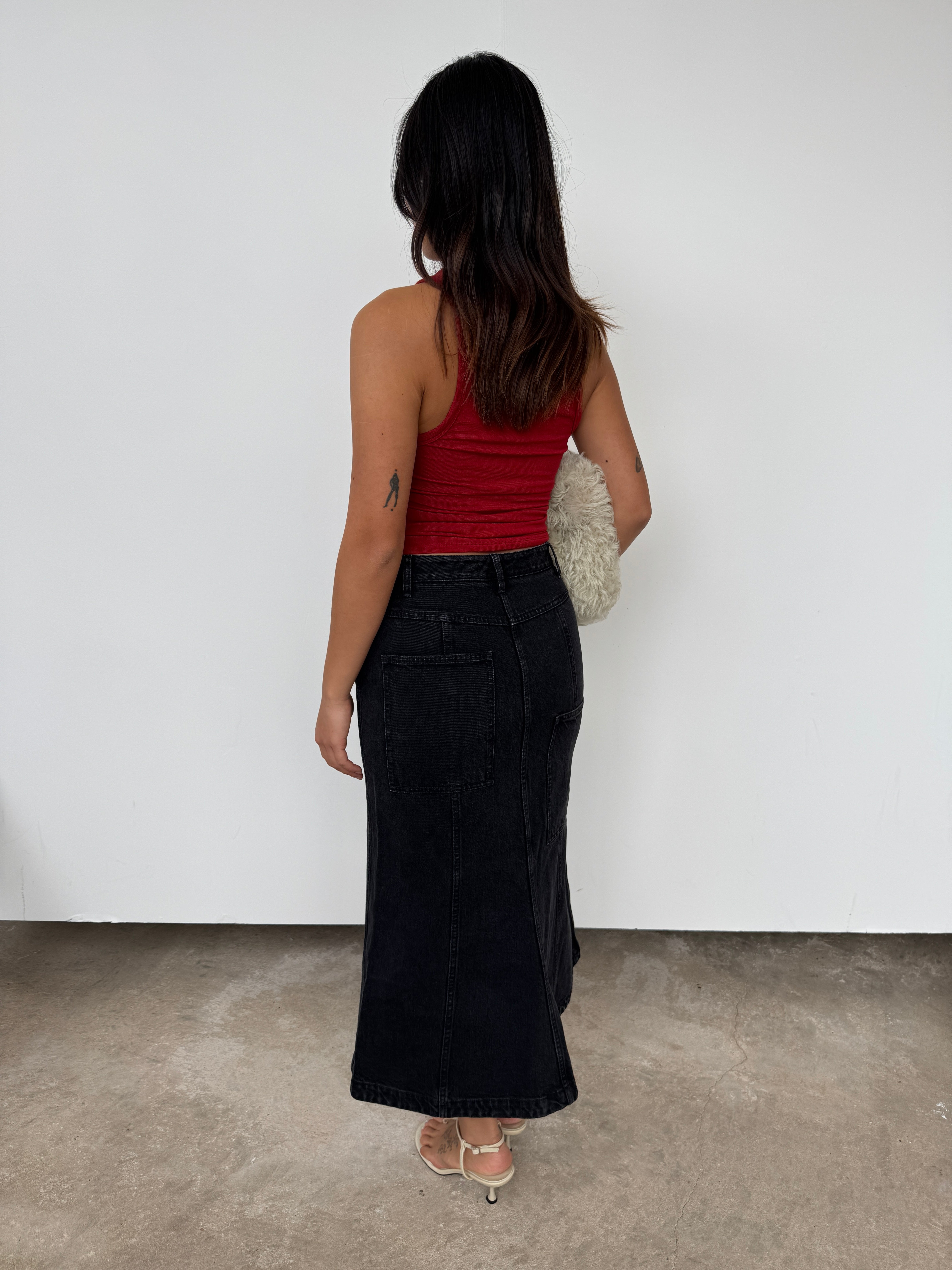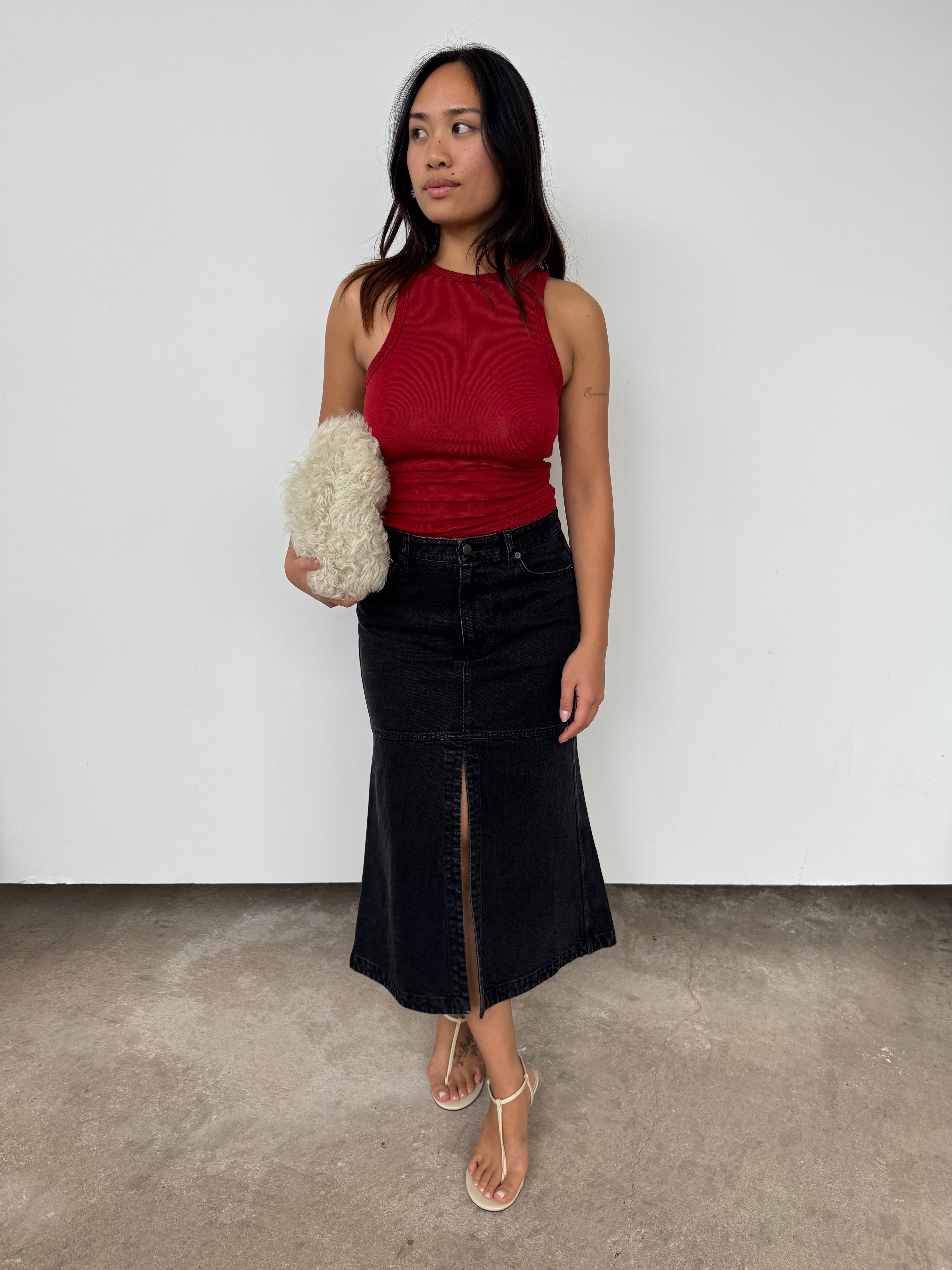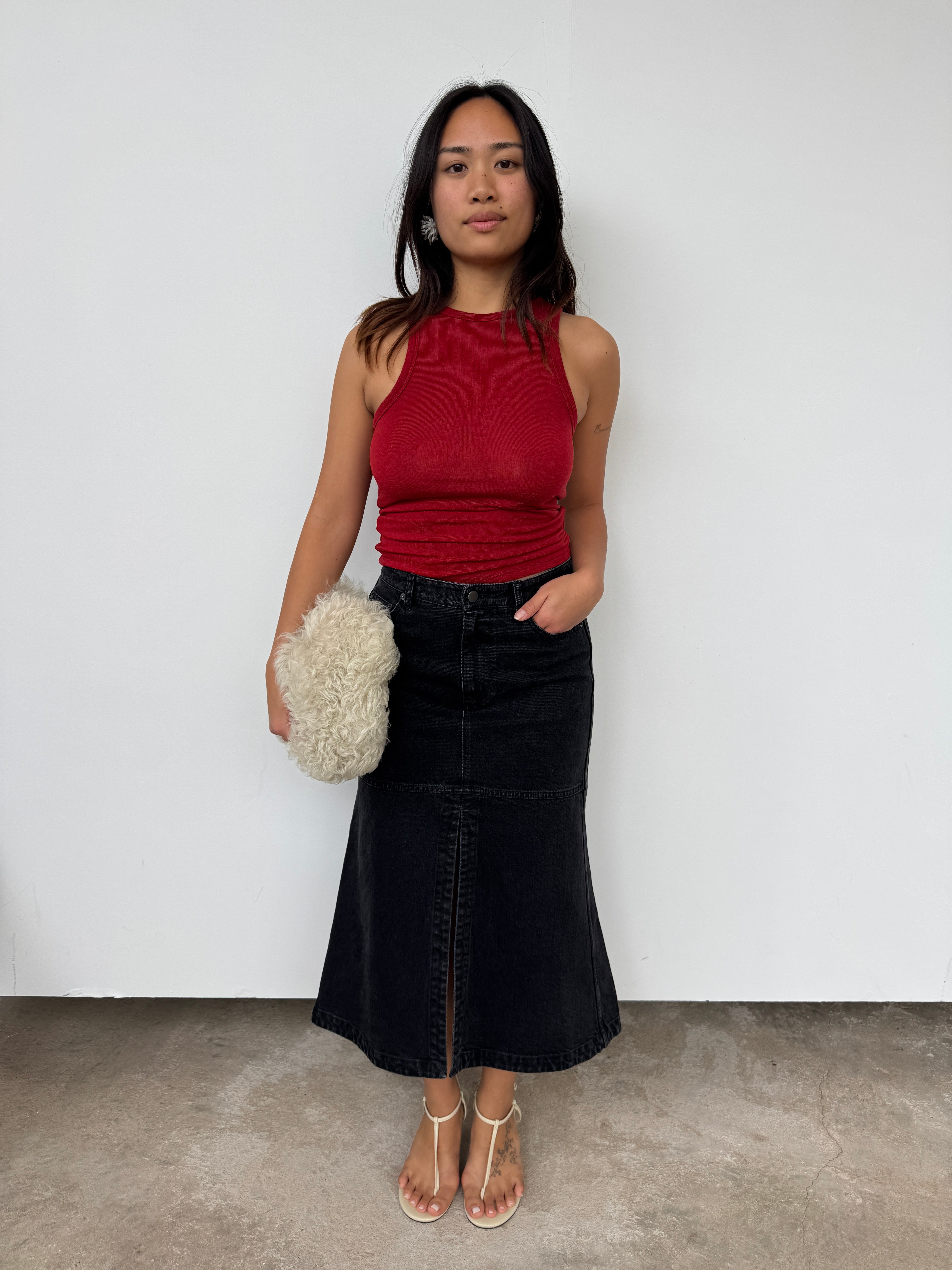 Crafted in a 12oz Japanese garment-washed black denim this newest iteration is an anything but basic, jean skirt. The hybrid structure of classic suiting and the elongated clean lines of the 90’s with a touch of flair (see, hemline)