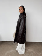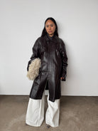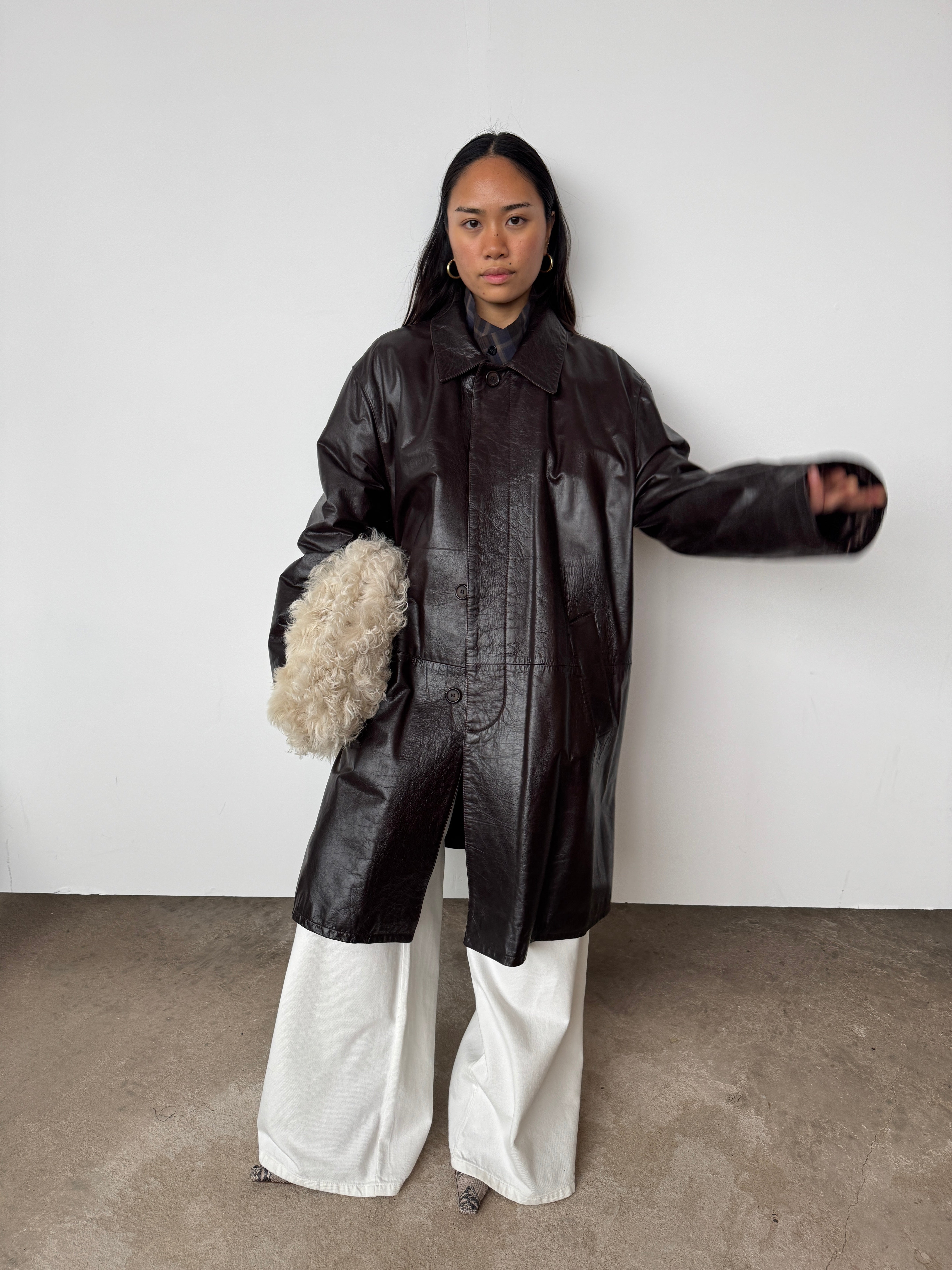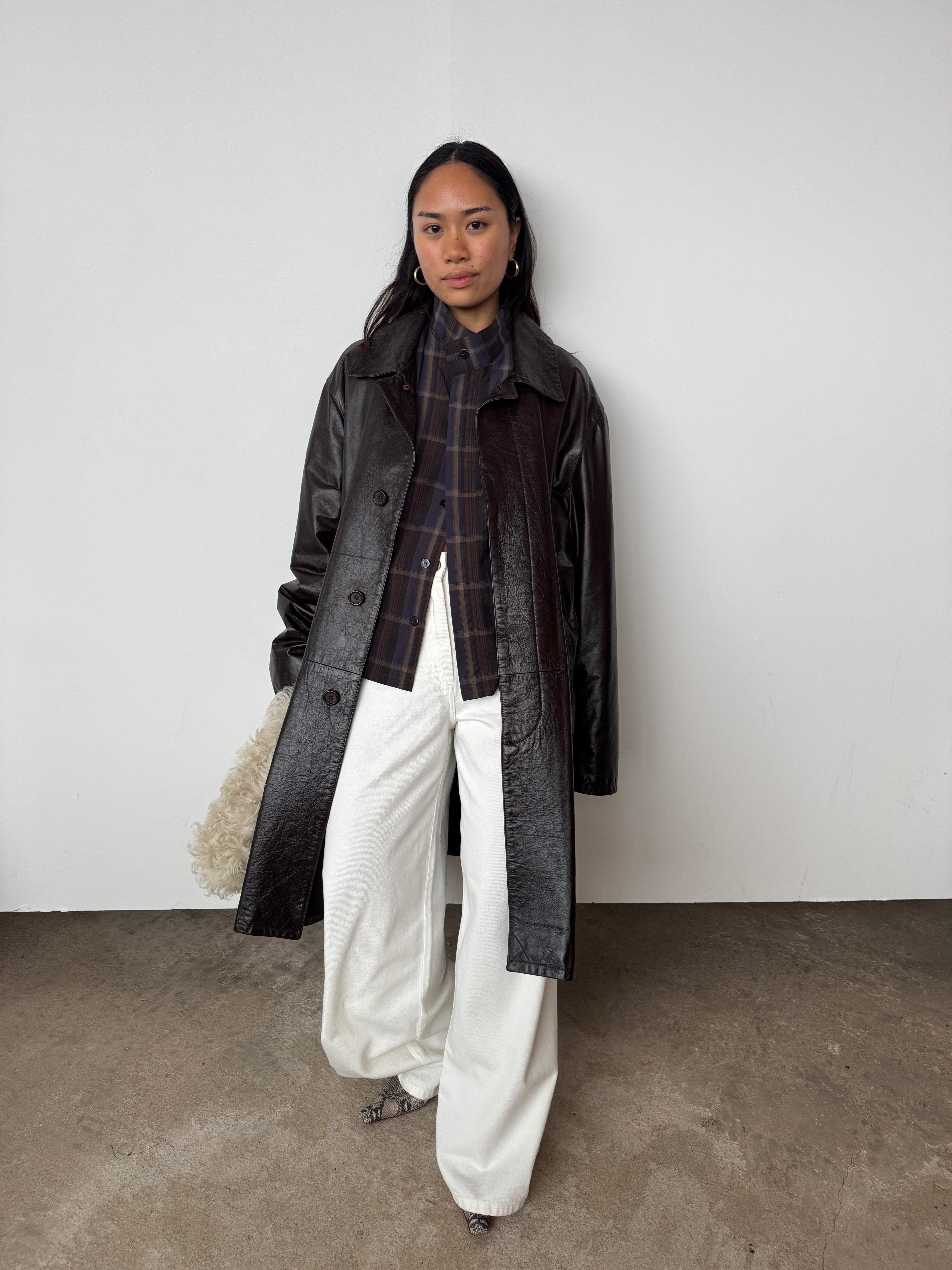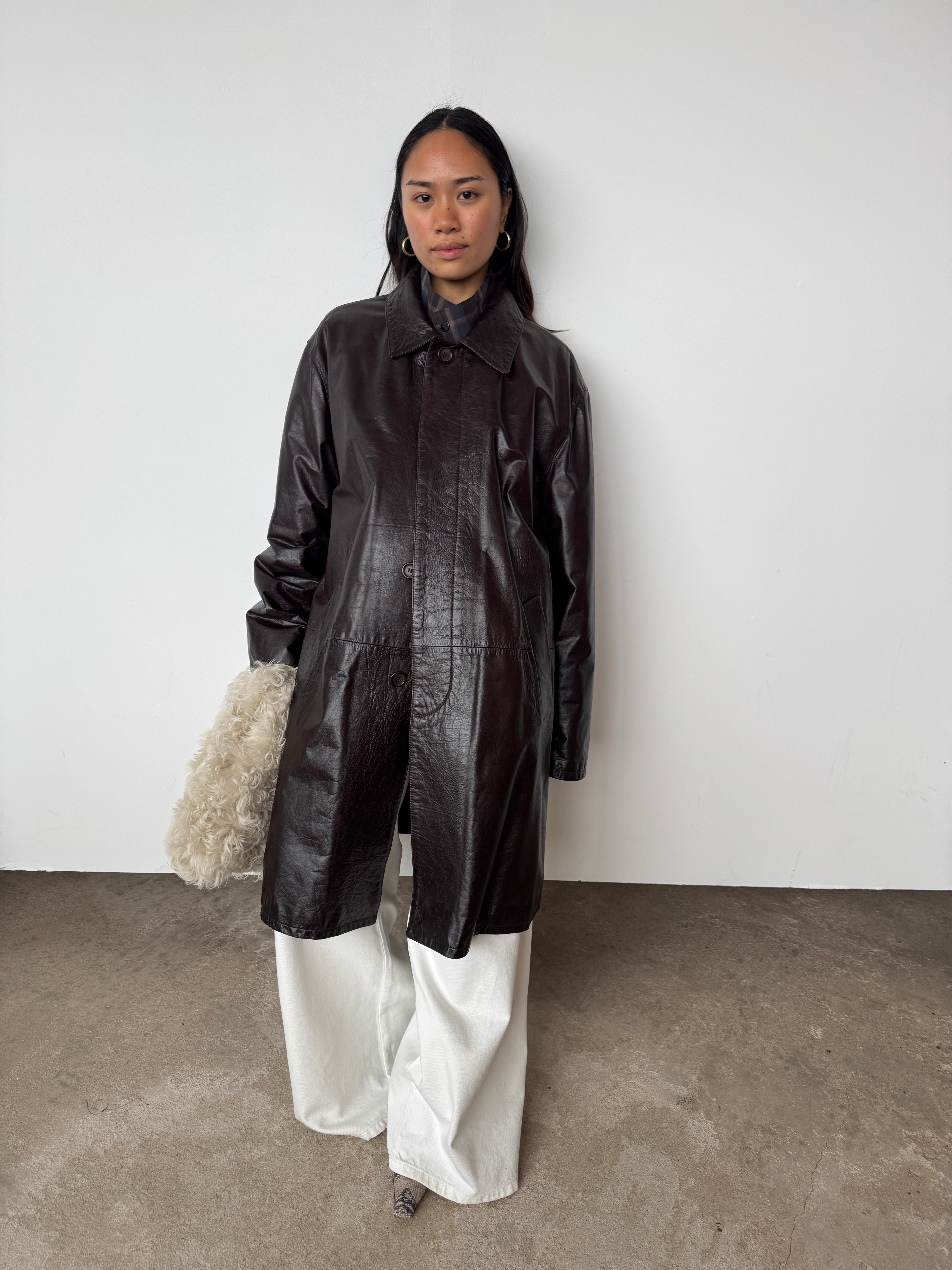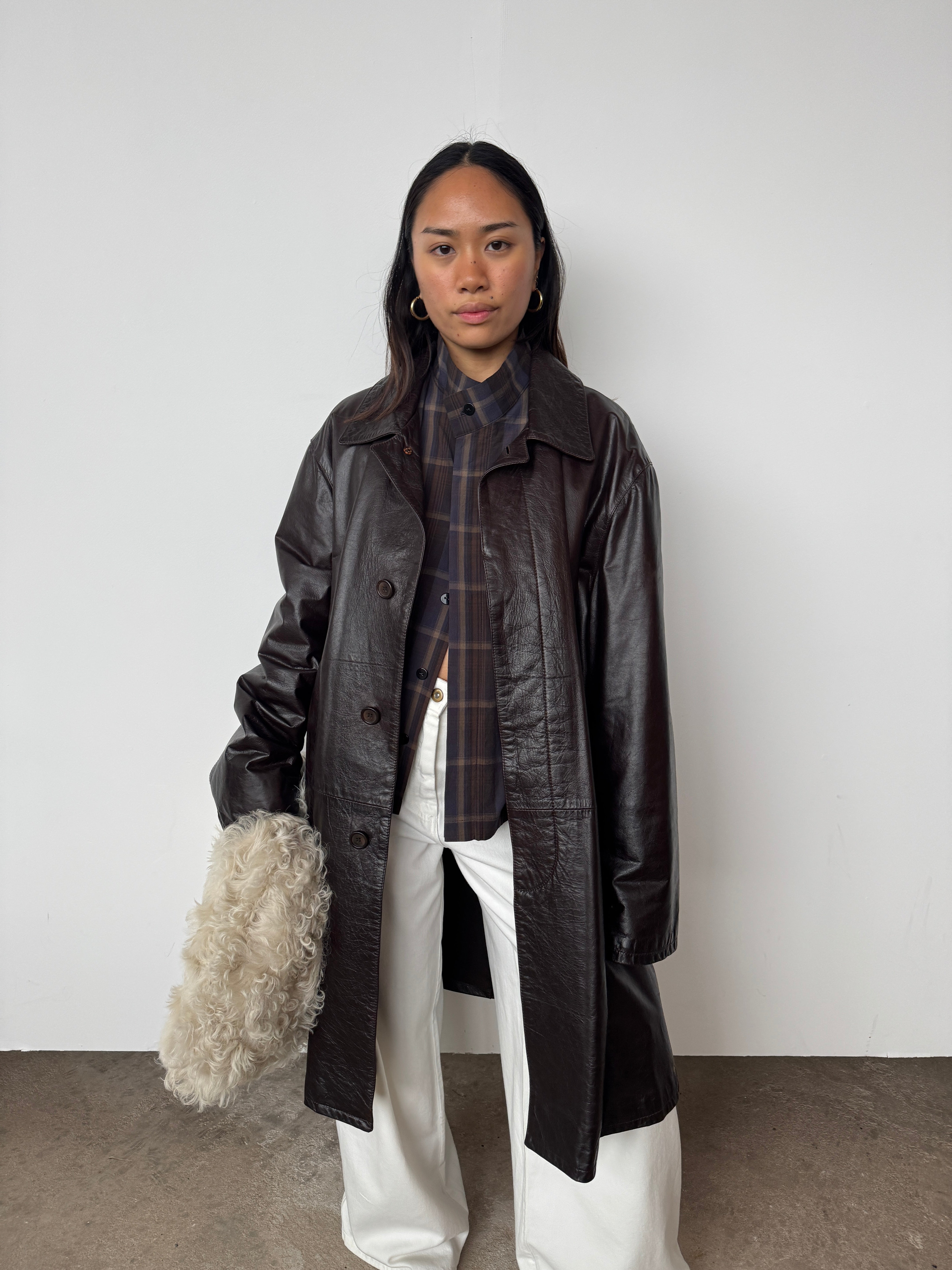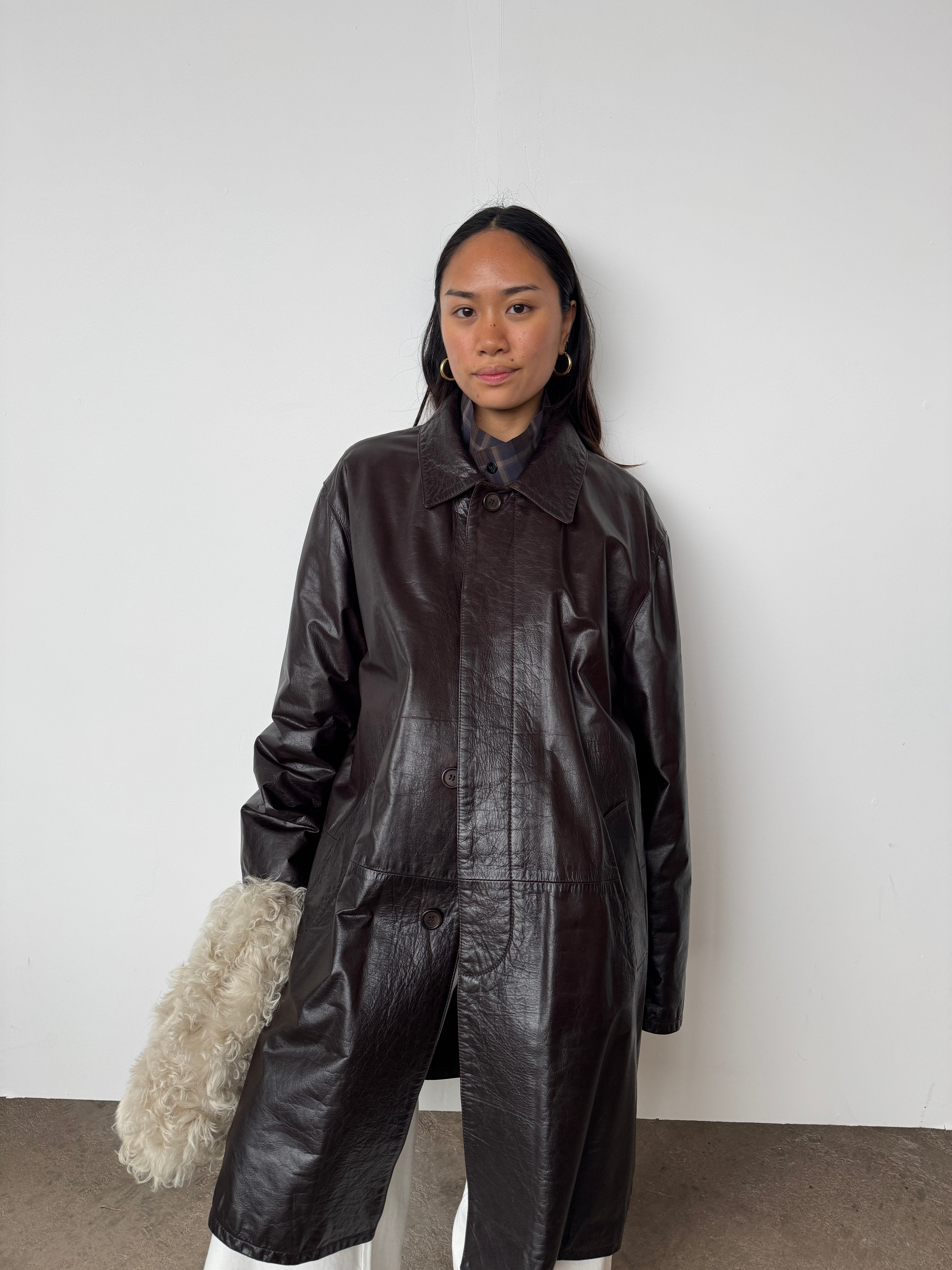 This piece is heavy-weight and lined. It is a glossy brown, absolutely beautiful.