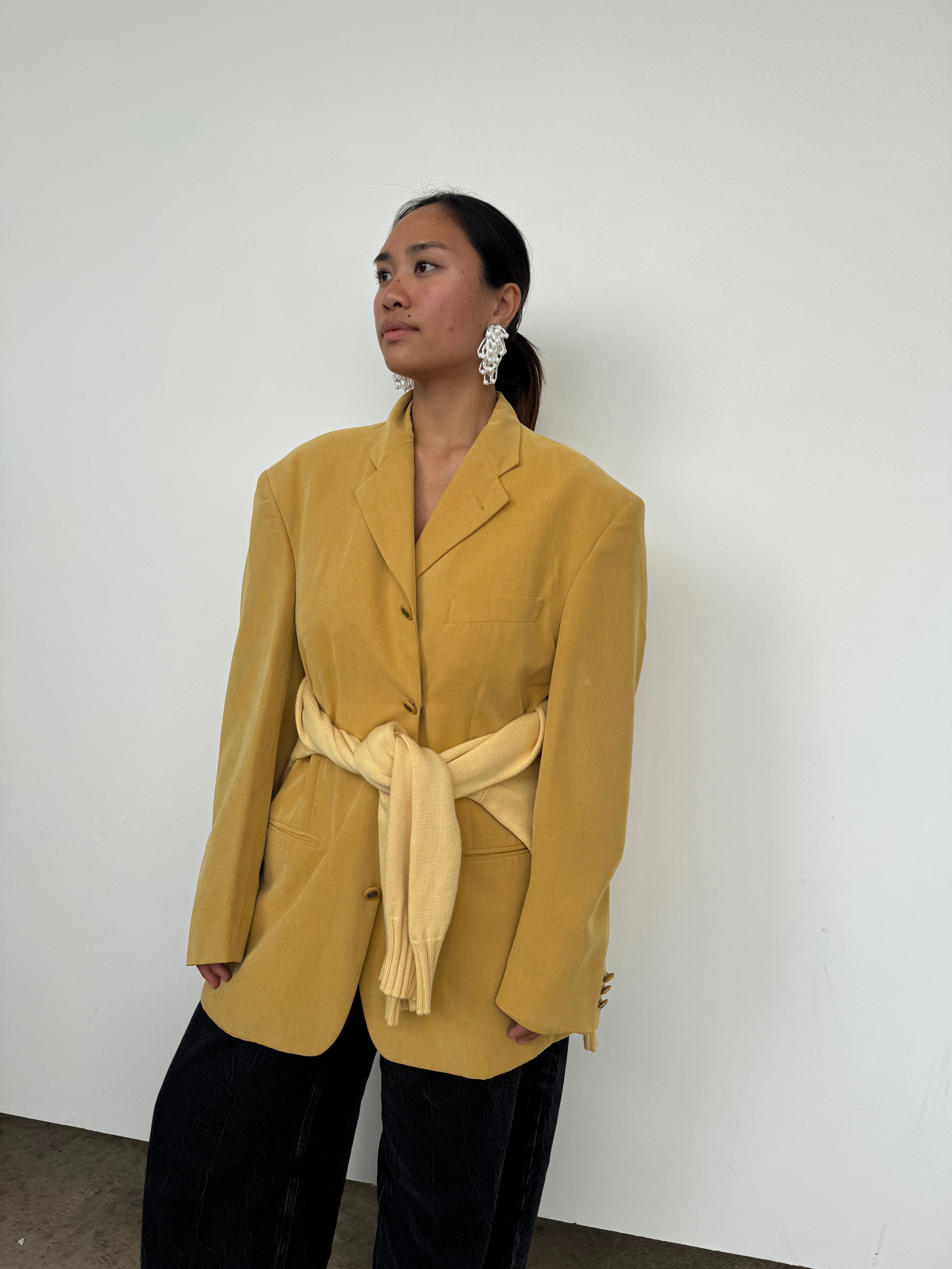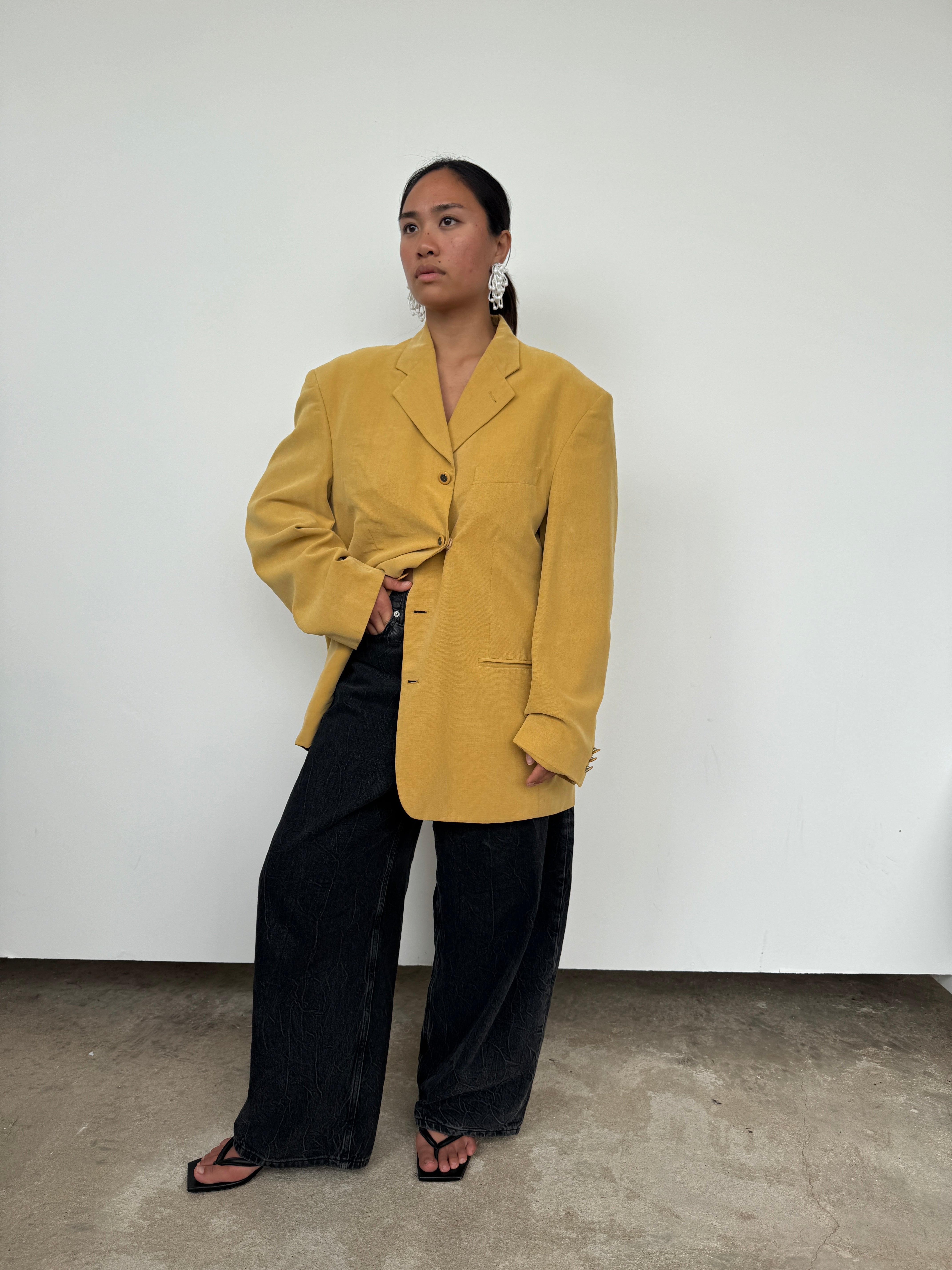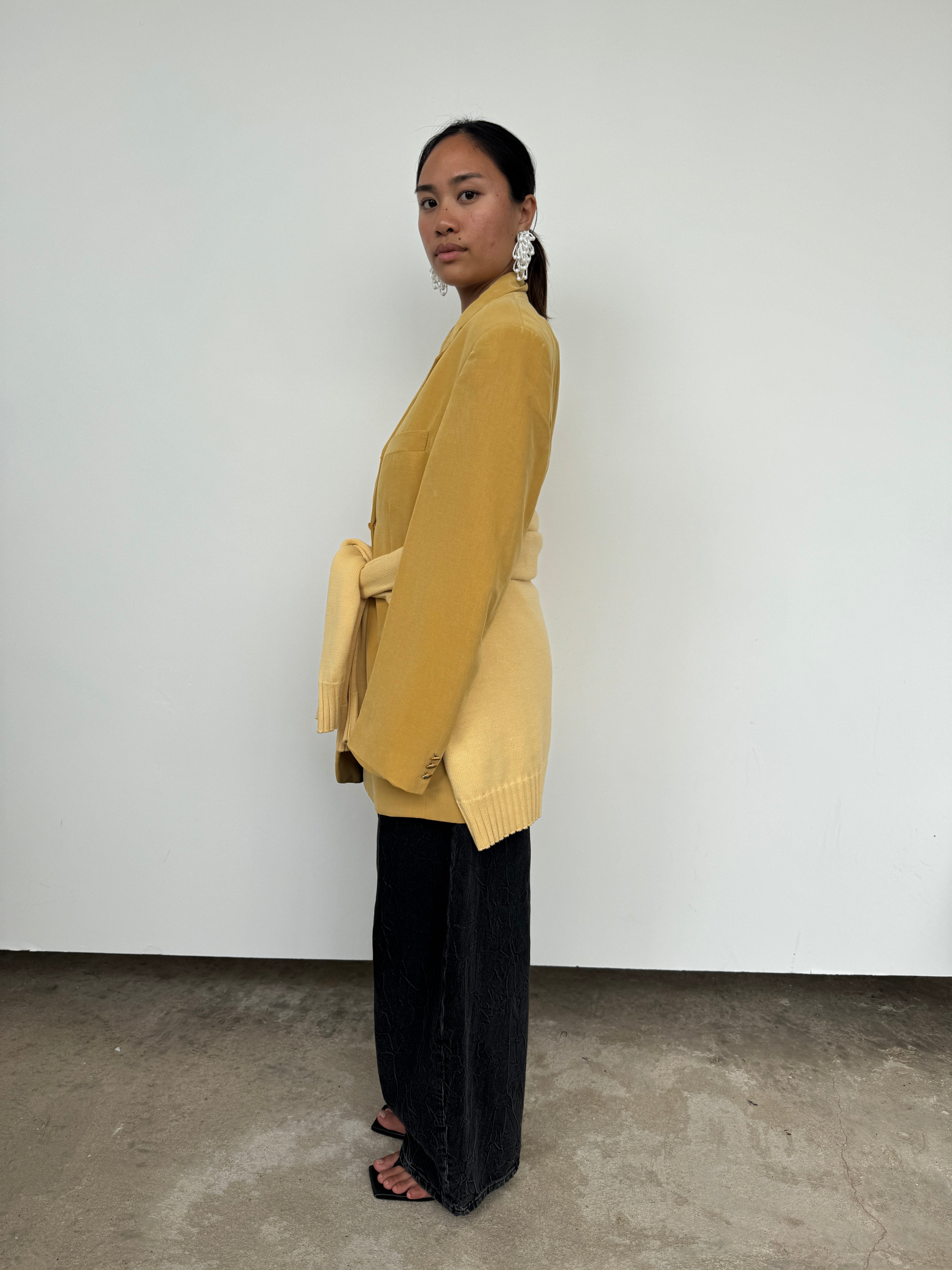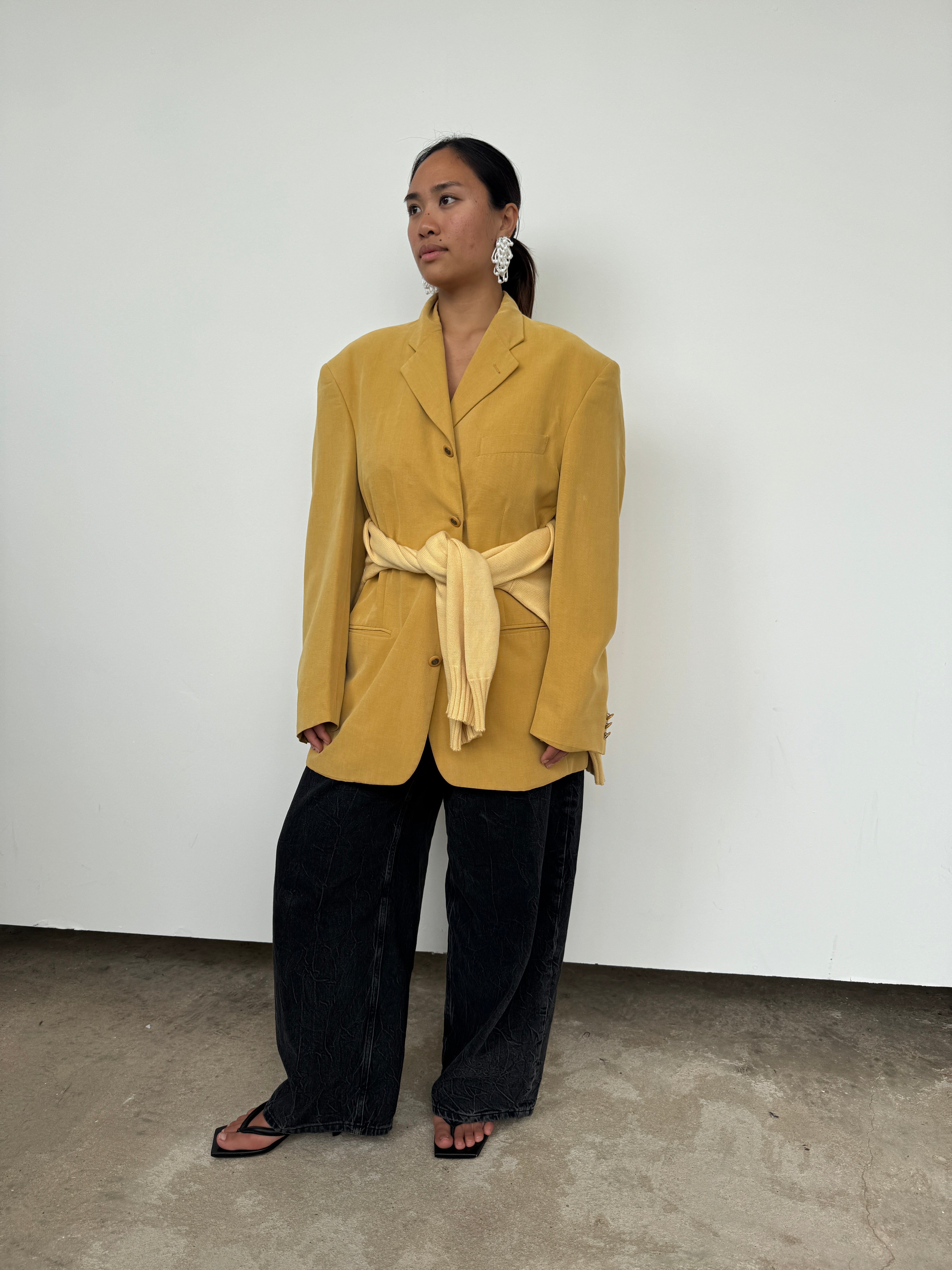 We have added a popper to this piece so that the blazer can be fastened to cinch the waist if desired. This creates a beautiful shape to the piece.