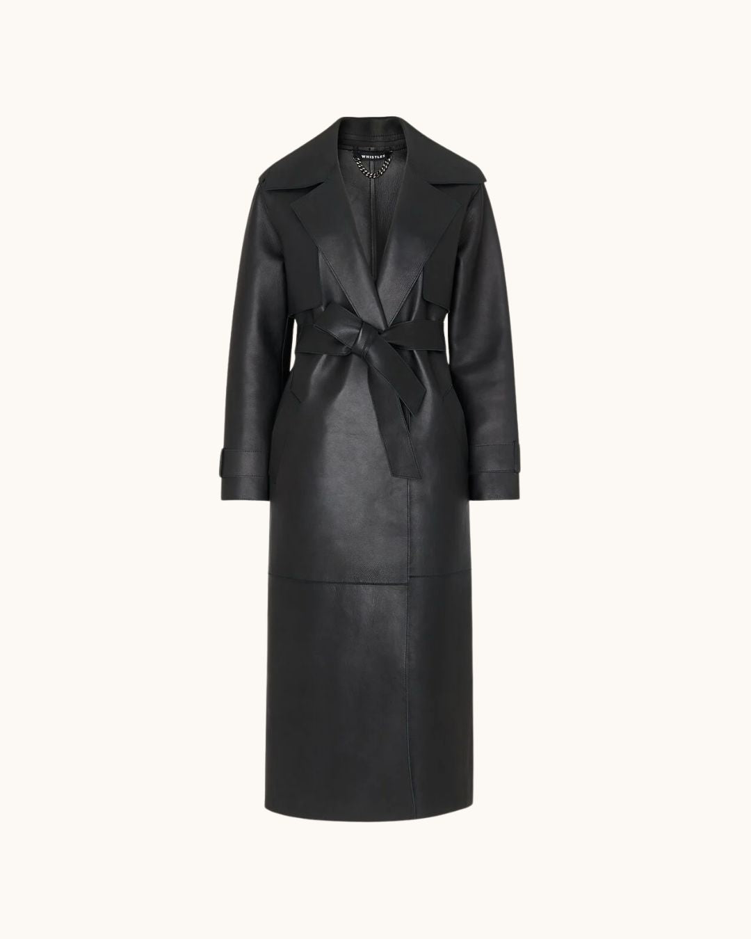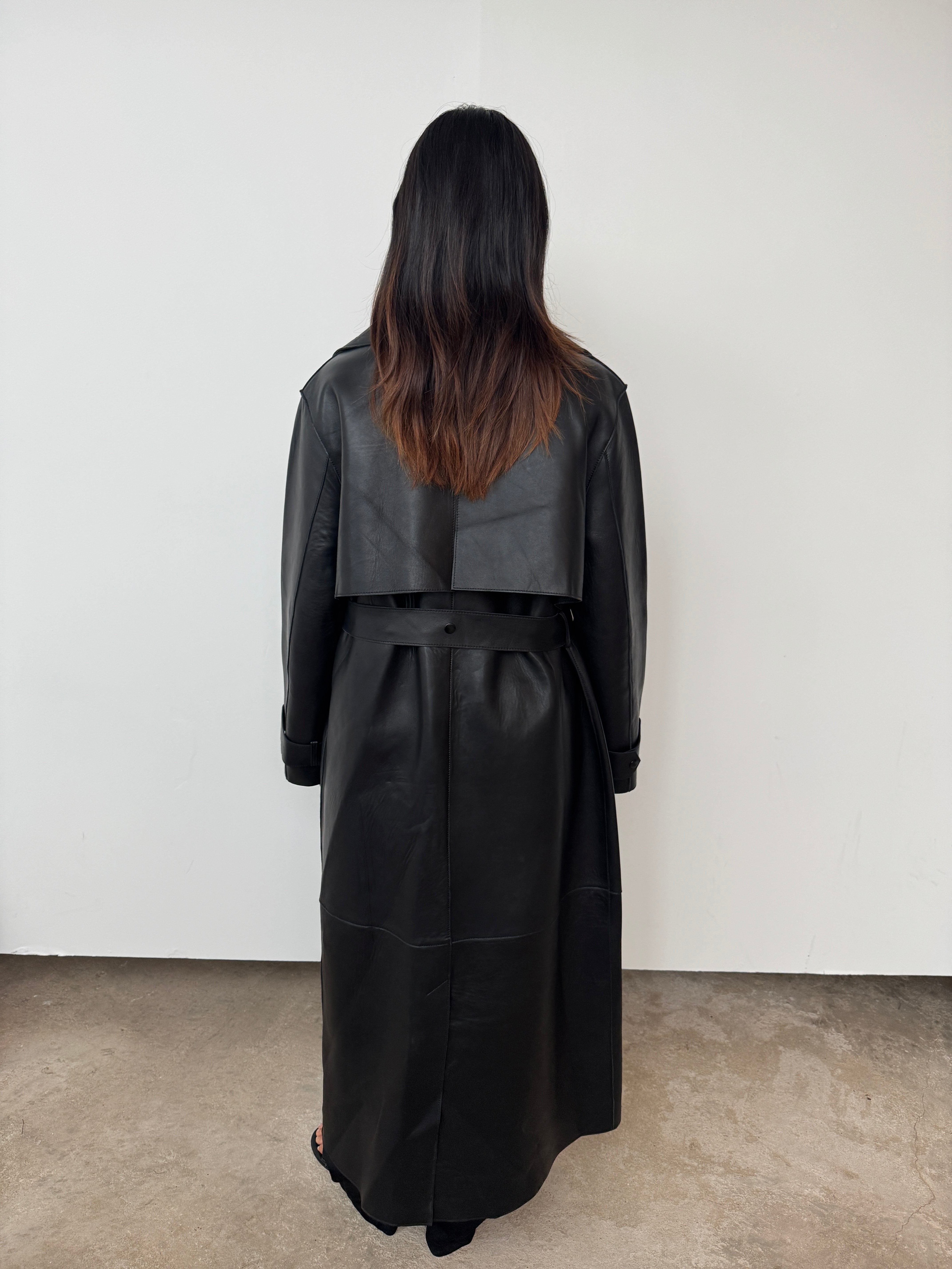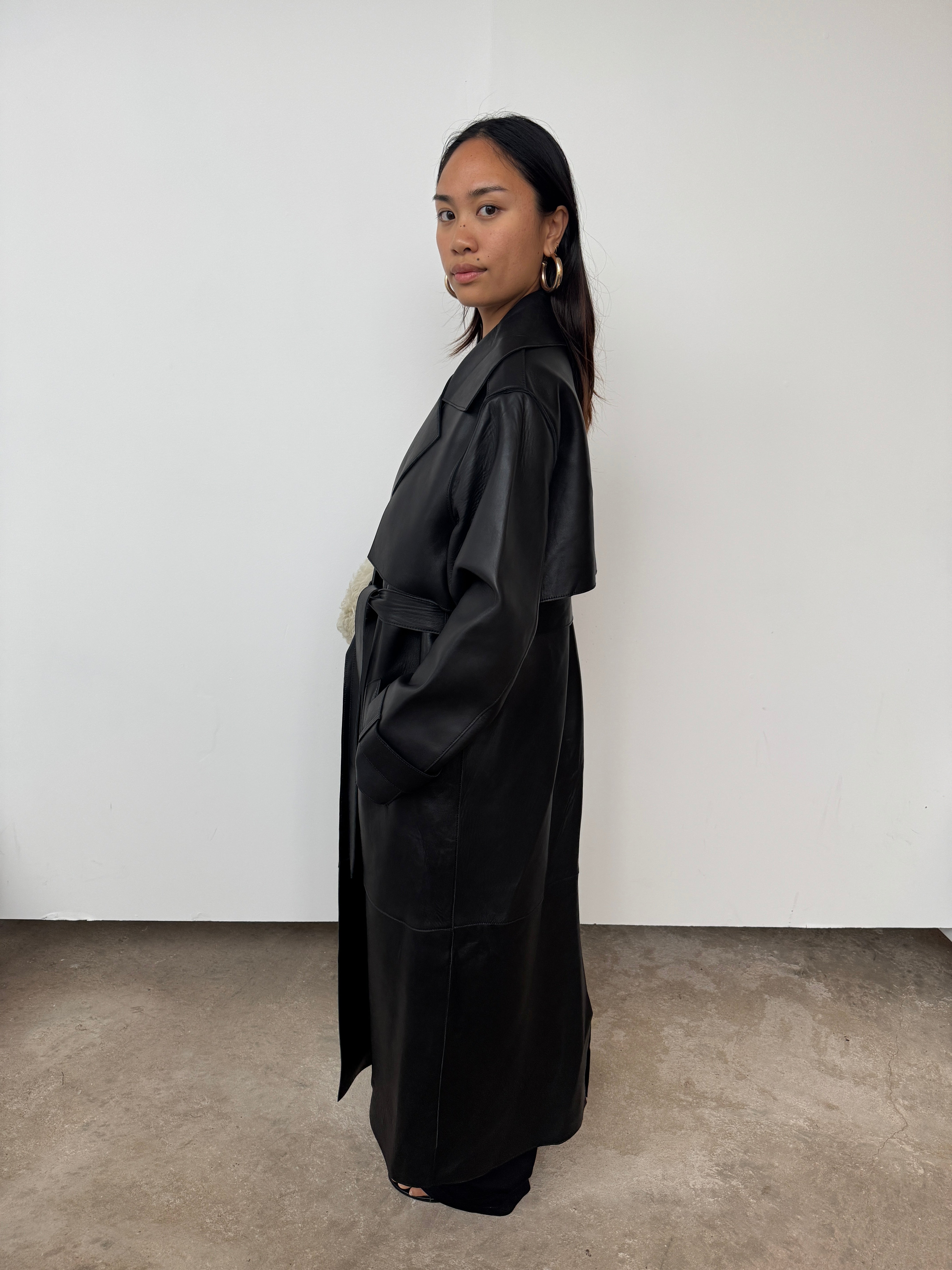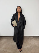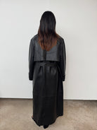 Expertly crafted from soft black leather, this style is cut to a midi silhouette. See its exaggerated lapel, oversized pockets, double-breasted, and wrap-tie fastening—a luxurious design that promises enduring style for the years to come.