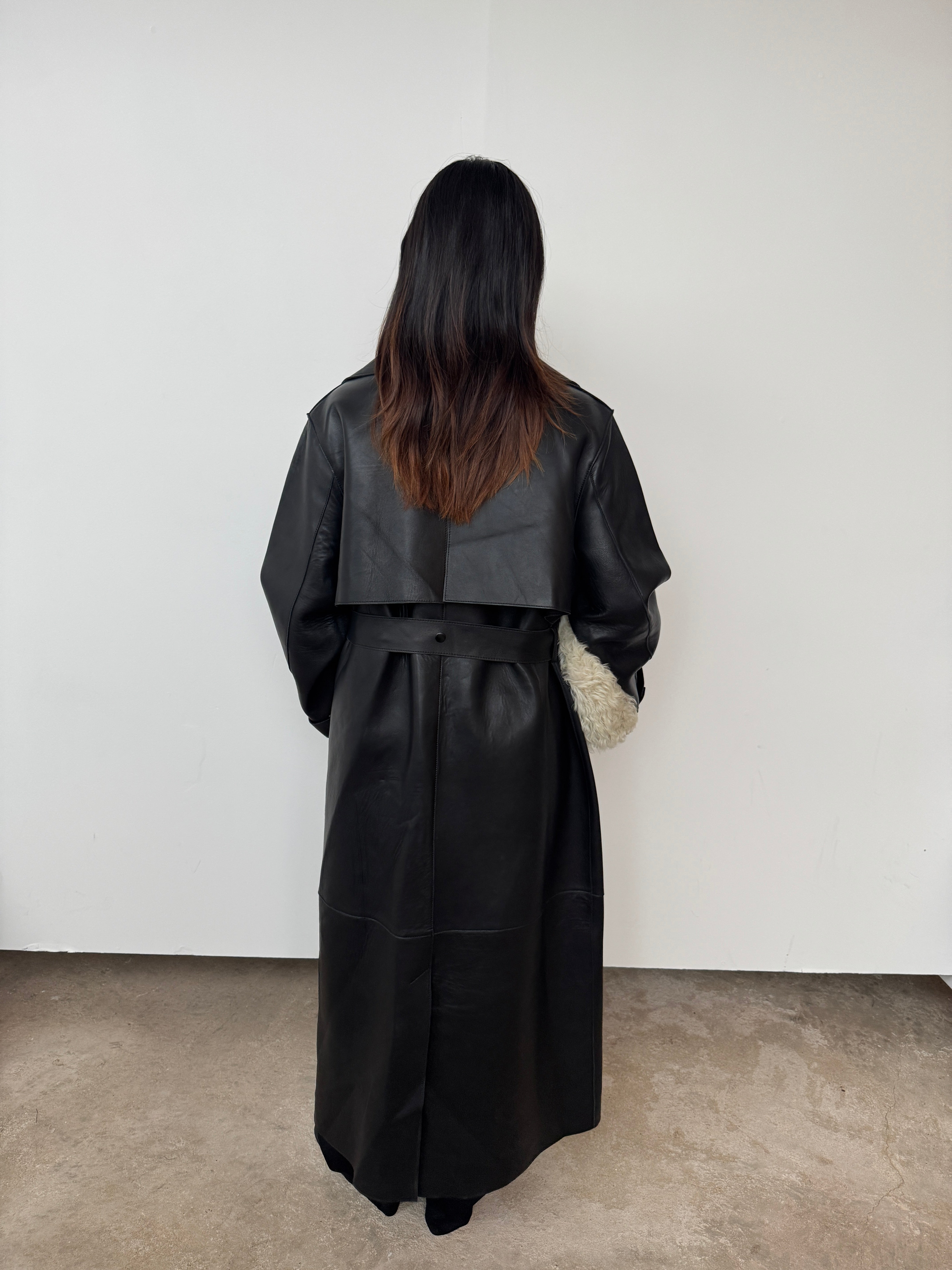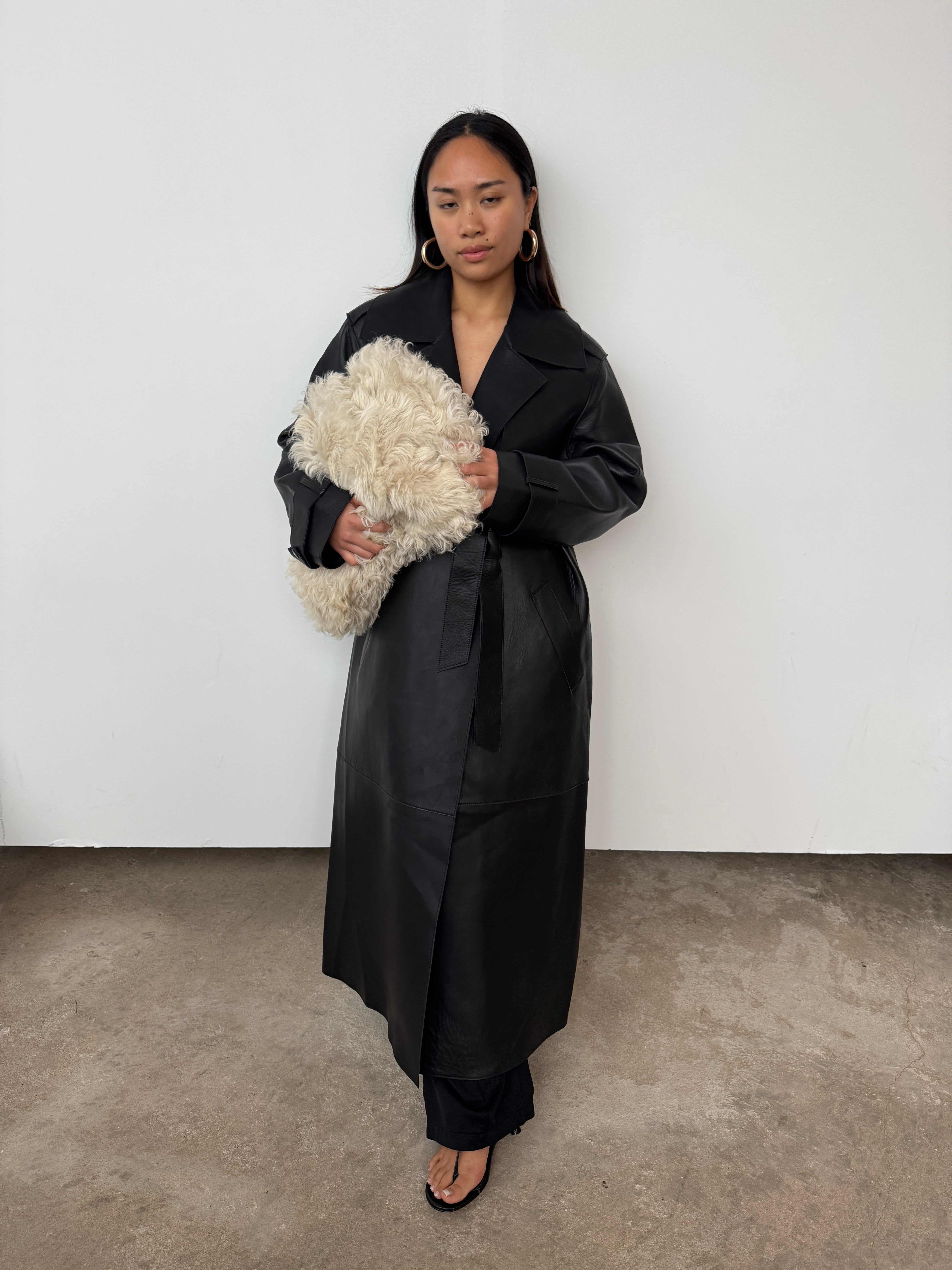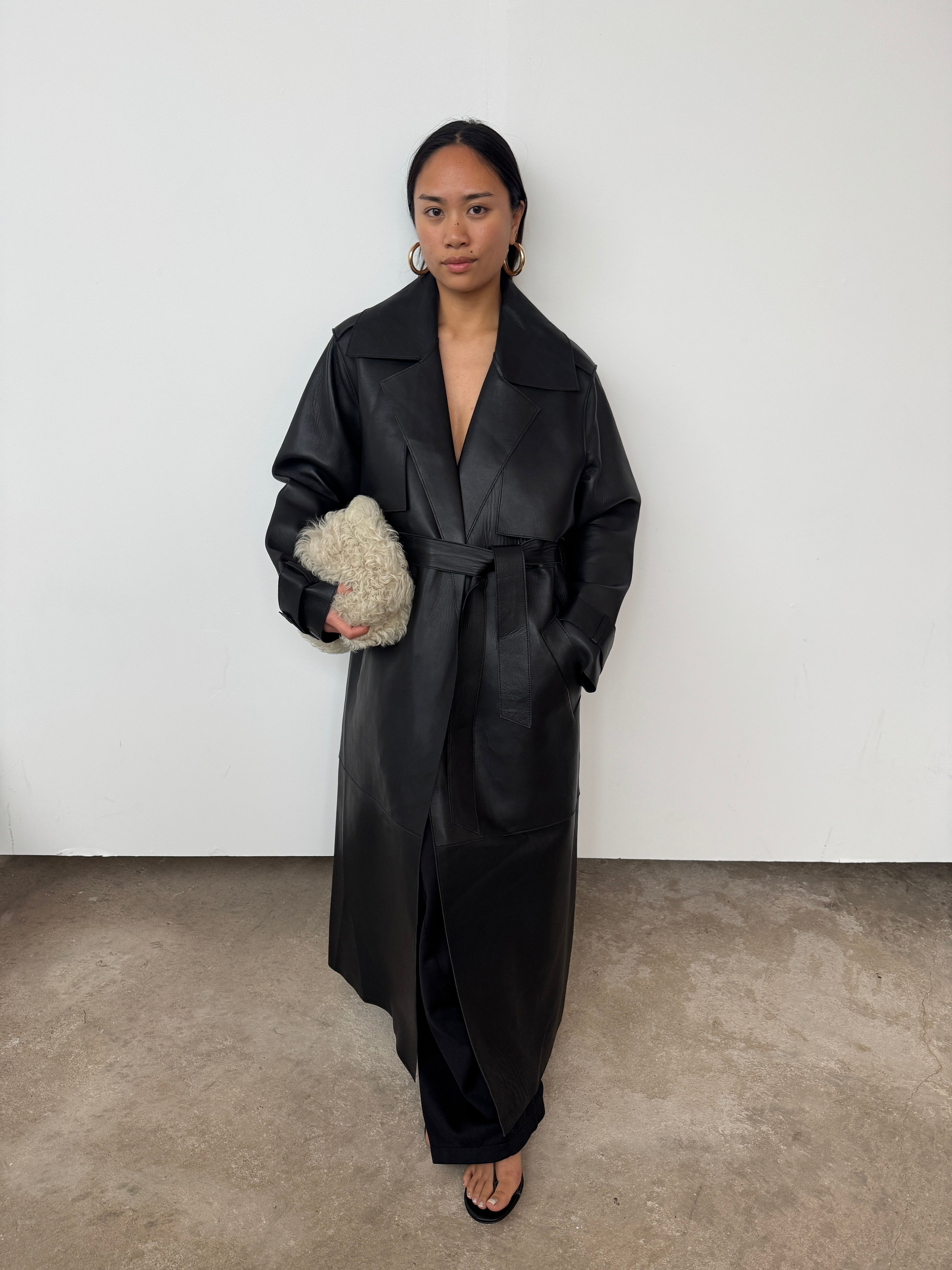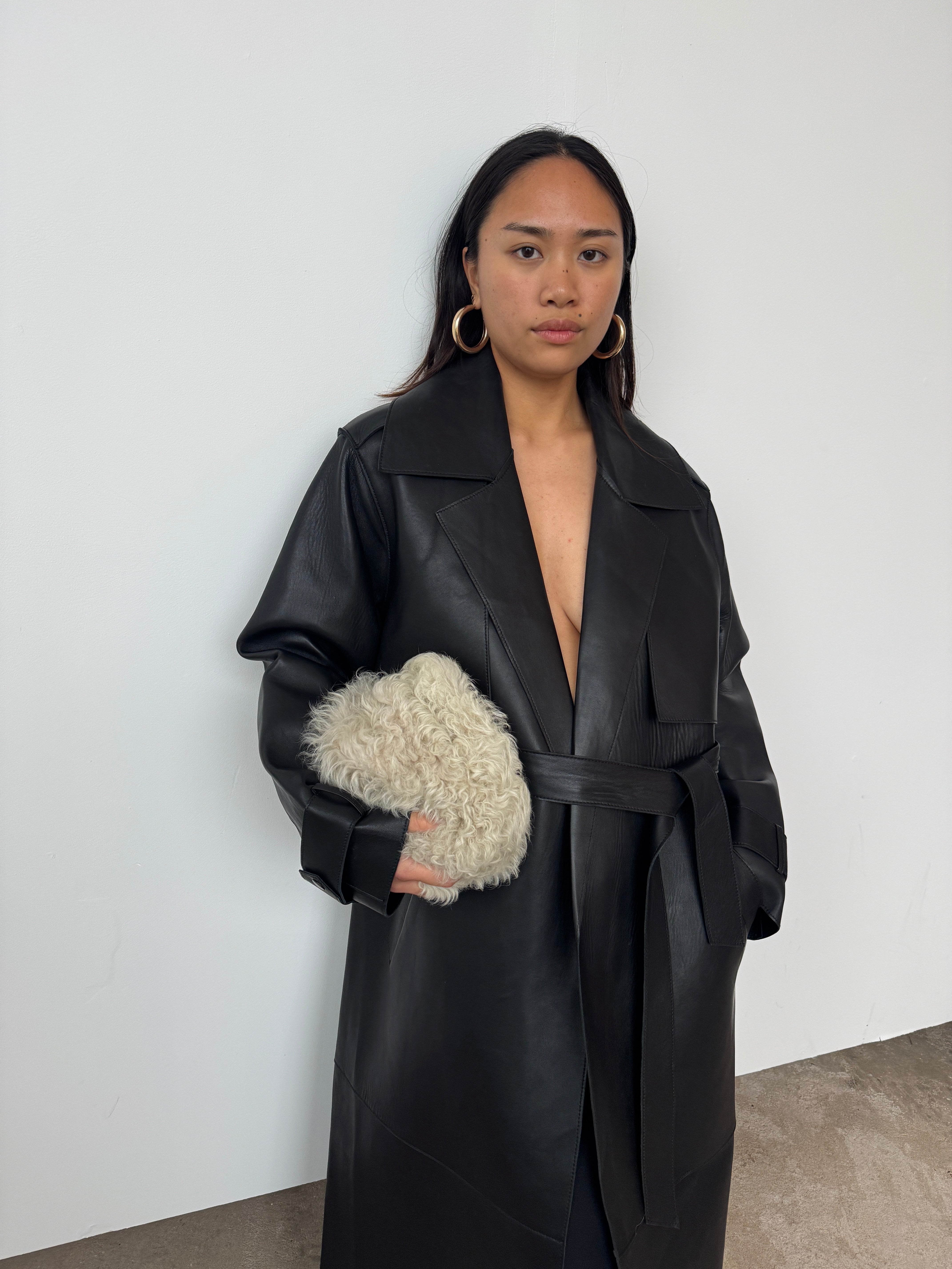 Expertly crafted from soft black leather, this style is cut to a midi silhouette. See its exaggerated lapel, oversized pockets, double-breasted, and wrap-tie fastening—a luxurious design that promises enduring style for the years to come.