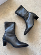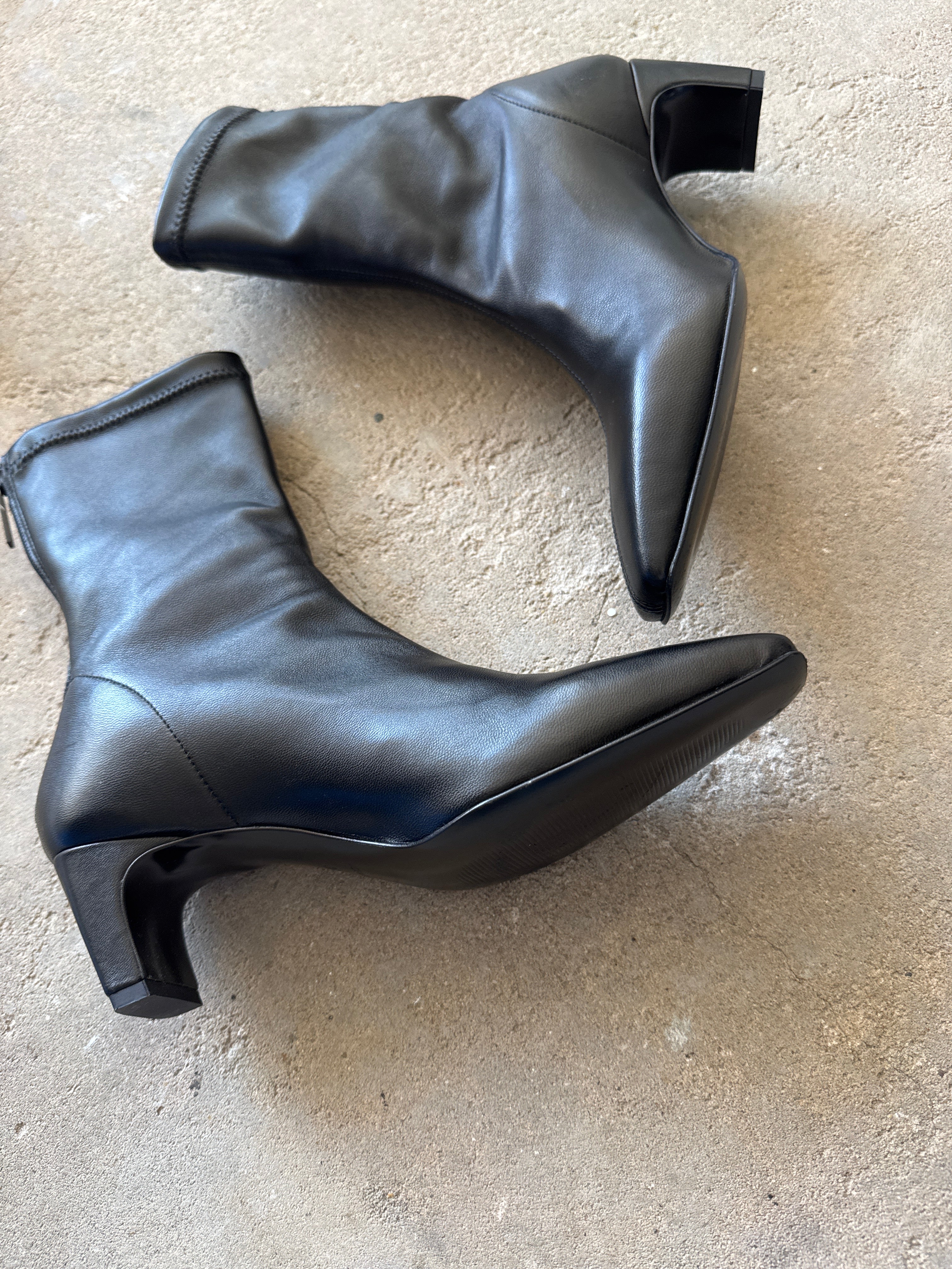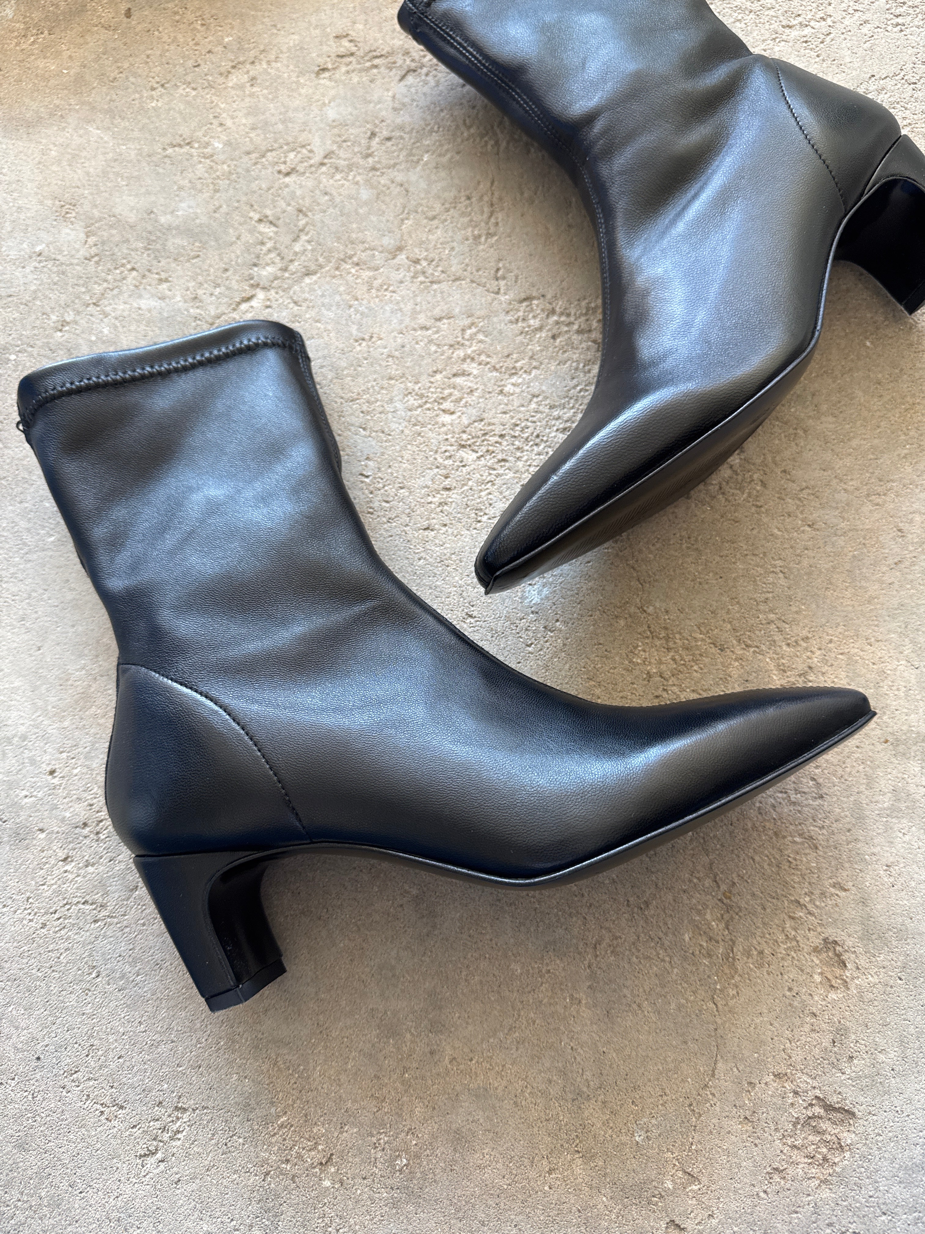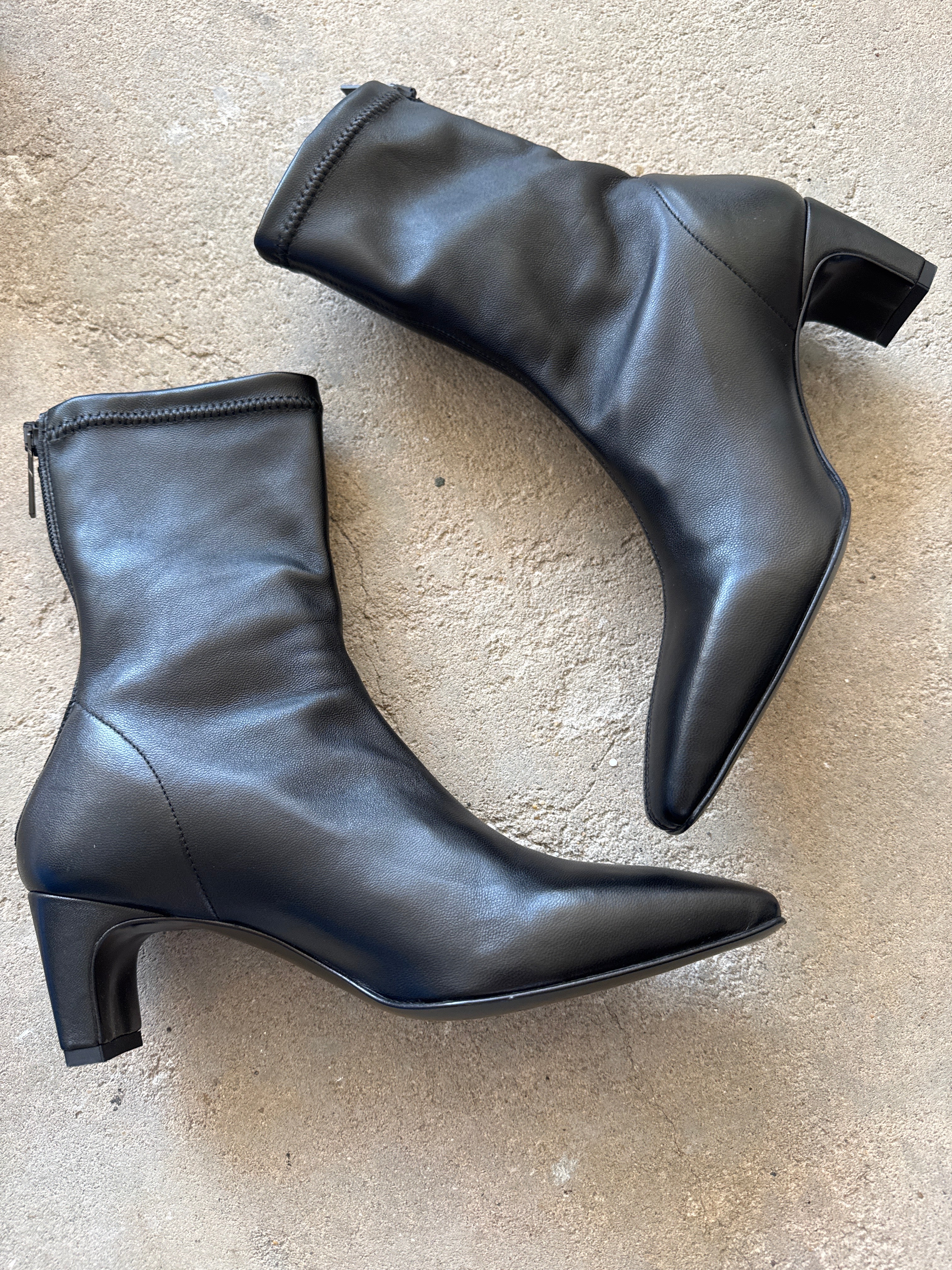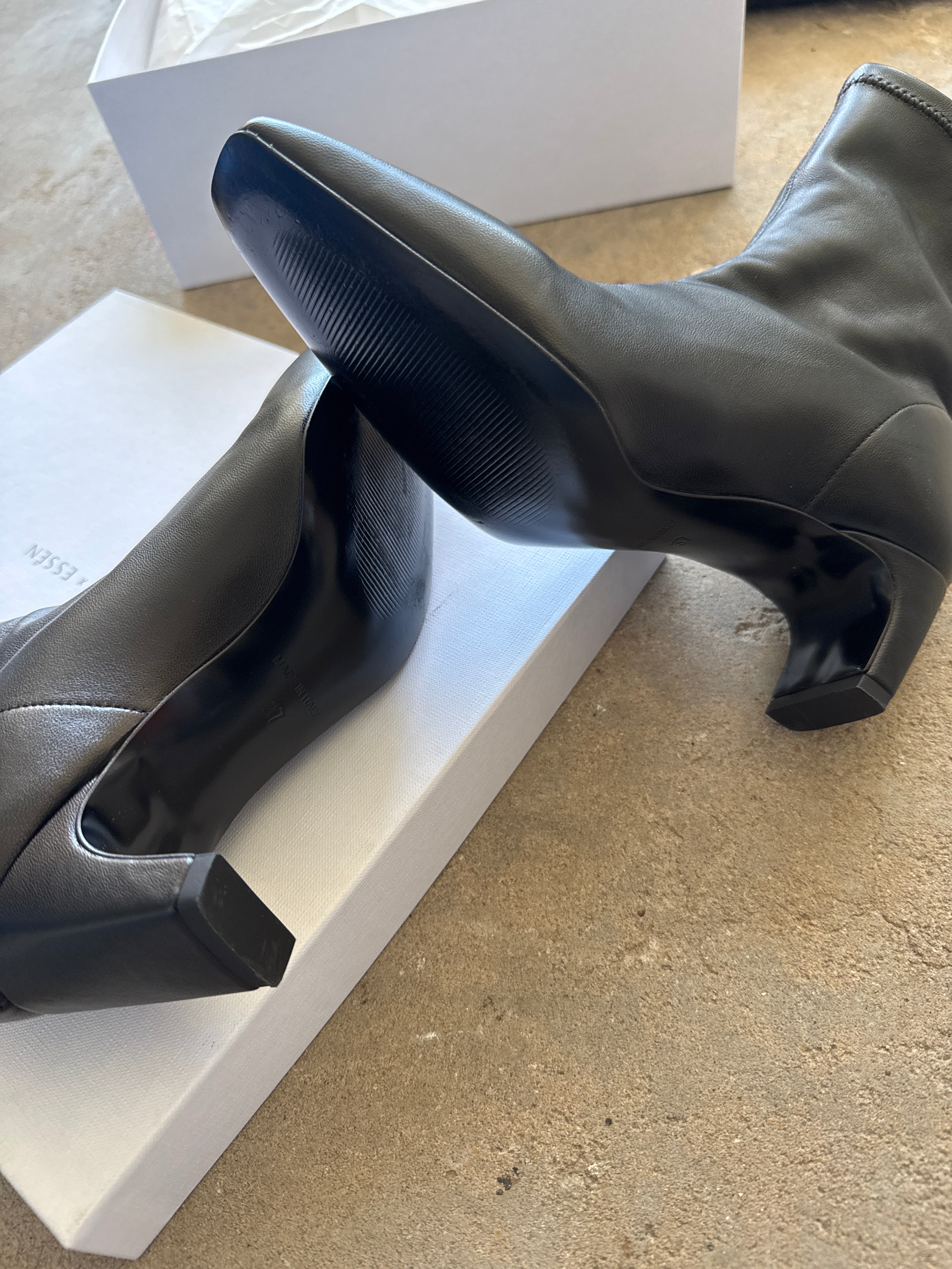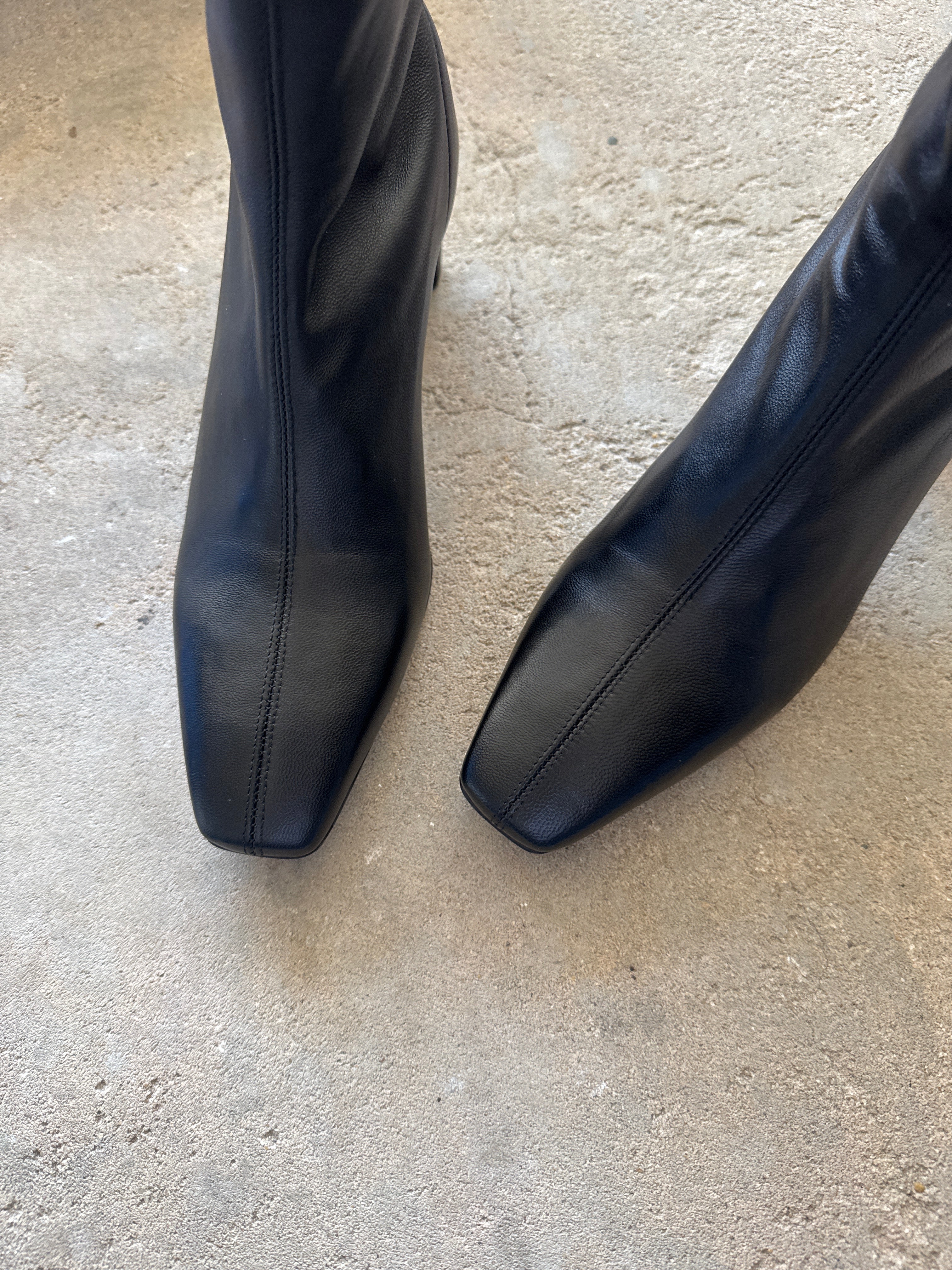 The Whistles x ESSEN collection is a celebration of craftsmanship, quality and longevity. The Glove Boot is handcrafted in Italy using premium, stretch nappa leather in a classic black. Subtle, thoughtful detailing includes a central seam that runs from top to toe, a back zip fastening and a structured square toe.